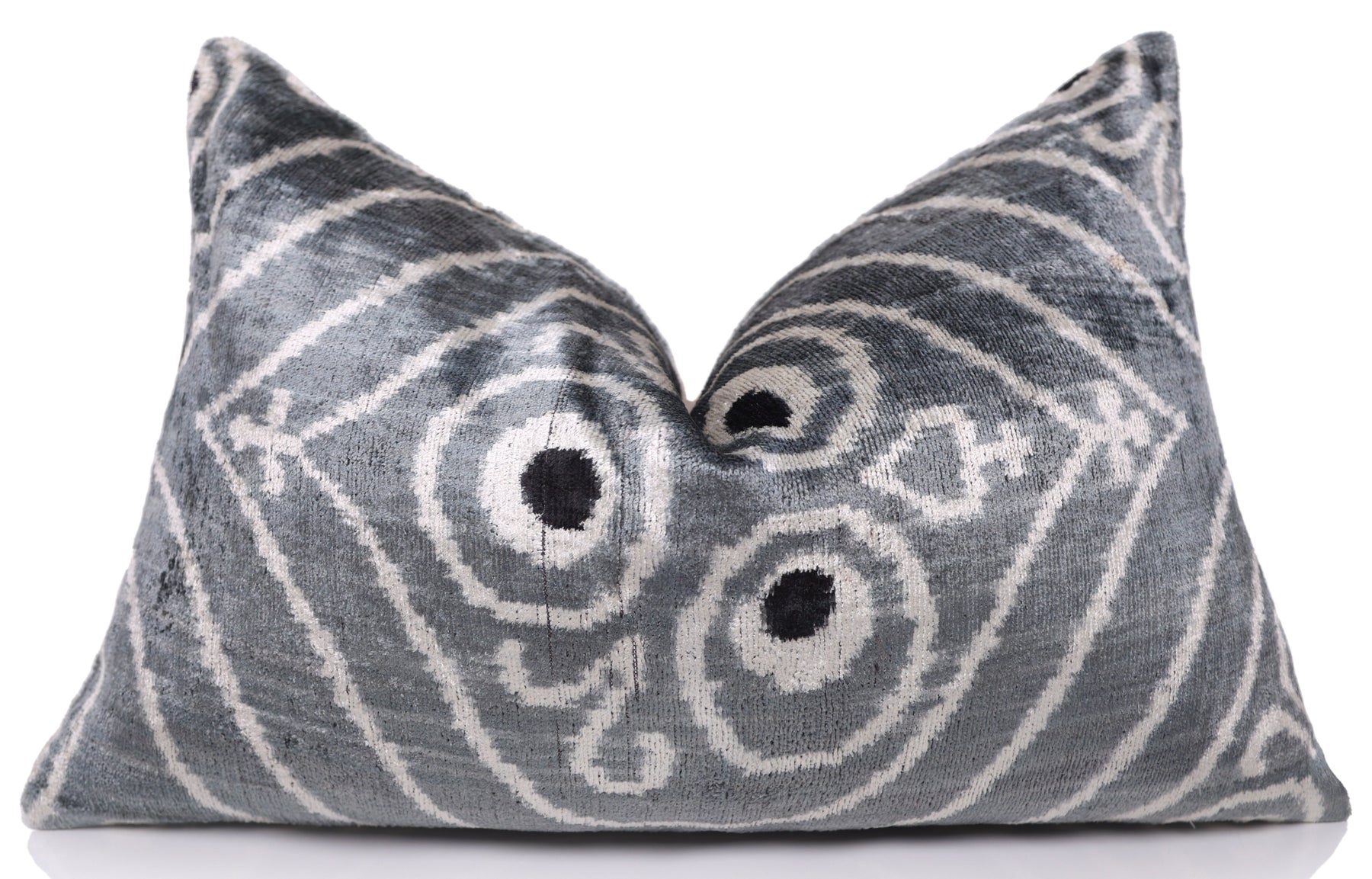 This silk velvet lumbar in smoky gray and ivory-white ikat embodies quiet sophistication. It adds depth to neutral interiors while maintaining a serene, polished aesthetic. Perfect for California Casual, Modern Classic, or Scandinavian-inspired rooms. Pair it with ivory or charcoal upholstery, oak or walnut tones, and brushed nickel or matte black accents for balance. Its reflective velvet pile softly shifts with the light—luxury in every detail.