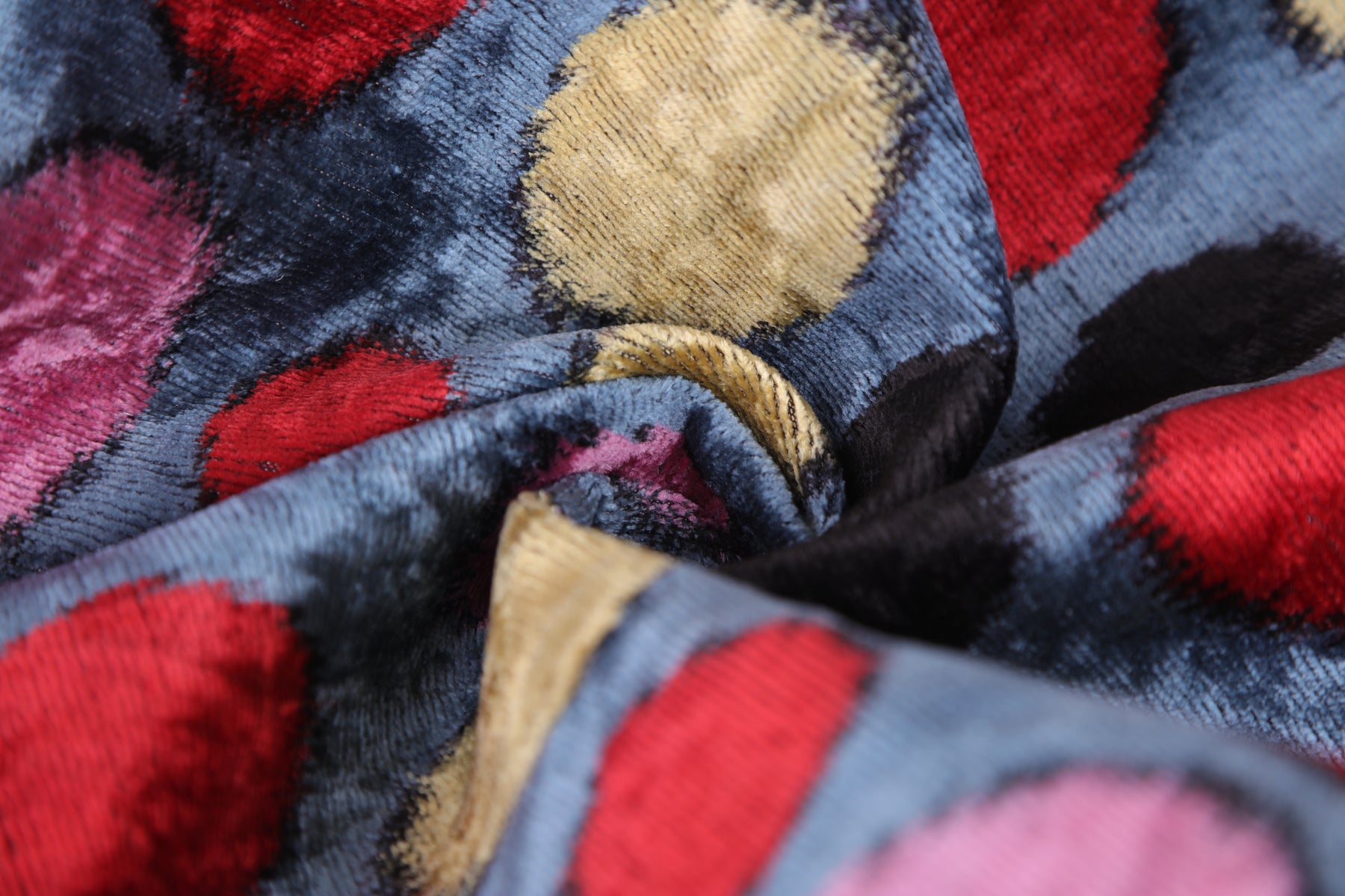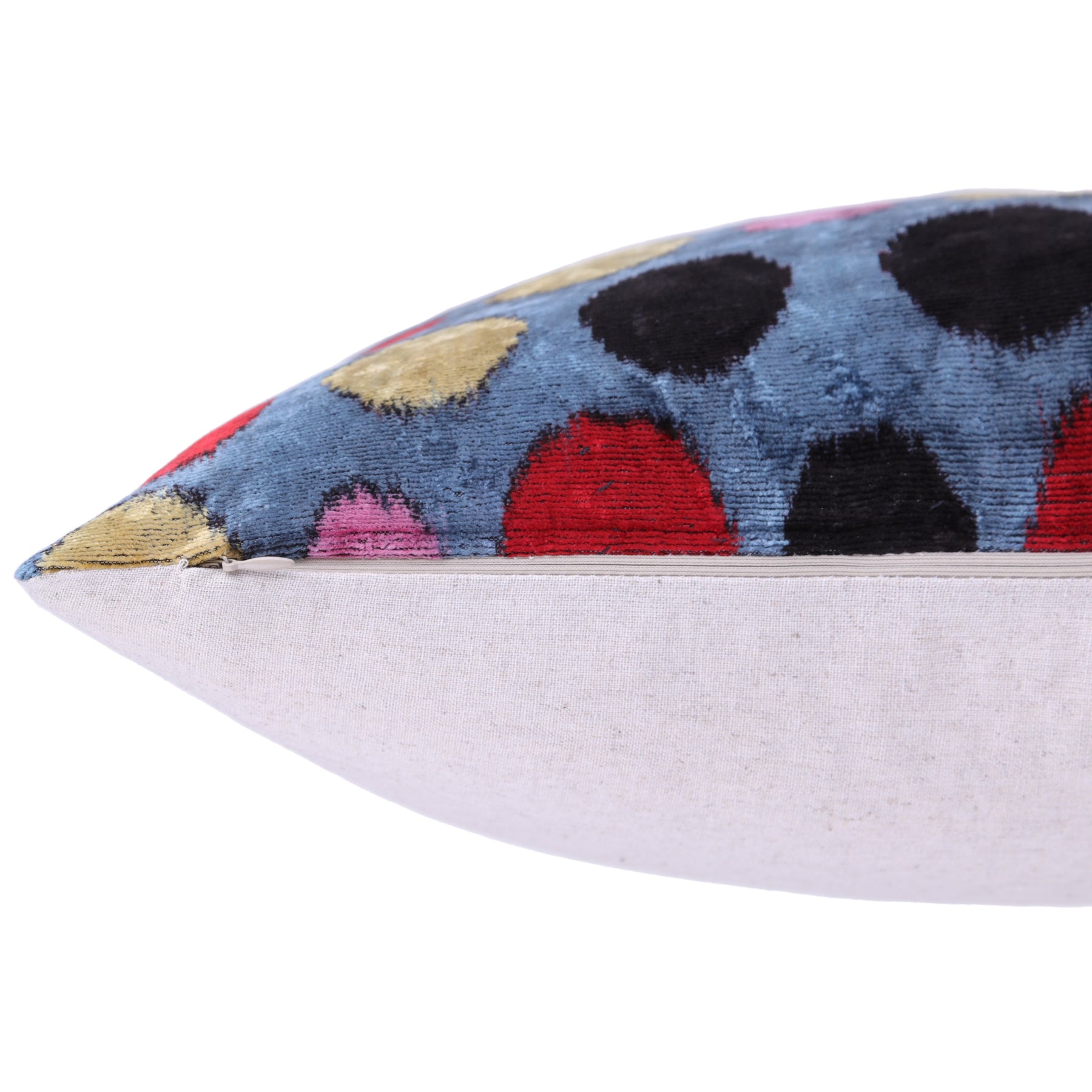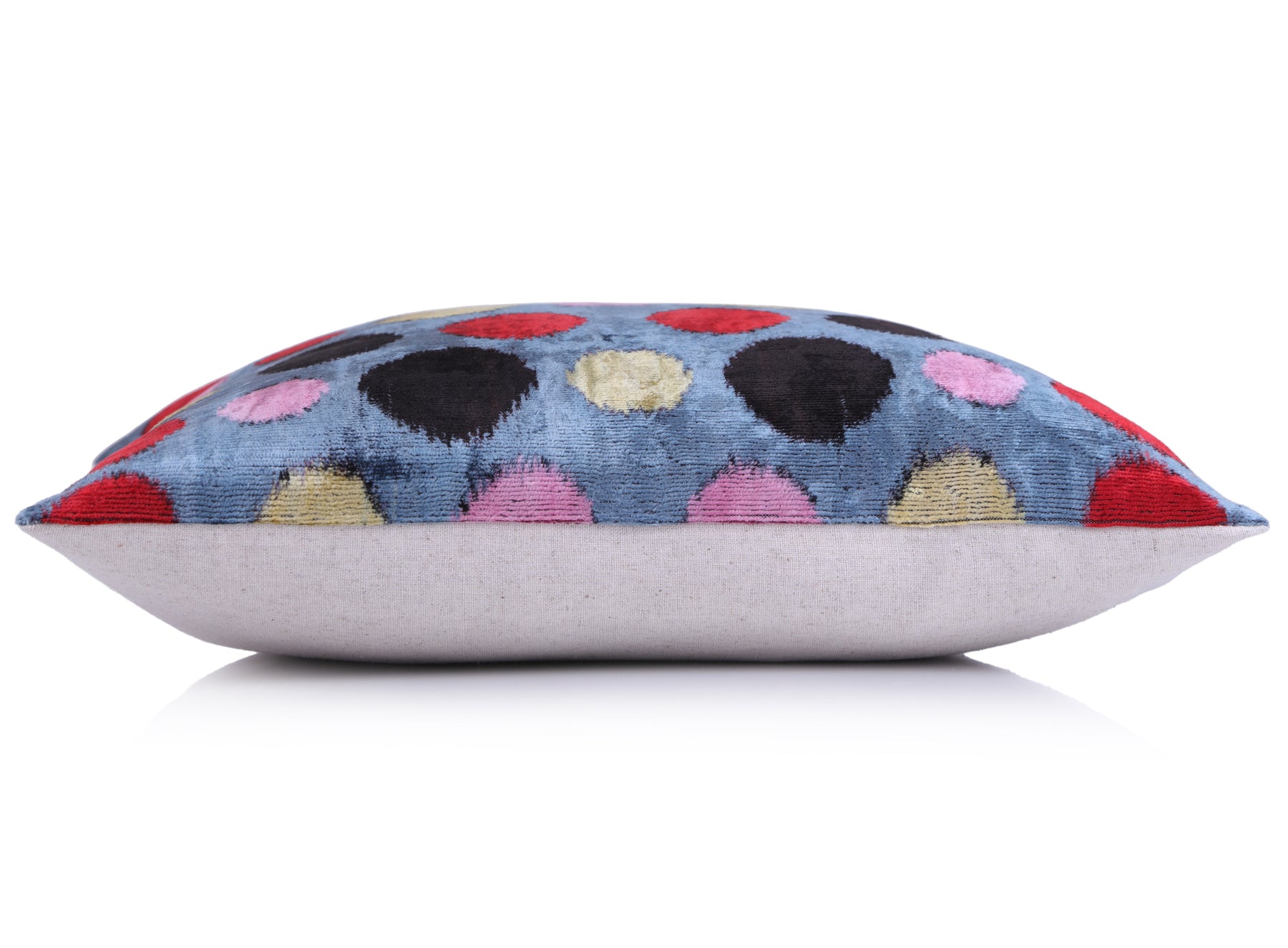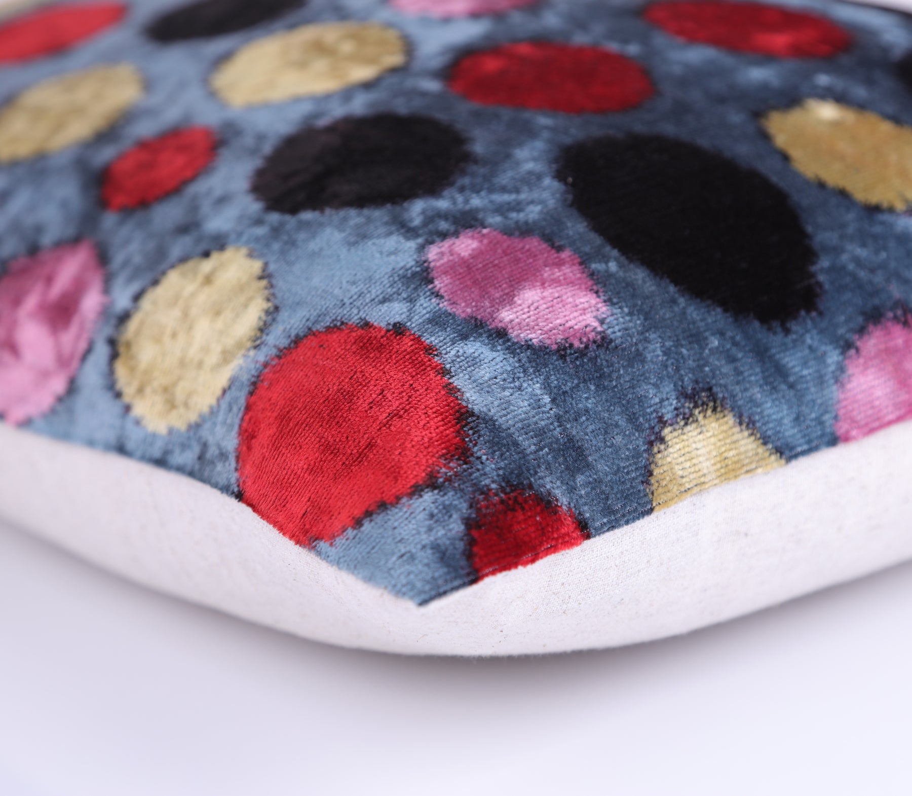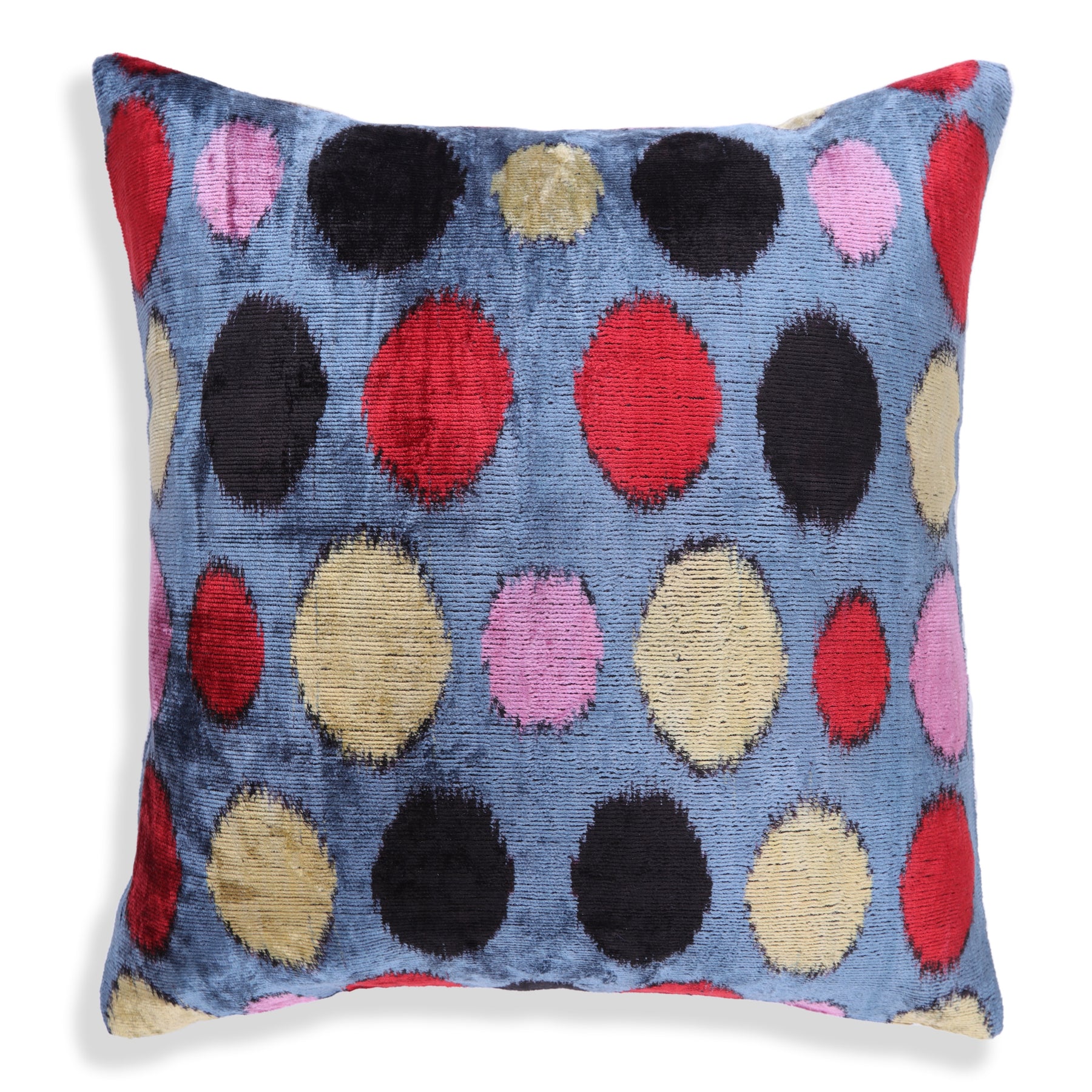 Add a burst of artistic energy to your space with this luxurious 16x16 inch handmade velvet pillow. Crafted in our California atelier from traditional silk velvet sourced from Turkey and Uzbekistan, it showcases a multicolor polka dot pattern—featuring tones of red, gold, pink, and black on a cool blue base.