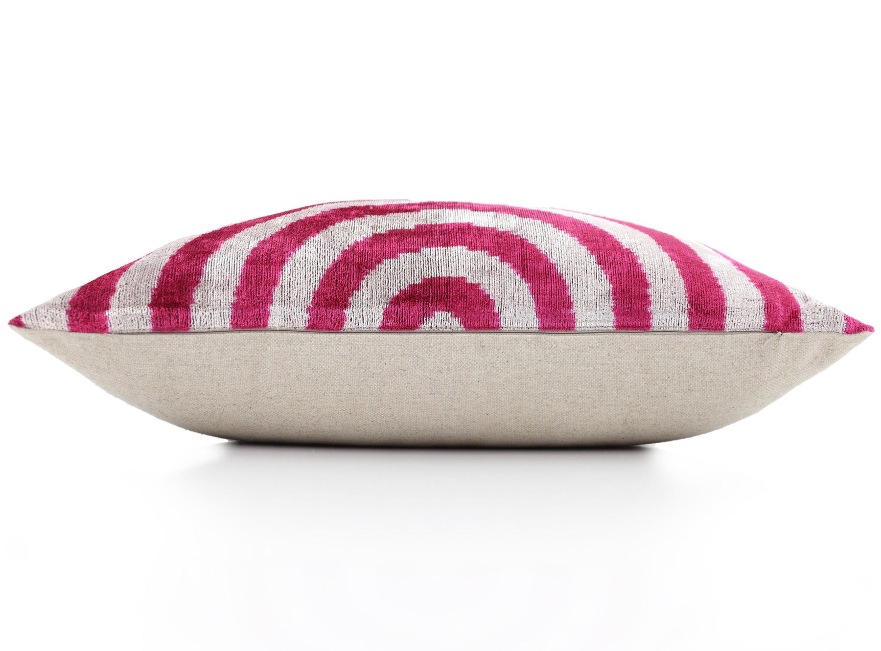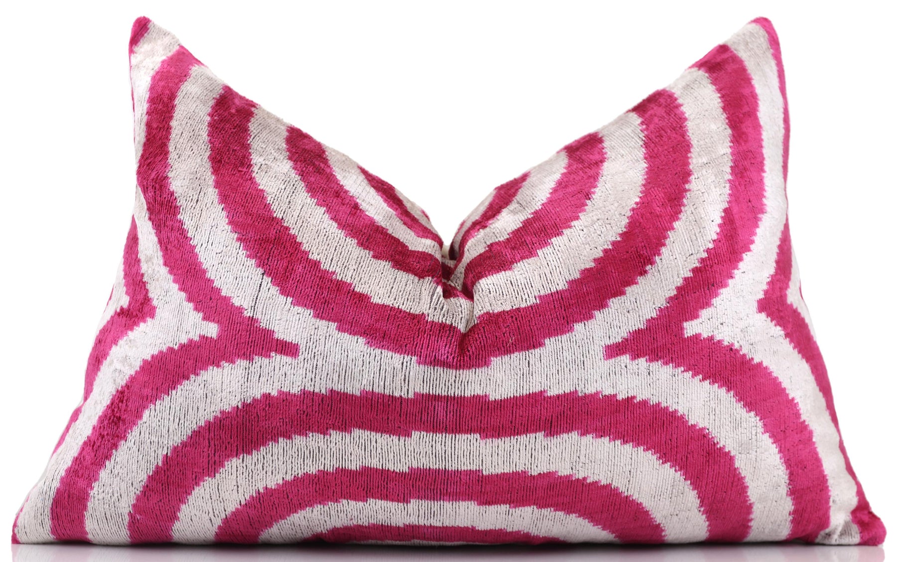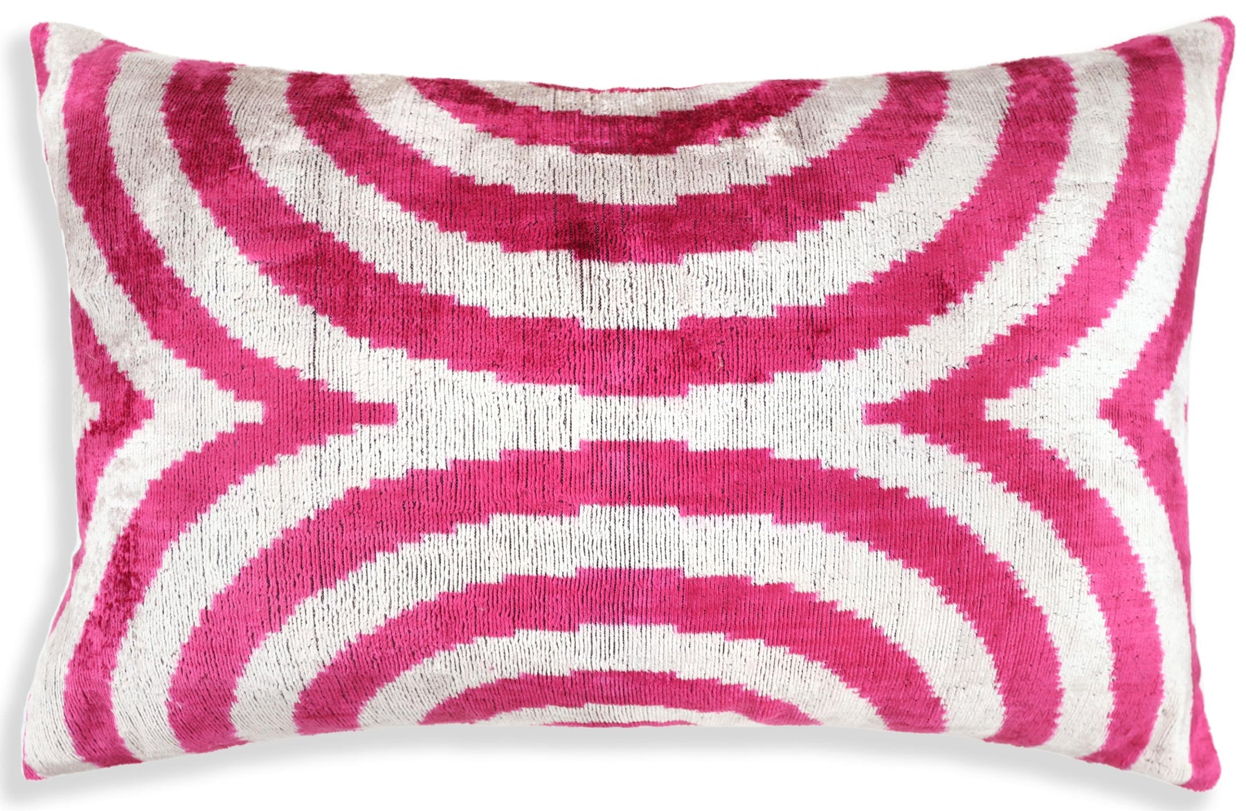 Add bold energy and contemporary flair to your interiors with this 16x24 silk velvet lumbar pillow. The fuchsia and ivory concentric arc pattern creates a striking geometric statement, blending traditional ikat weaving techniques with a modern artistic edge.