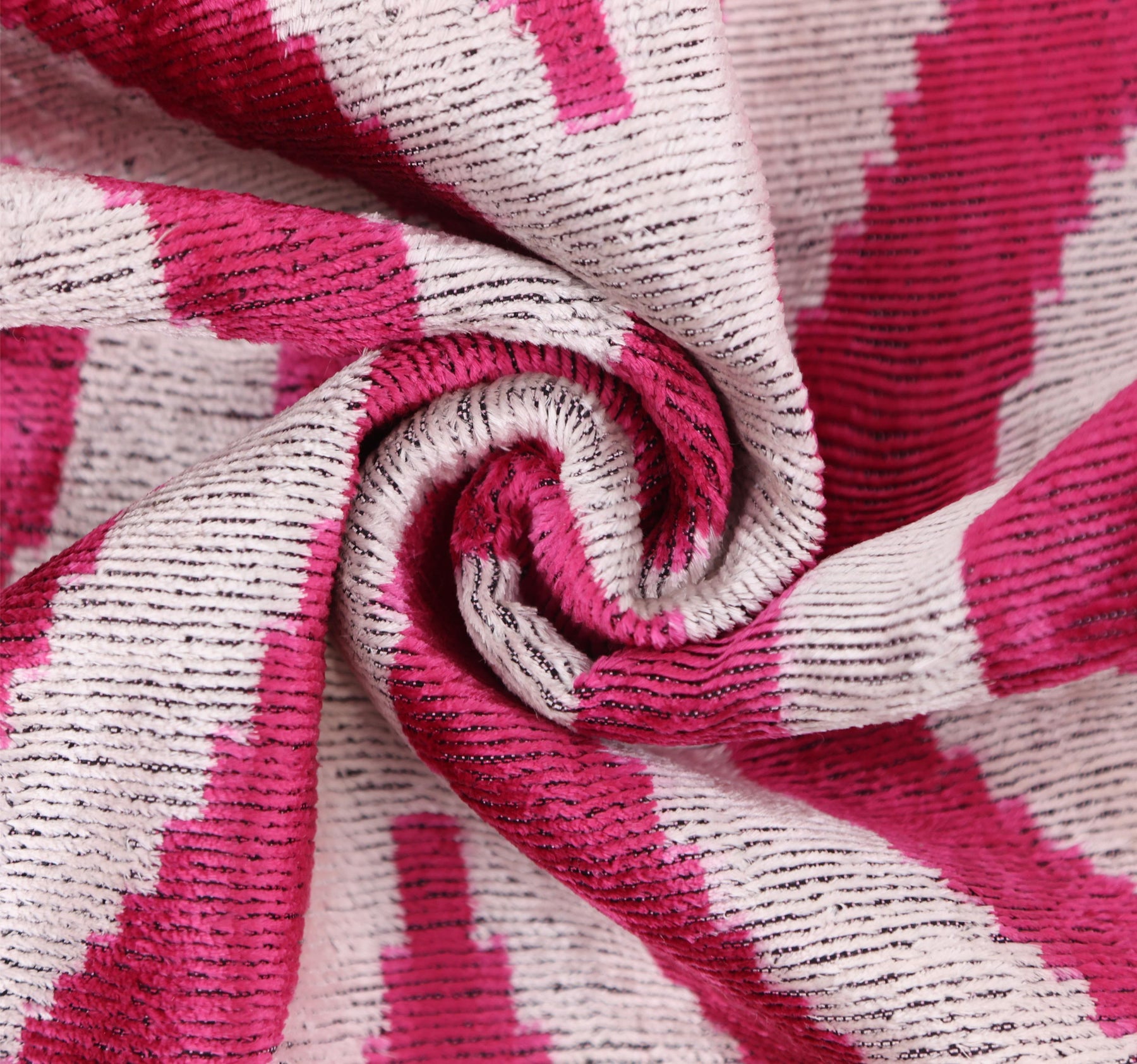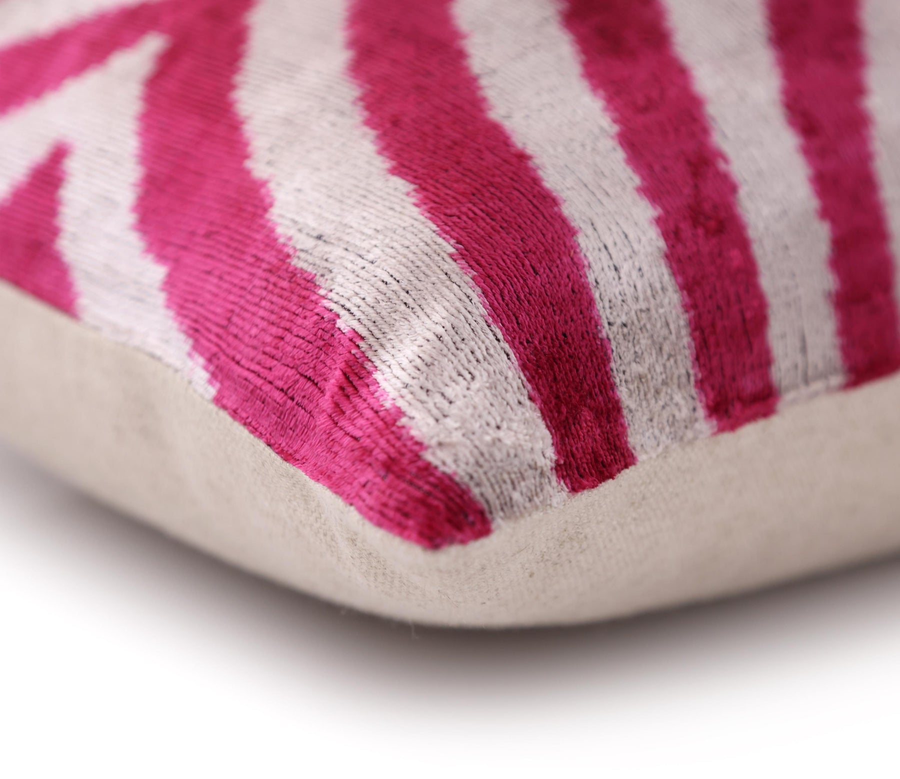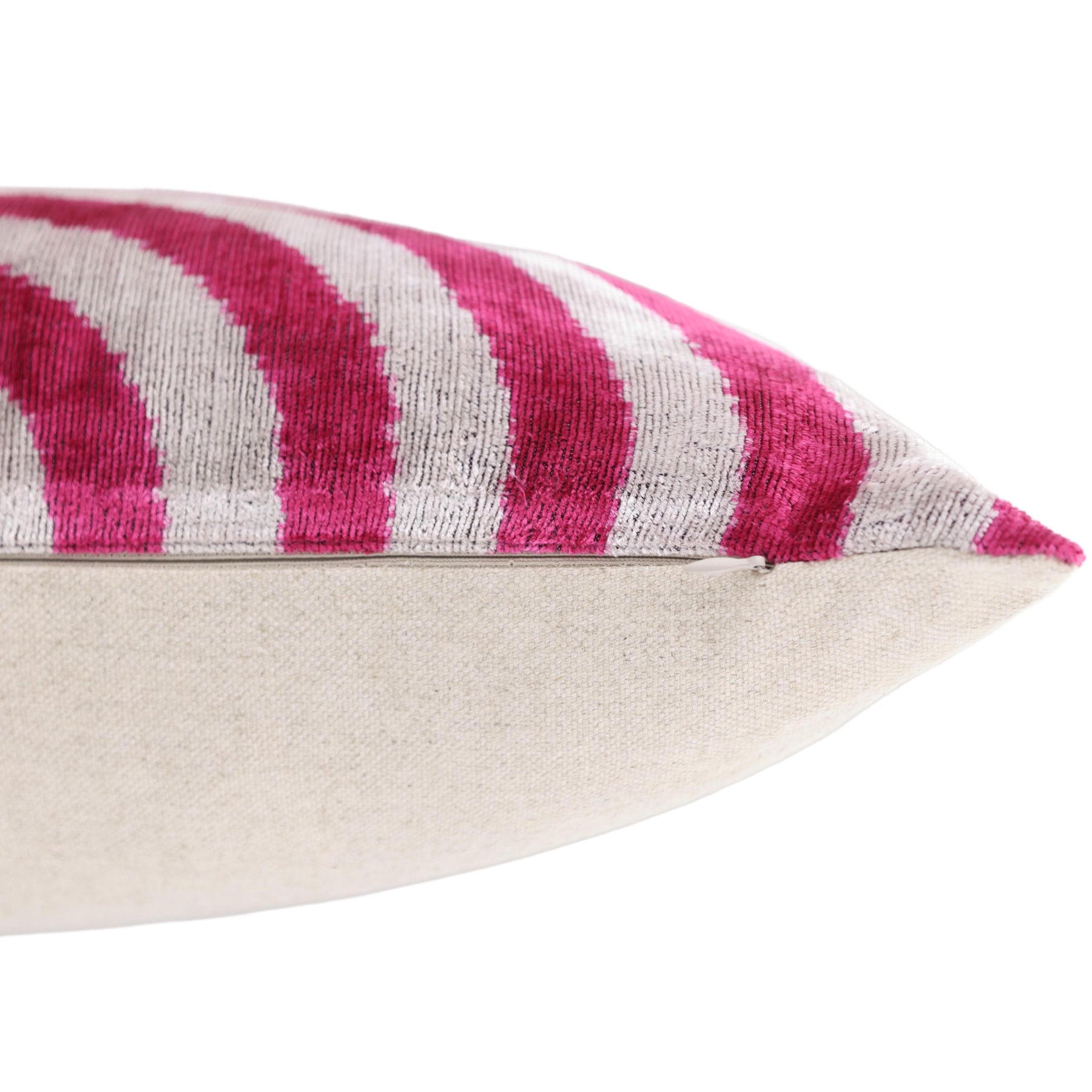 Add bold energy and contemporary flair to your interiors with this 16x24 silk velvet lumbar pillow. The fuchsia and ivory concentric arc pattern creates a striking geometric statement, blending traditional ikat weaving techniques with a modern artistic edge.