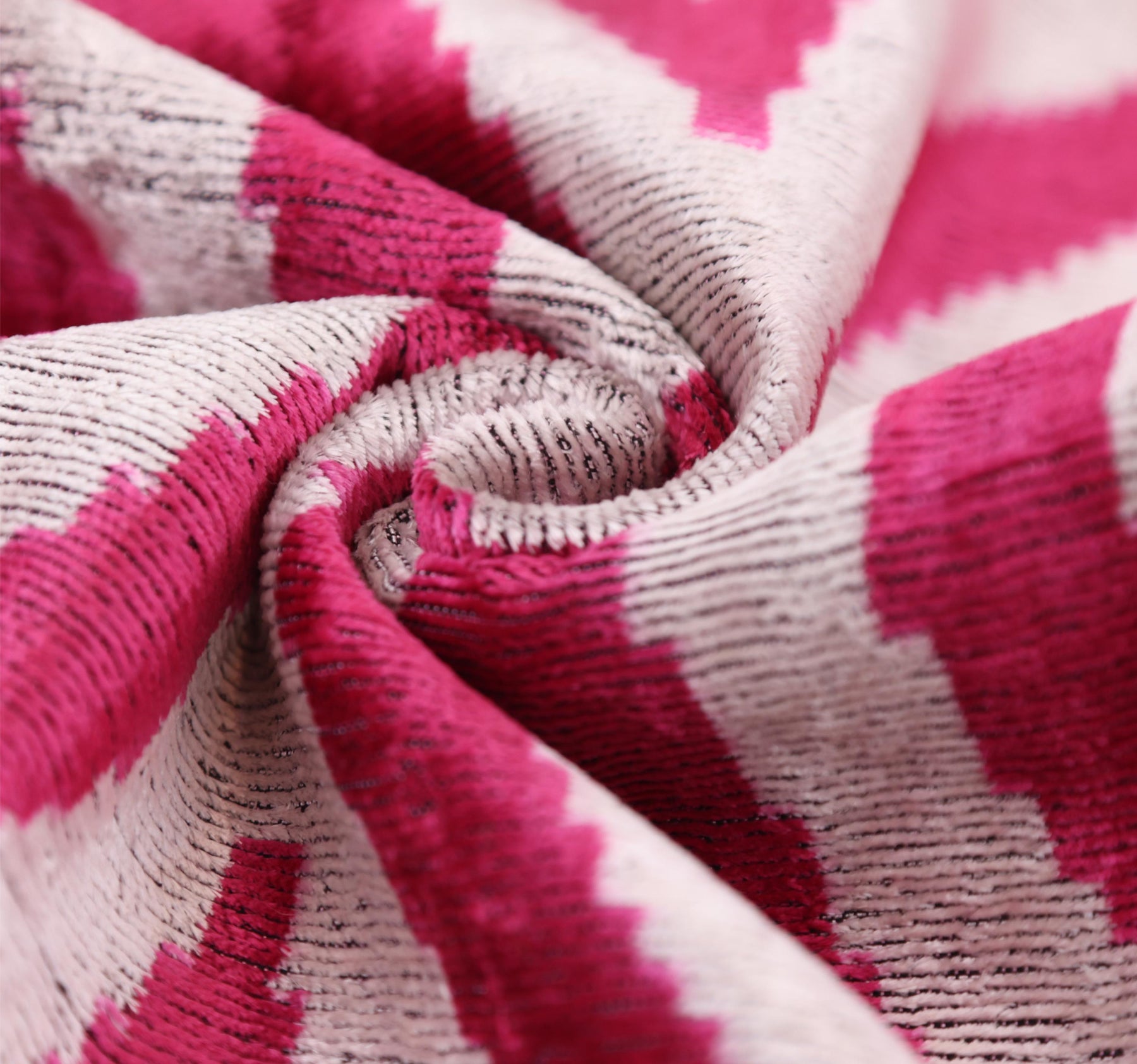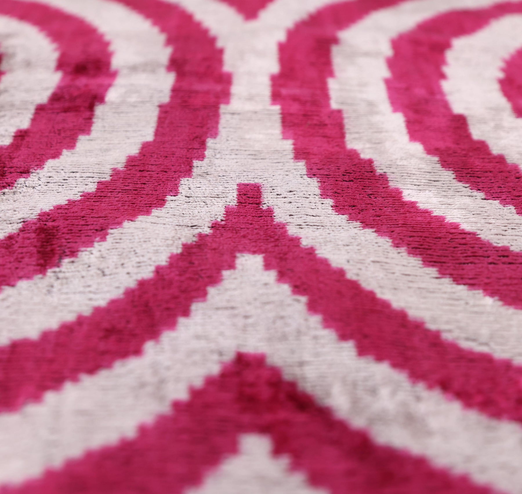 • Handwoven silk velvet featuring bold concentric fuchsia arcs on ivory ground
