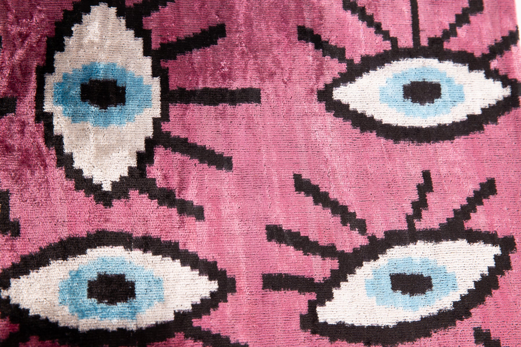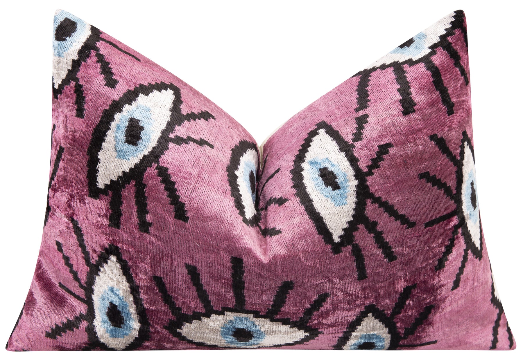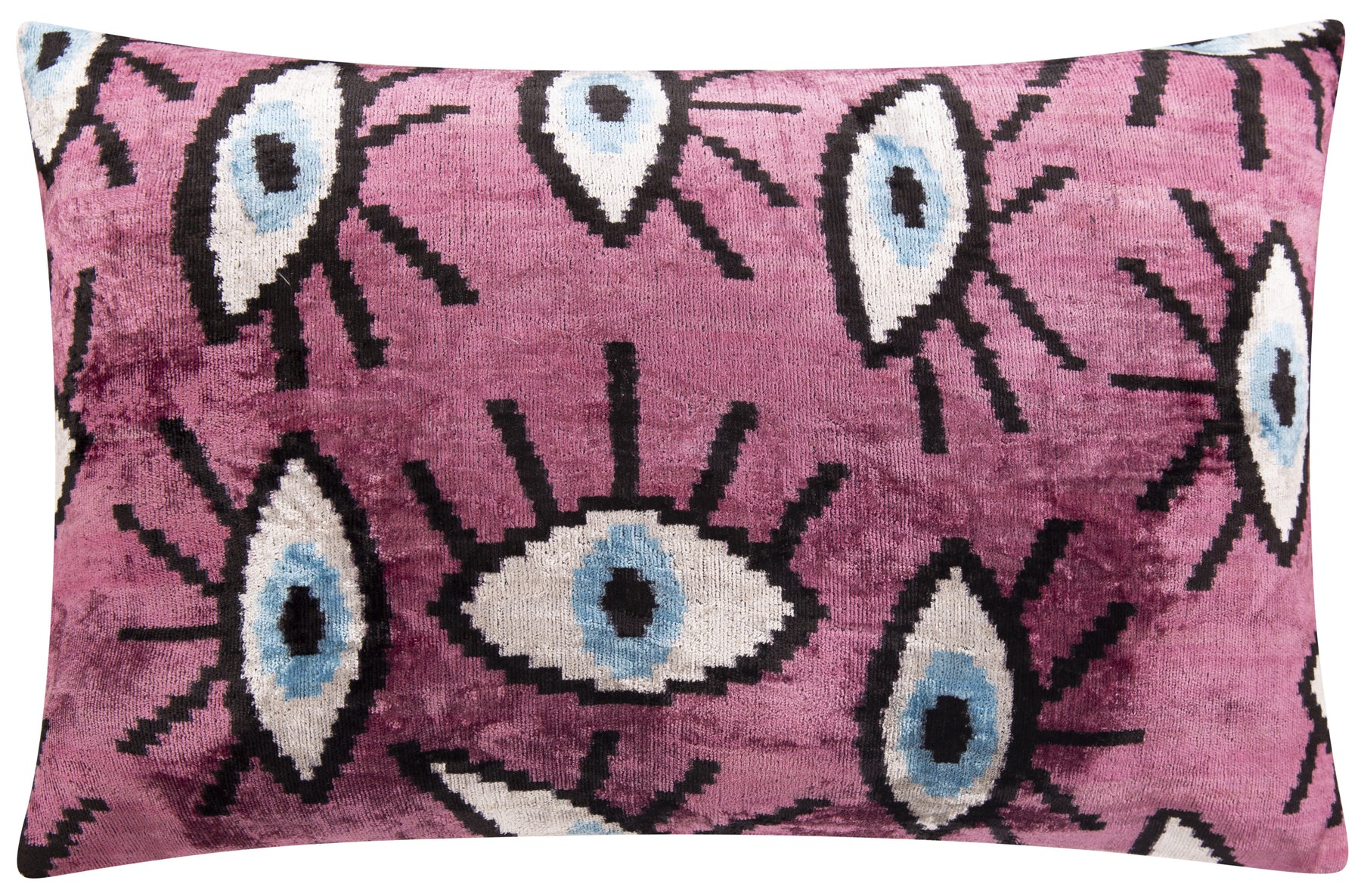 Elevate your living space with the Canvello Handmade Velvet Evil Eye Pattern Pillow. Measuring 16x24 inches, this decorative throw pillow combines vibrant artistry and luxurious craftsmanship. Featuring a bold evil eye motif on a stunning pink velvet silk background, this pillow serves as a perfect statement piece for modern, eclectic, or bohemian interiors.