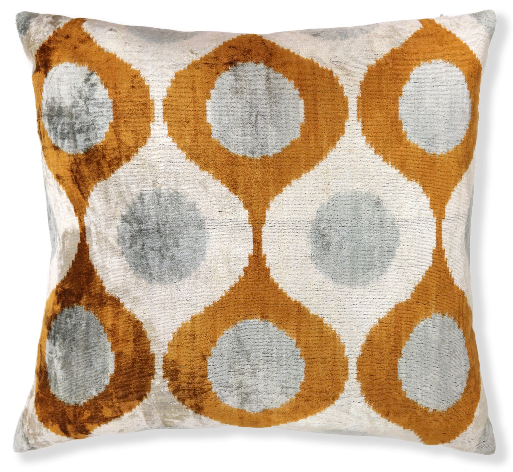 Striking in both simplicity and sophistication, this 20x20 inch (50x50 cm) silk velvet pillow showcases a rhythmic geometric design of circular gray forms enclosed in amber teardrop outlines, all floating on a soft ivory background. Its calm yet warm palette makes it ideal for transitional, modern, or retro-inspired interiors.