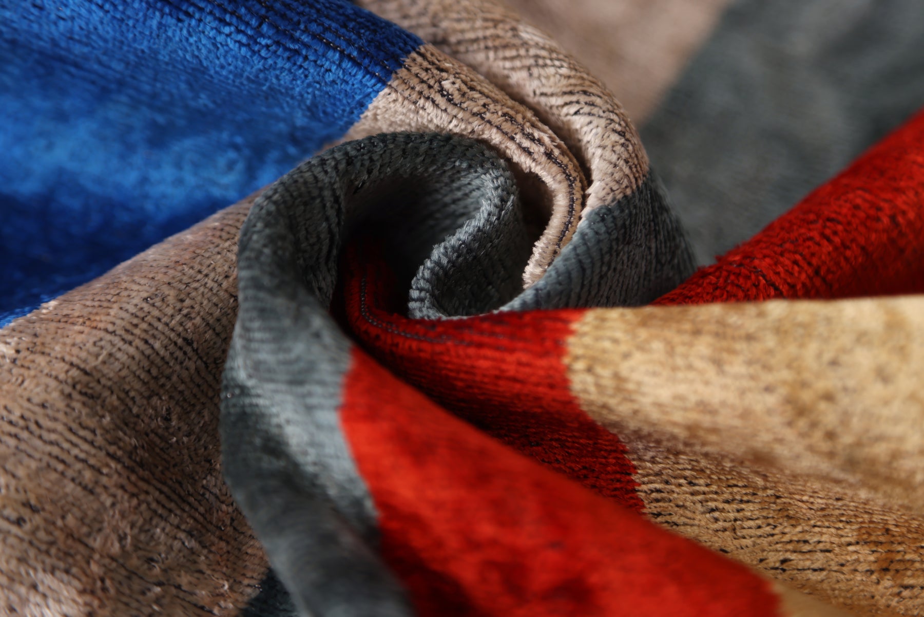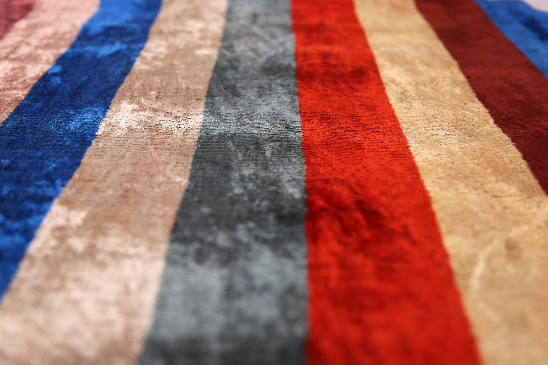 Vertical stripes in shades of cobalt, rust, wine, slate, and gold create a powerful yet harmonious statement that elevates any interior — whether you’re curating a designer loft or adding texture to a bohemian retreat.