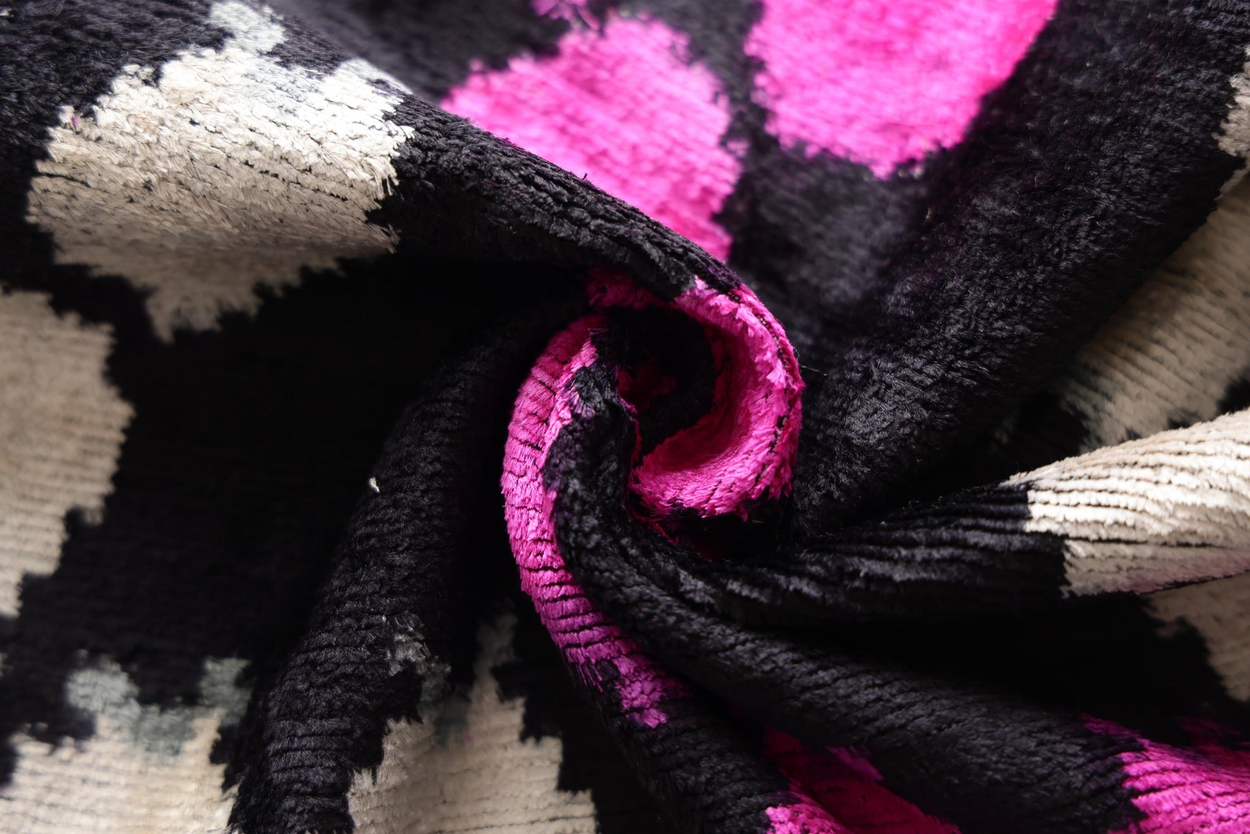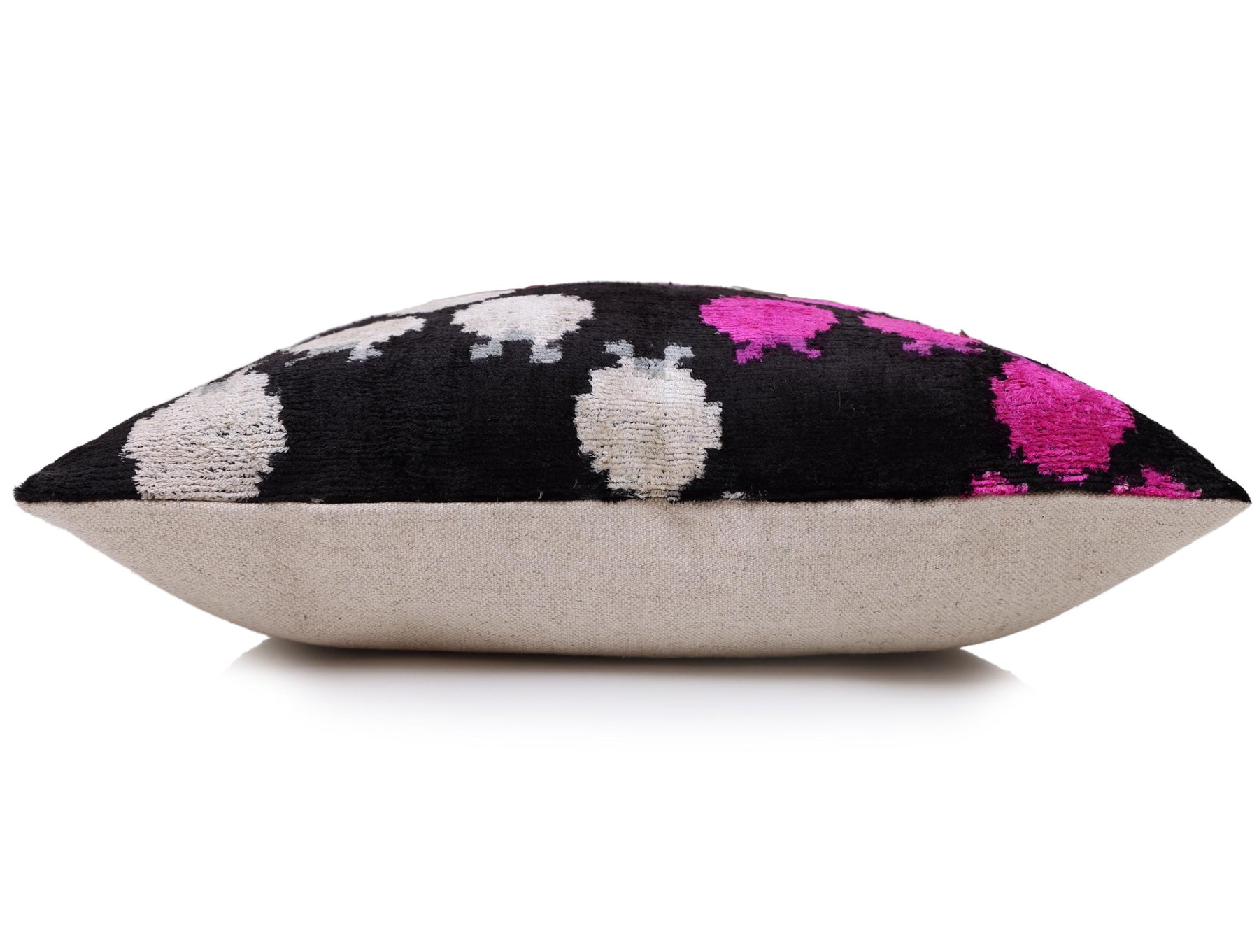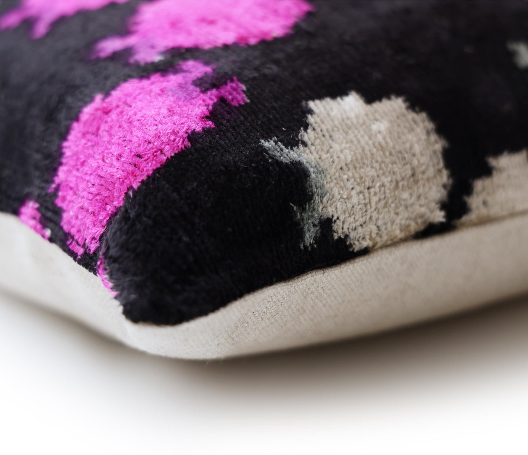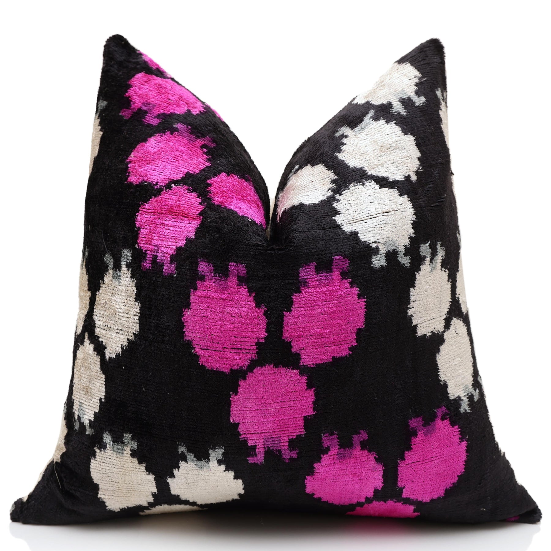 The motifs are rendered in vibrant hot pink (fuchsia) and shimmering silver-white, creating a dramatic pop of color that instantly draws the eye. Hand-woven from luxurious silk velvet, the pillow features a soft, high pile that softens the geometric edges of the design, adding tactile warmth and sophistication.