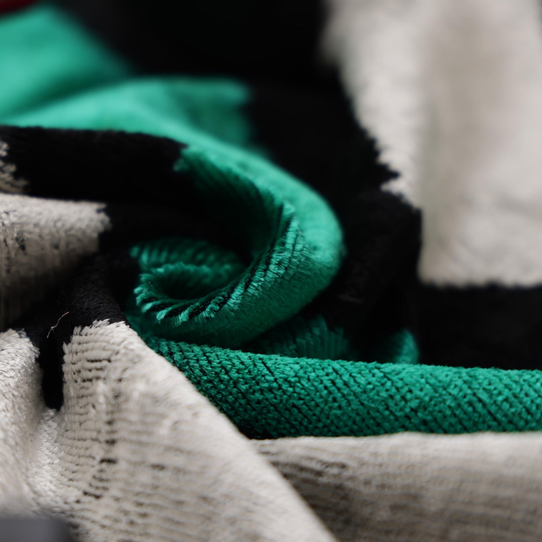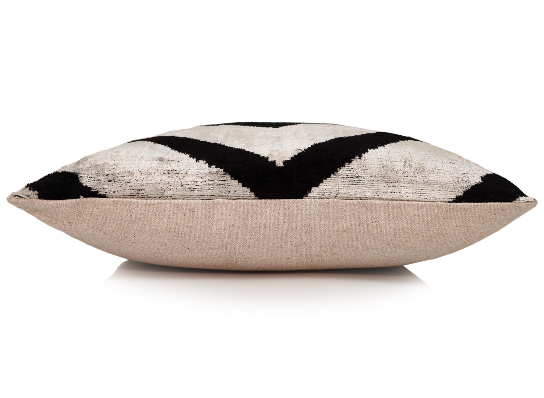 The design features a graphic chevron motif in deep emerald green, soft ivory, and jet black. The contrast feels architectural yet warm, making it a standout accent without overpowering the space. Each pillow is carefully finished and tailored in our California atelier, ensuring precise stitching, clean edges, and a luxurious final form.