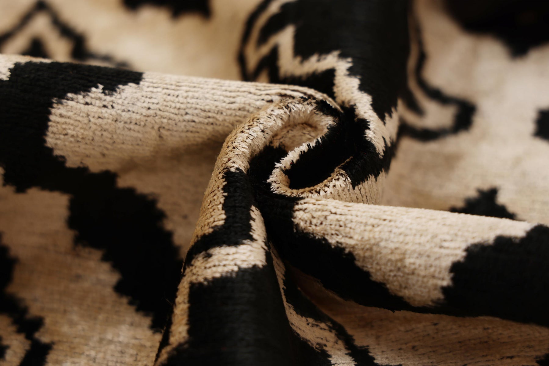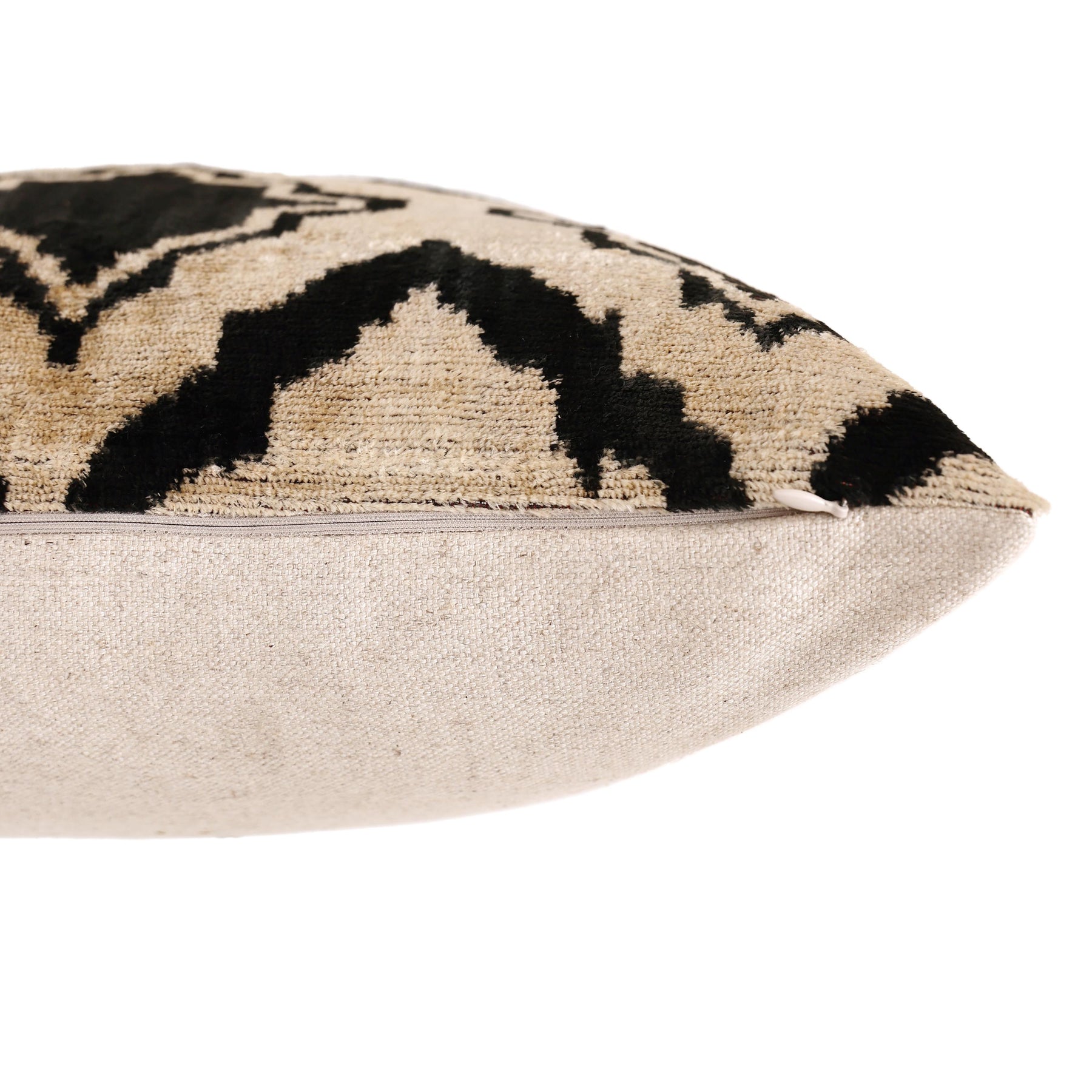 This 20x20 square pillow features a bold, over-scaled diamond trellis pattern that commands attention. Hand-woven and hand-knotted using organic vegetable dyes, the design contrasts deep ink black motifs against a warm, natural cream/sand background. Unlike flat prints, the hand-knotted silk velvet pile adds incredible depth and texture, softening the graphic lines with the characteristic "blurred" edge of authentic ikat.
