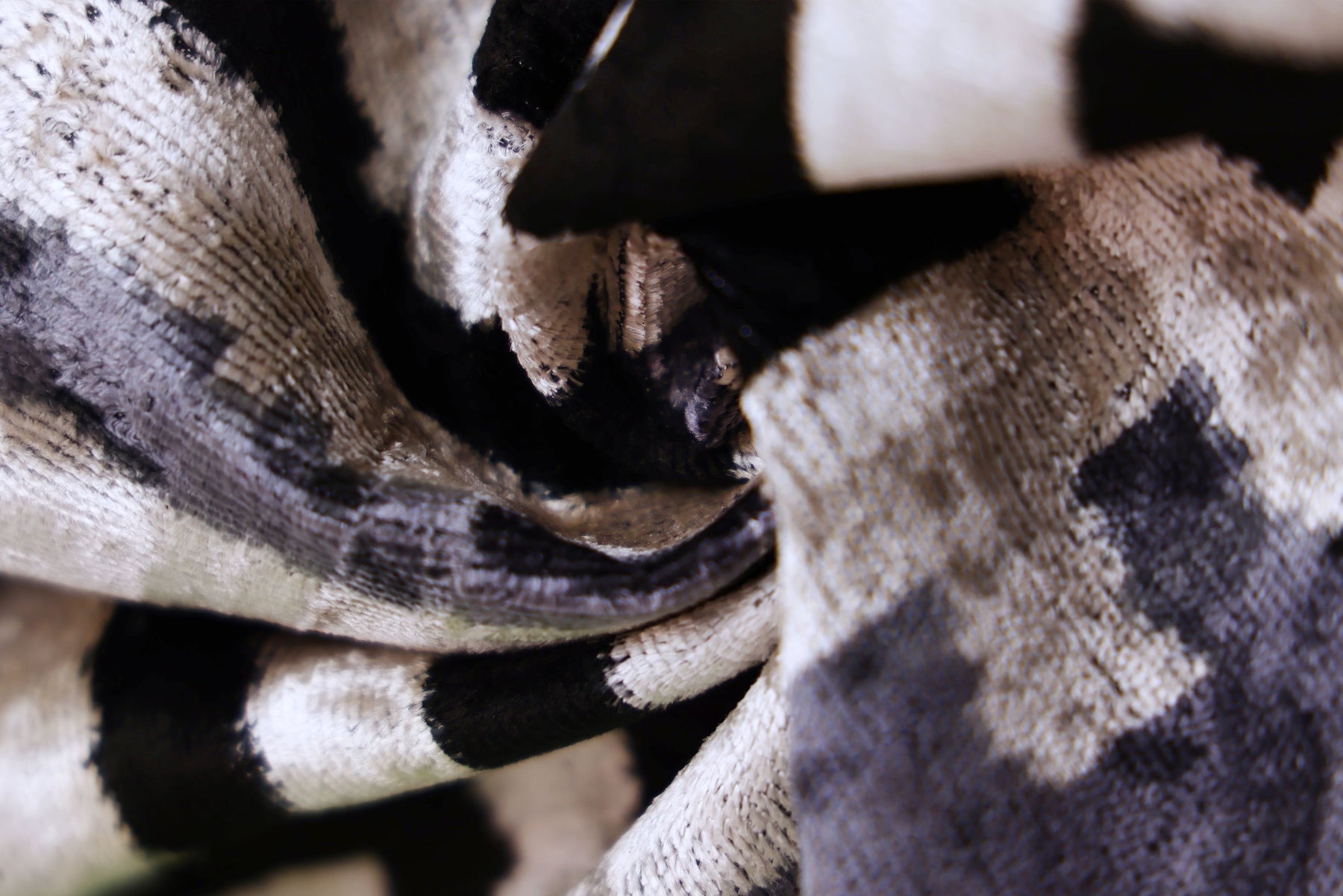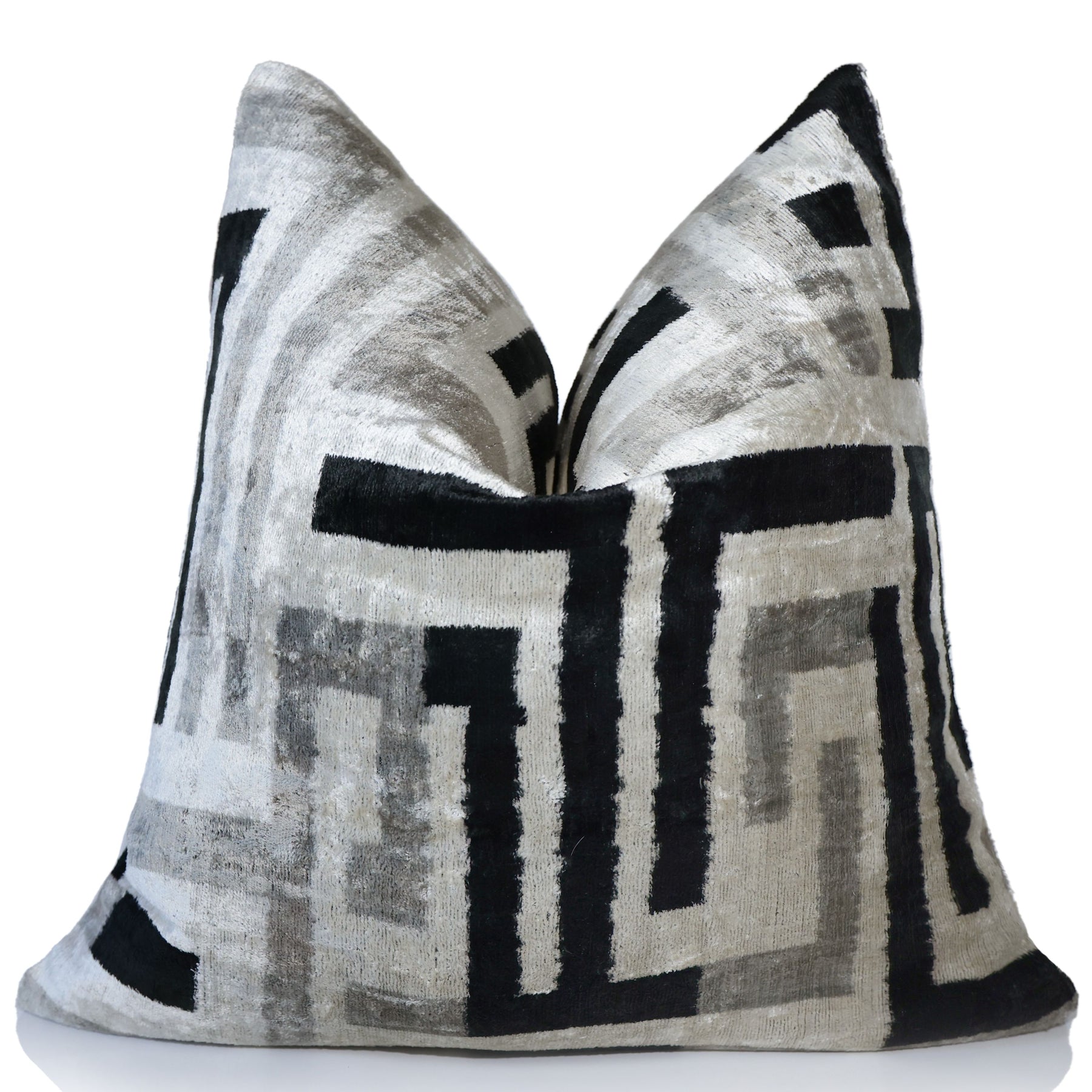 This 20x20 square pillow features a bold, labyrinthine pattern that channels Brutalist architecture and Art Deco geometry. Hand-woven and hand-knotted using organic vegetable dyes, the design contrasts deep ink black velvet against a luminous background of silver-grey and oyster. The "blurred" edges of the ikat technique soften the graphic lines, giving the pillow a sense of movement and hand-crafted soul rather than rigid machine perfection.