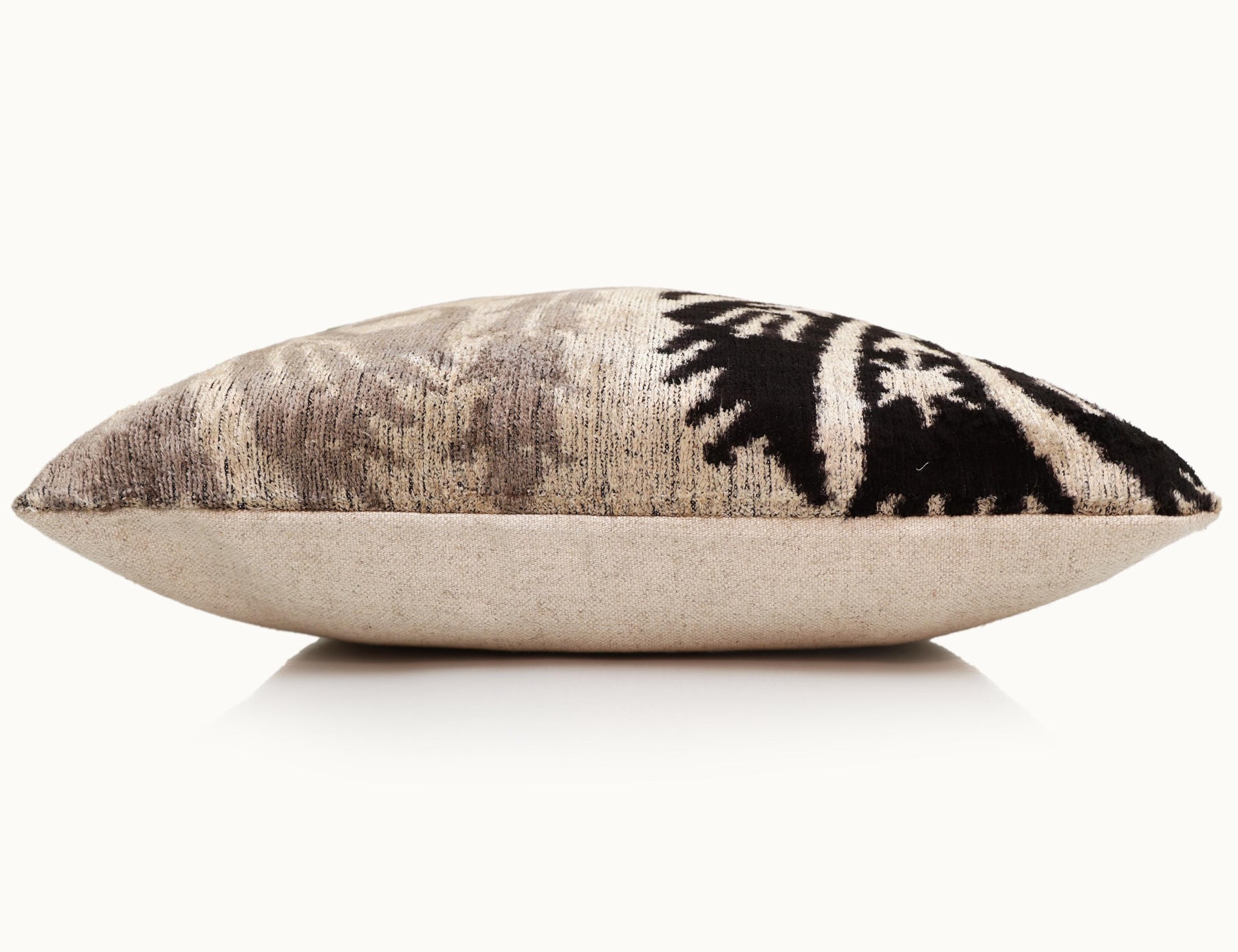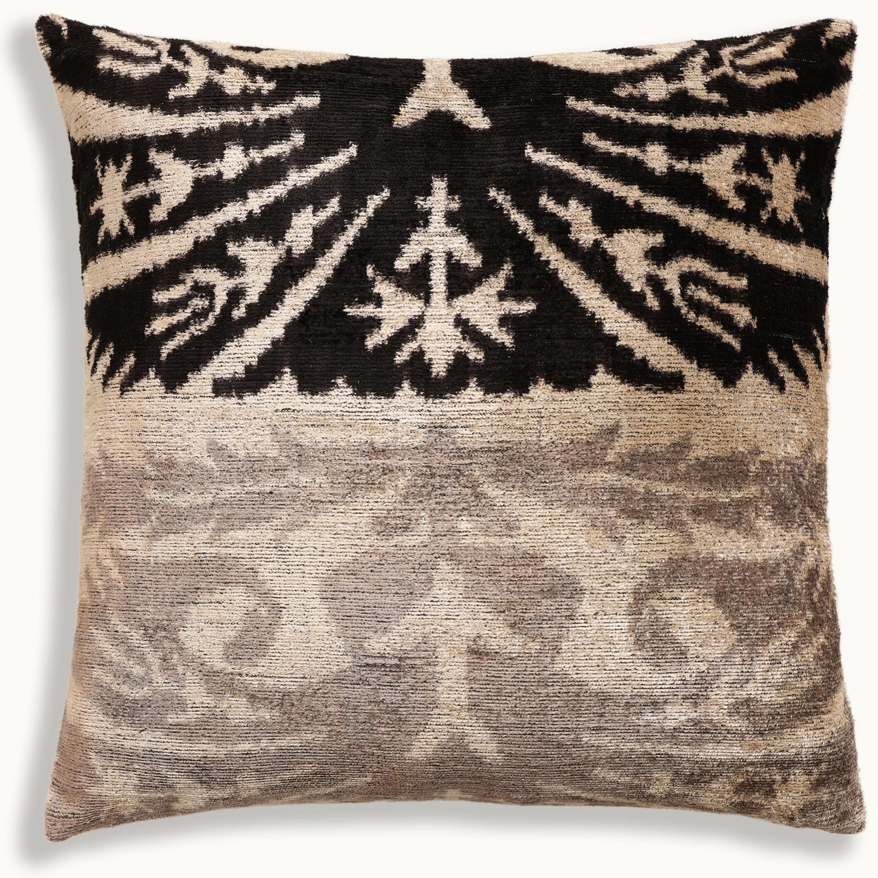 This 20x20 square pillow presents a stunning visual narrative: the upper section features a bold, ink-black and cream botanical ikat pattern that gradually gives way to a ethereal, shimmering silver-grey motif at the bottom. Hand-woven and hand-knotted using organic vegetable dyes, this unique "faded" or dip-dye effect creates a sense of depth and antiquity, as if the textile has been sun-bleached over centuries.
