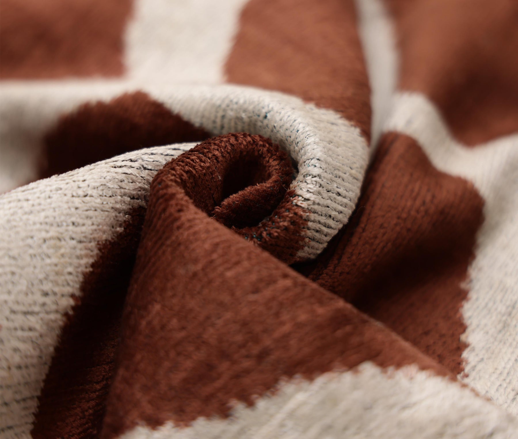 This 20x20 inch (50x50 cm) handmade silk velvet throw pillow features a bold geometric pattern in rich warm brown contrasted with soft ivory tones. The design creates a strong architectural rhythm while maintaining an organic, hand-crafted character that elevates both modern and transitional interiors.