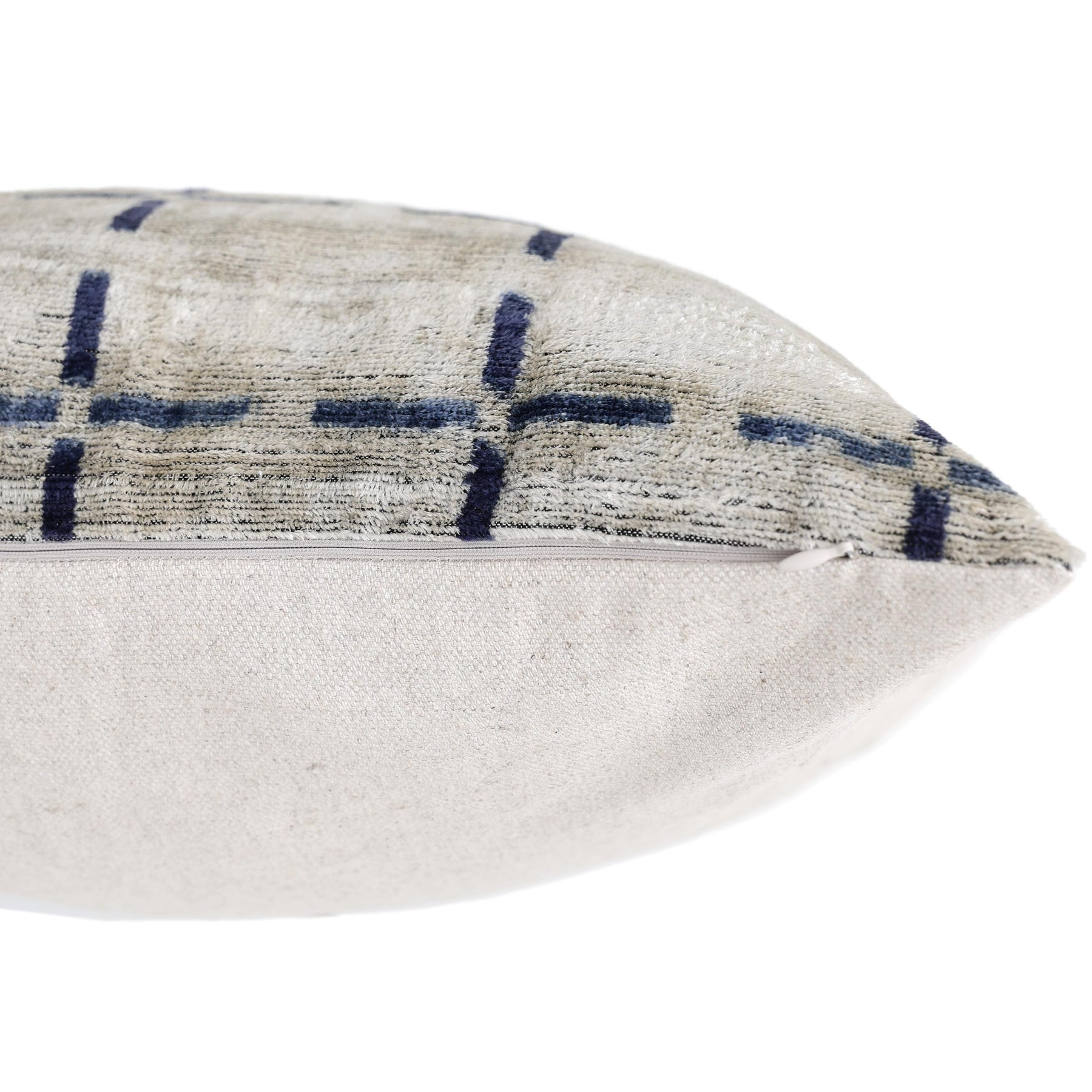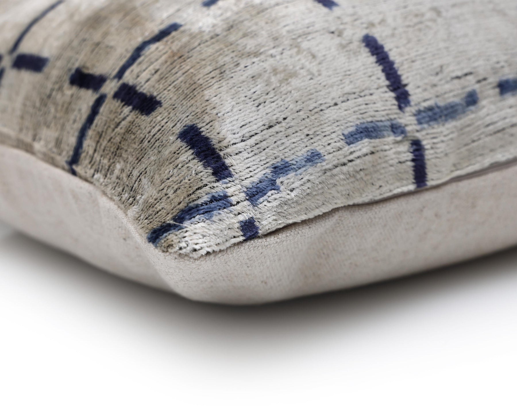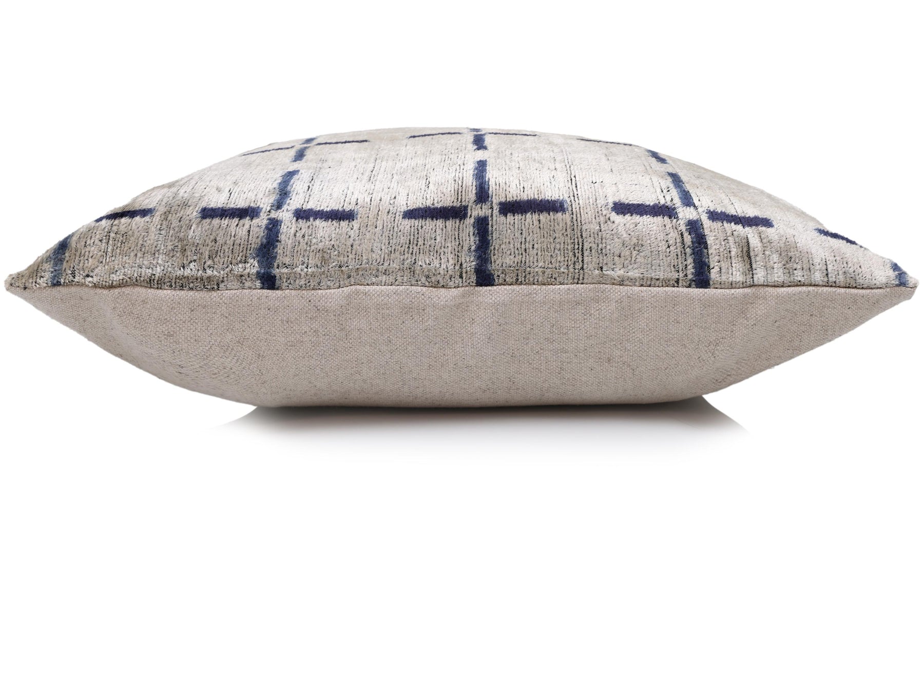This 20x20 inch handcrafted silk velvet pillow is a refined statement piece designed for elevated interiors. Handwoven and hand-knotted by master artisans using organic, vegetable-dyed silk velvet, this pillow showcases a subtle grid motif in soft ivory with deep indigo accents, creating a timeless balance between structure and softness.