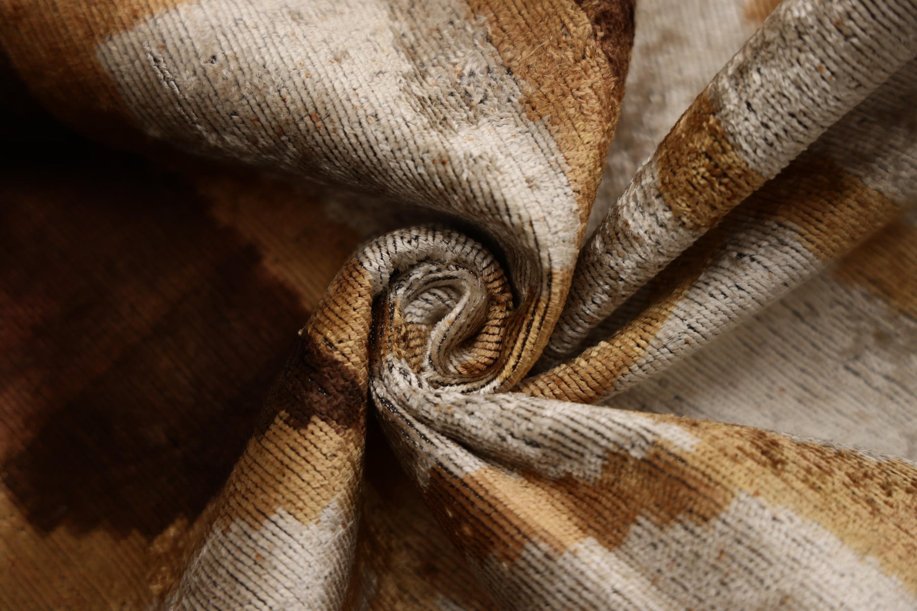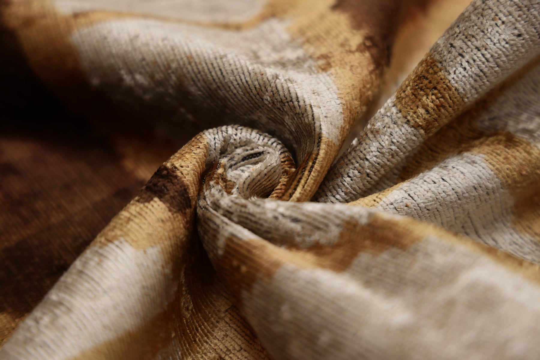 The design showcases a bold, abstract geometric pattern reminiscent of modern art and traditional ikat weaving. A rich palette of burnished gold, deep espresso, and shimmering champagne creates a sense of depth and movement. The high-low pile of the cut velvet offers a sumptuous tactile experience, making this not just a visual accent, but a comfort essential.