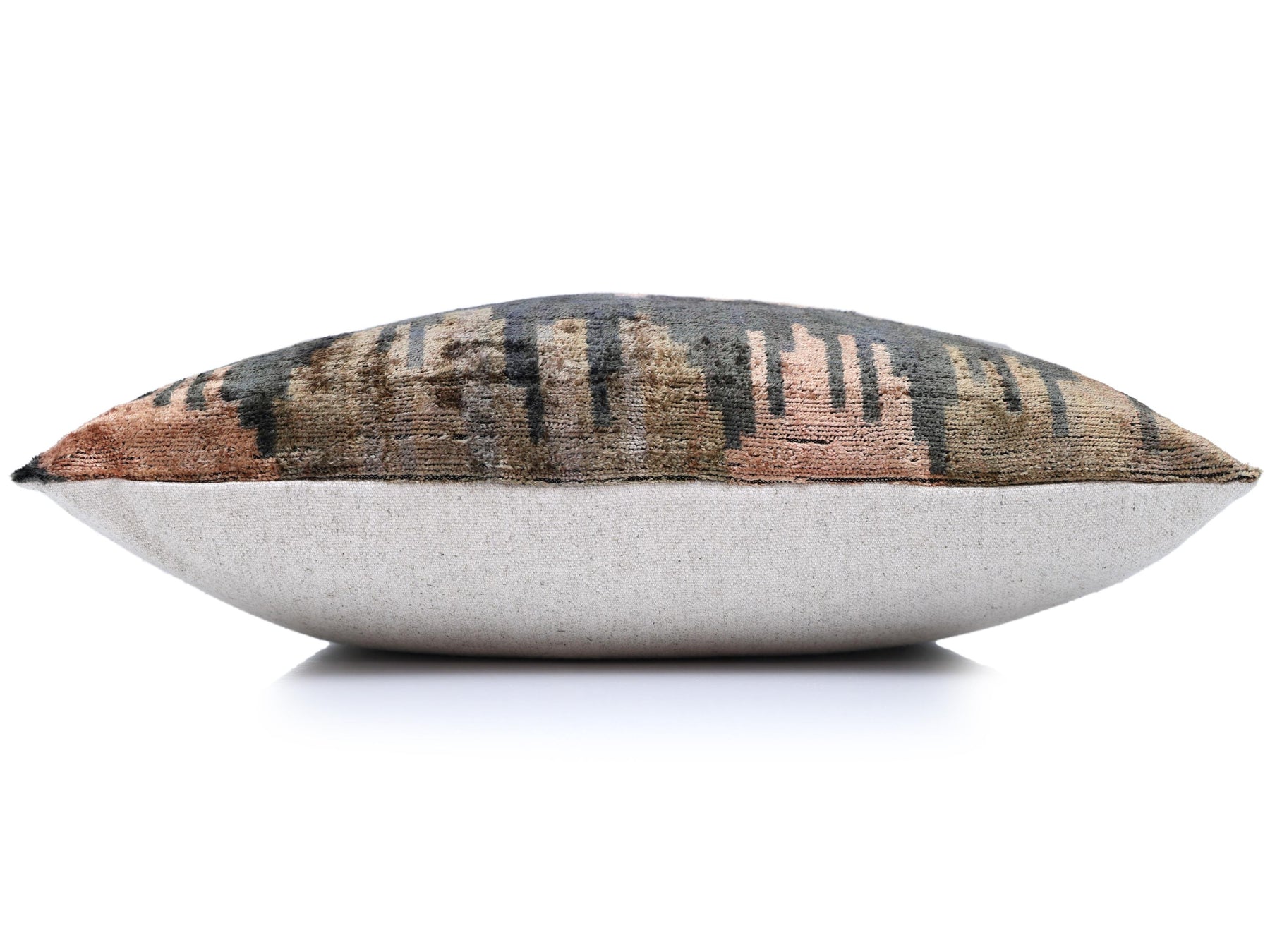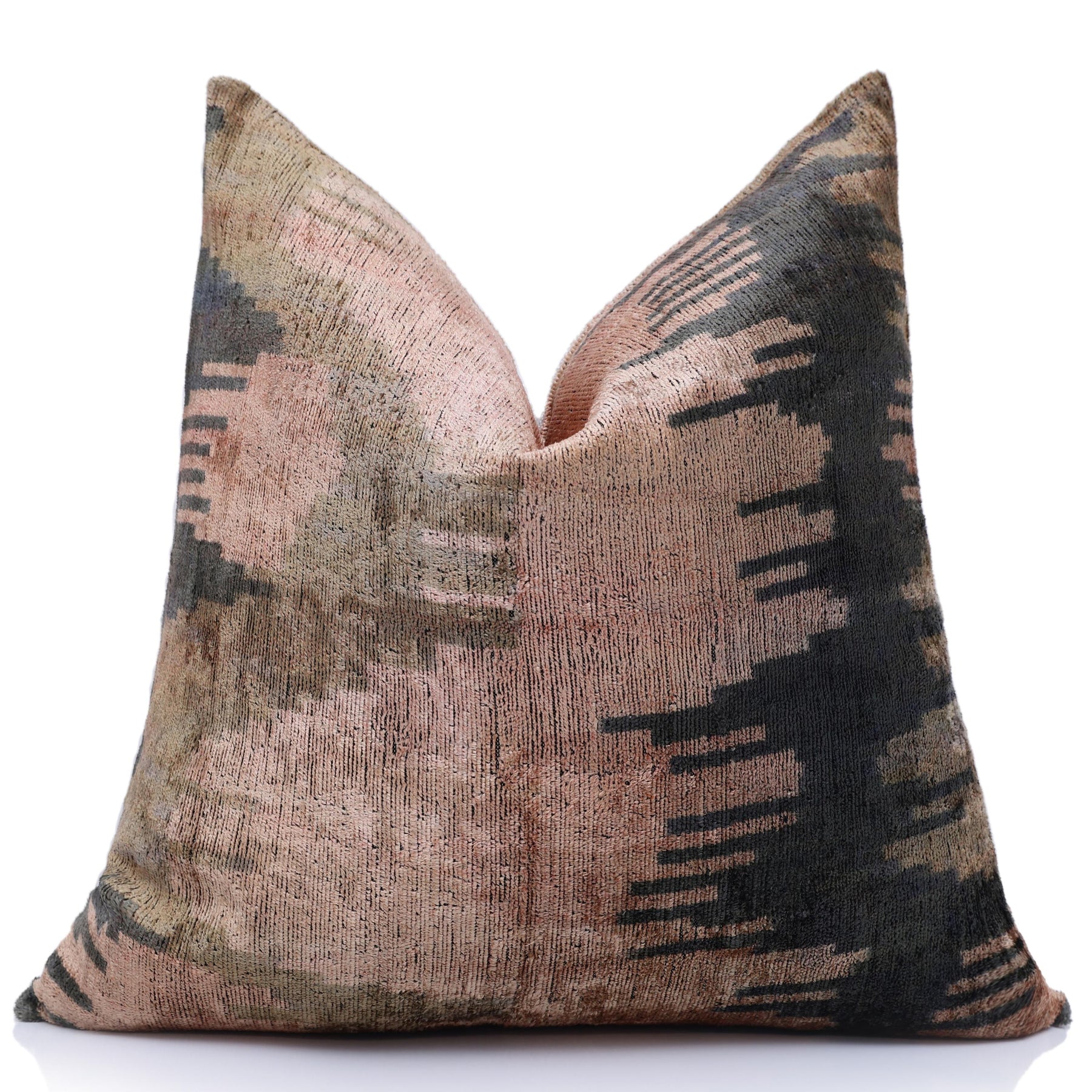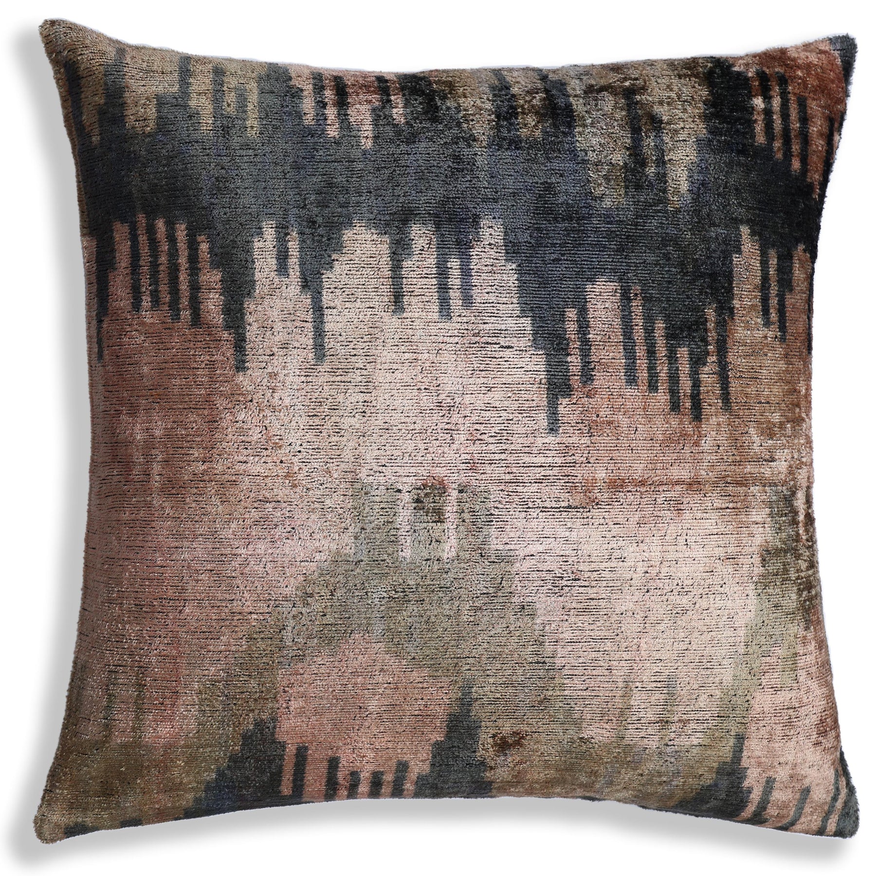 Introduce a touch of artistic expression to your home with this exquisite 20x20 inch silk velvet pillow. The design features a captivating abstract ikat pattern that resembles a watercolor painting or a misty landscape, with vertical "bleeding" lines cascading down the fabric.