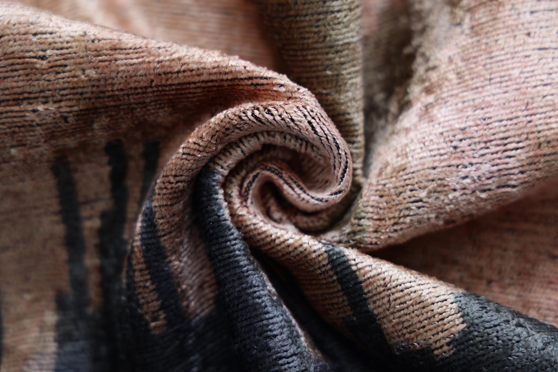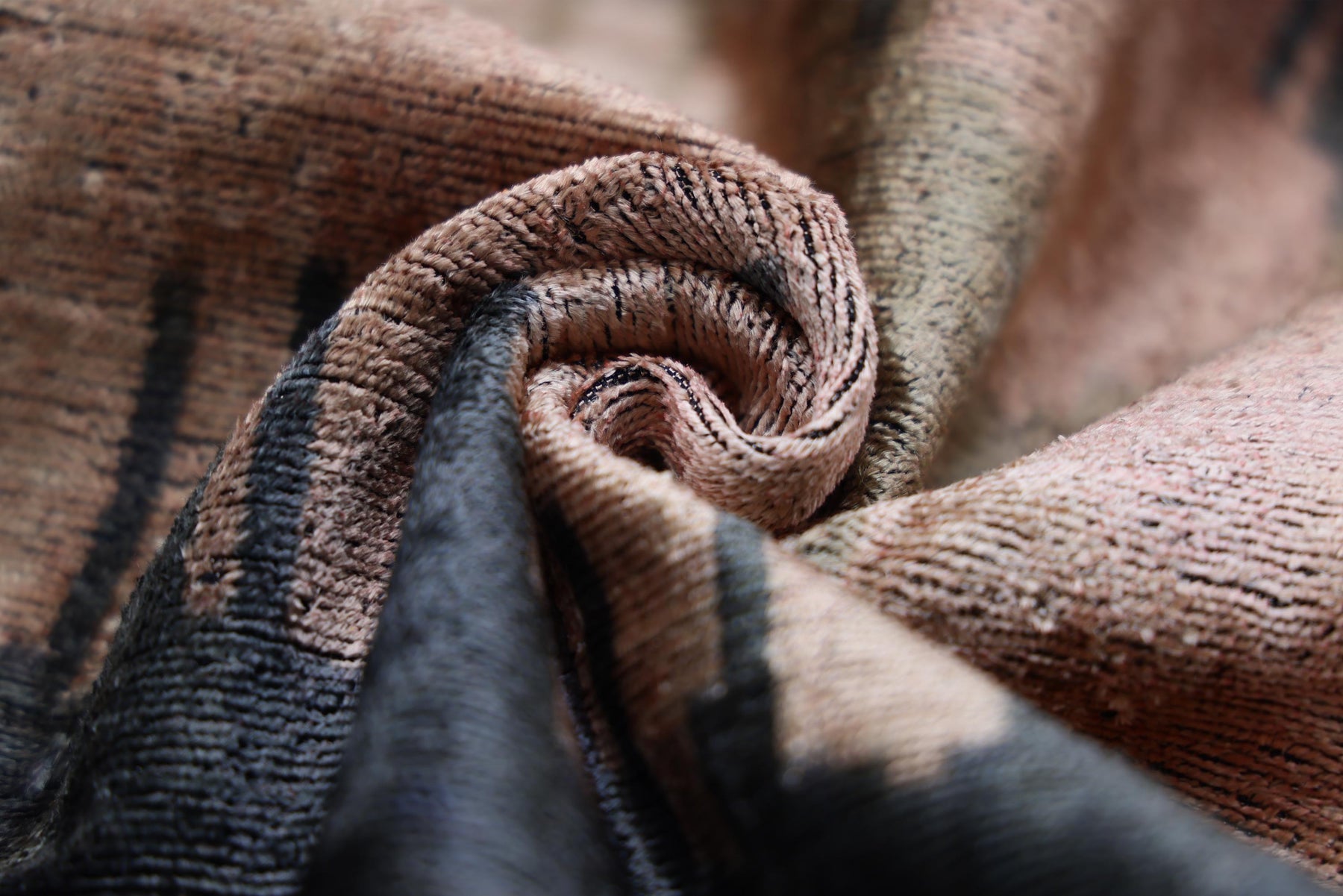The sophisticated color palette blends moody charcoal grey, warm taupe, and soft dusty rose, creating a serene yet dramatic visual effect. Woven from luxurious silk-blend velvet, the pile is incredibly soft and lustrous, allowing the colors to shift and shimmer subtly in the light.