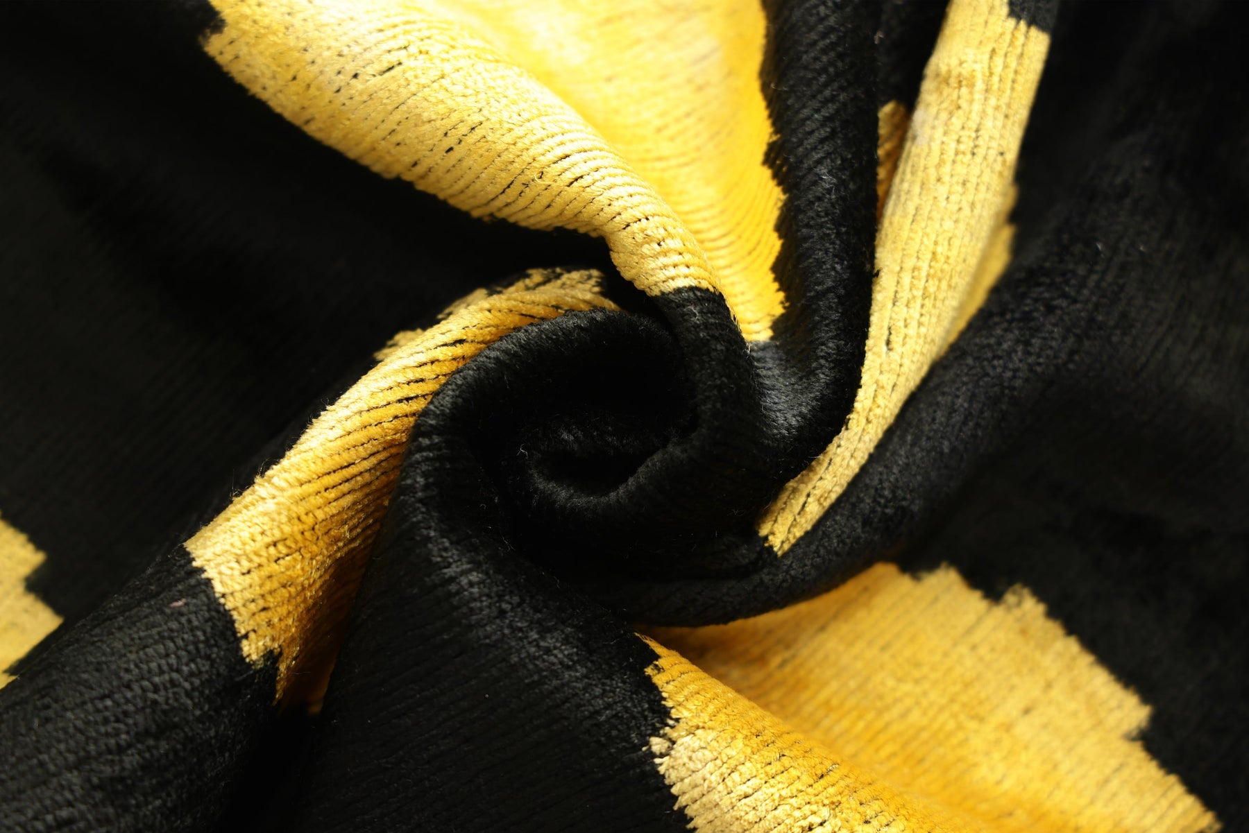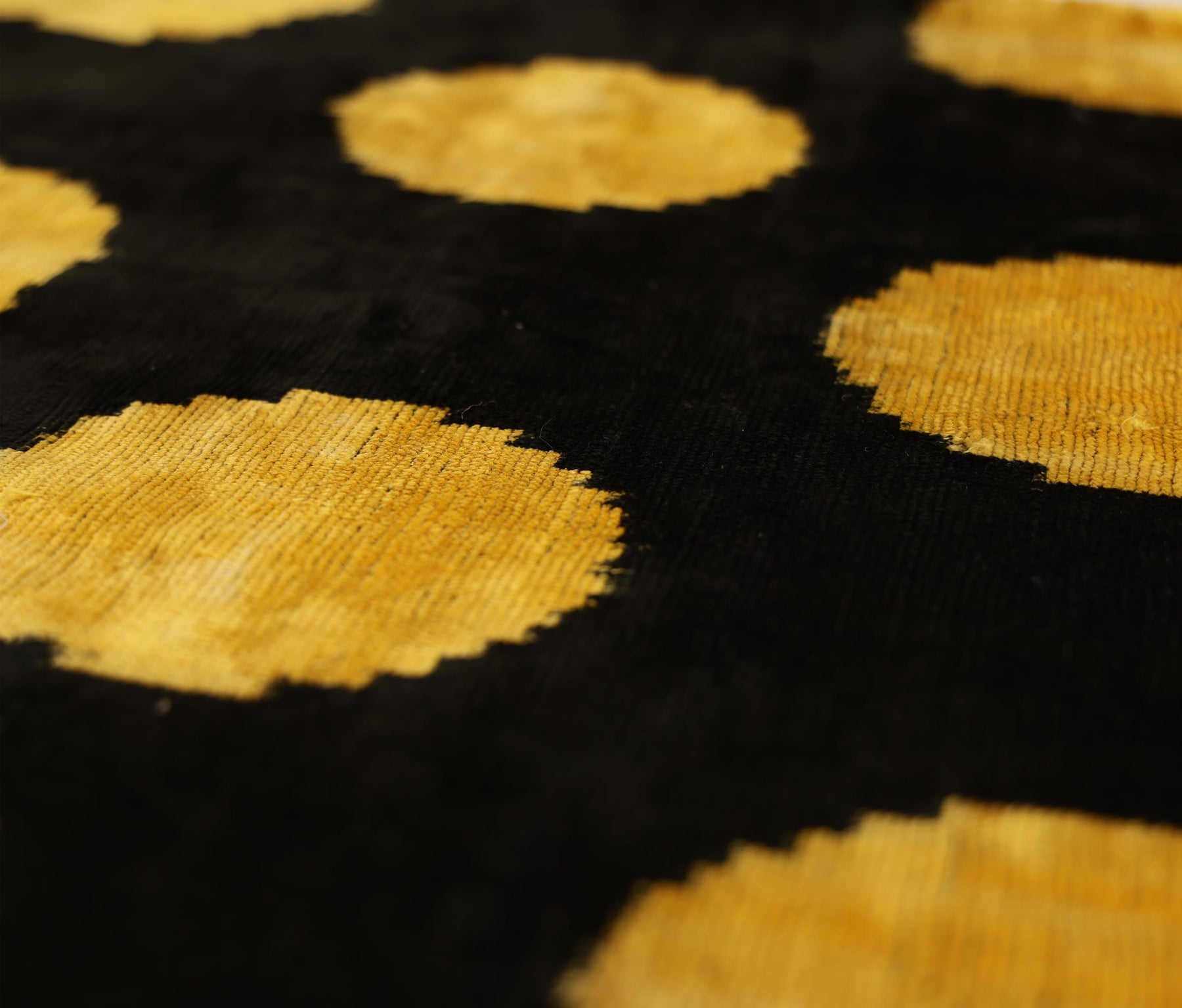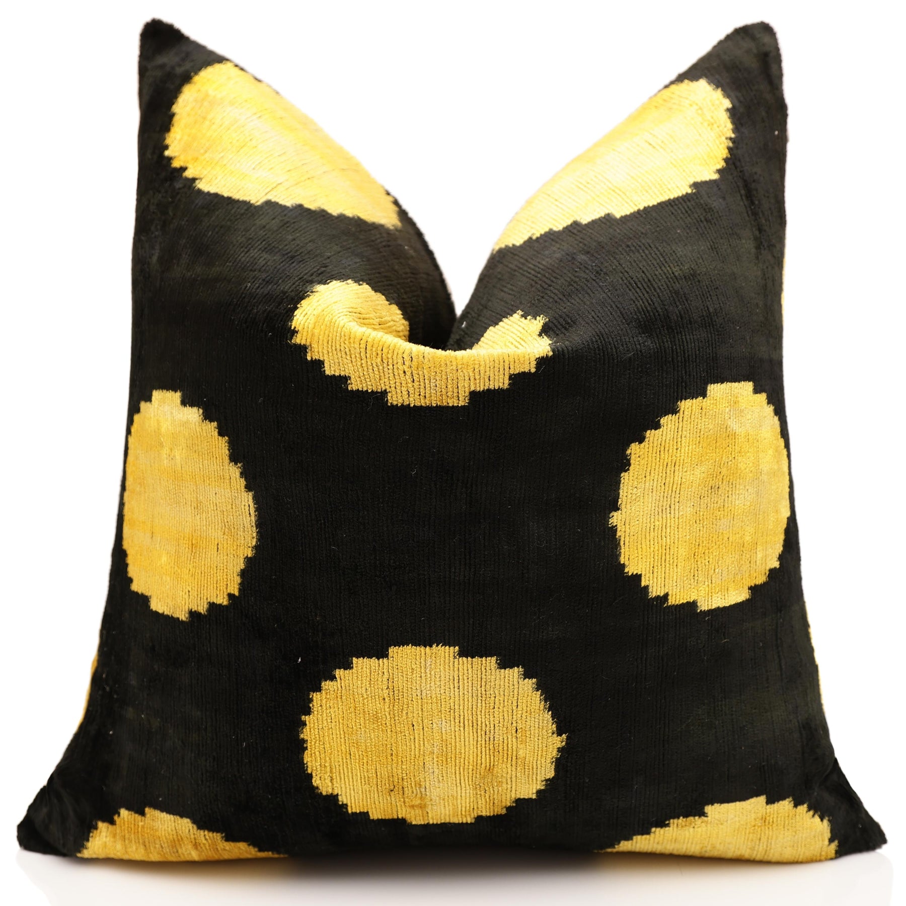 This luxurious 20x20 inch silk velvet pillow features a bold black ground accented with luminous golden circular motifs, creating a striking balance between graphic modernity and timeless artisan craftsmanship. Handwoven and hand knotted using traditional techniques, the silk velvet surface offers a rich pile with subtle natural variations that enhance its depth and character.