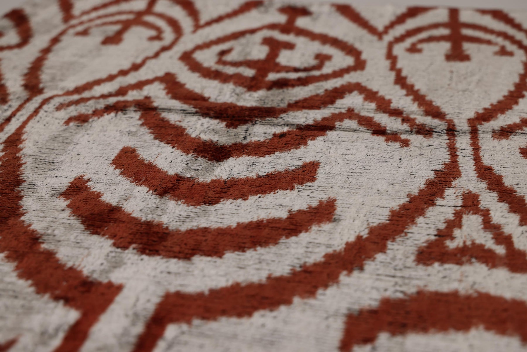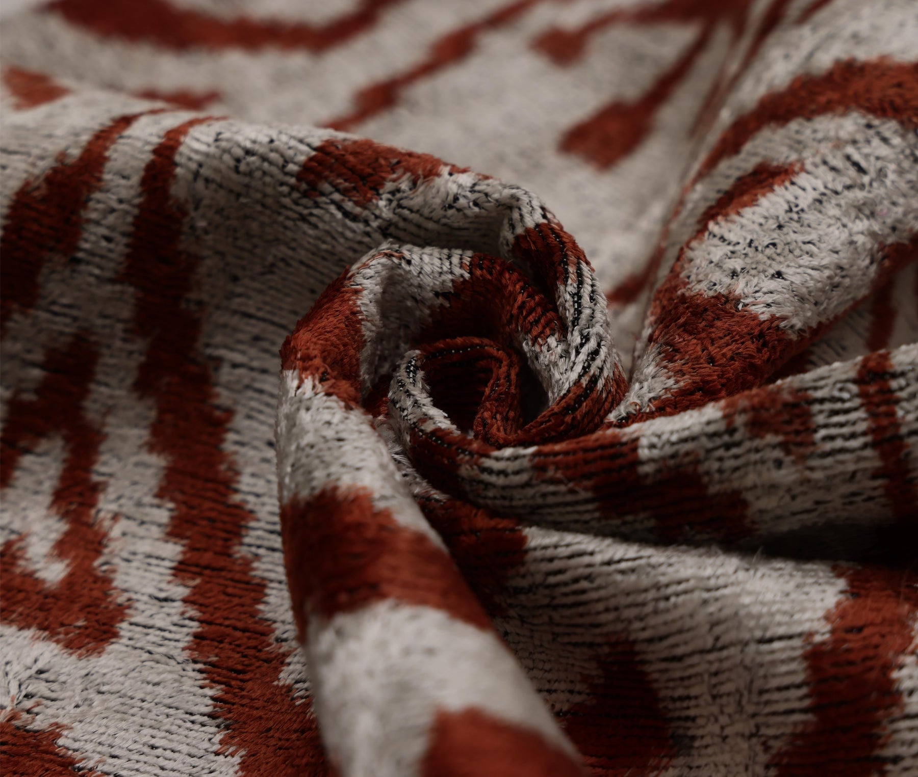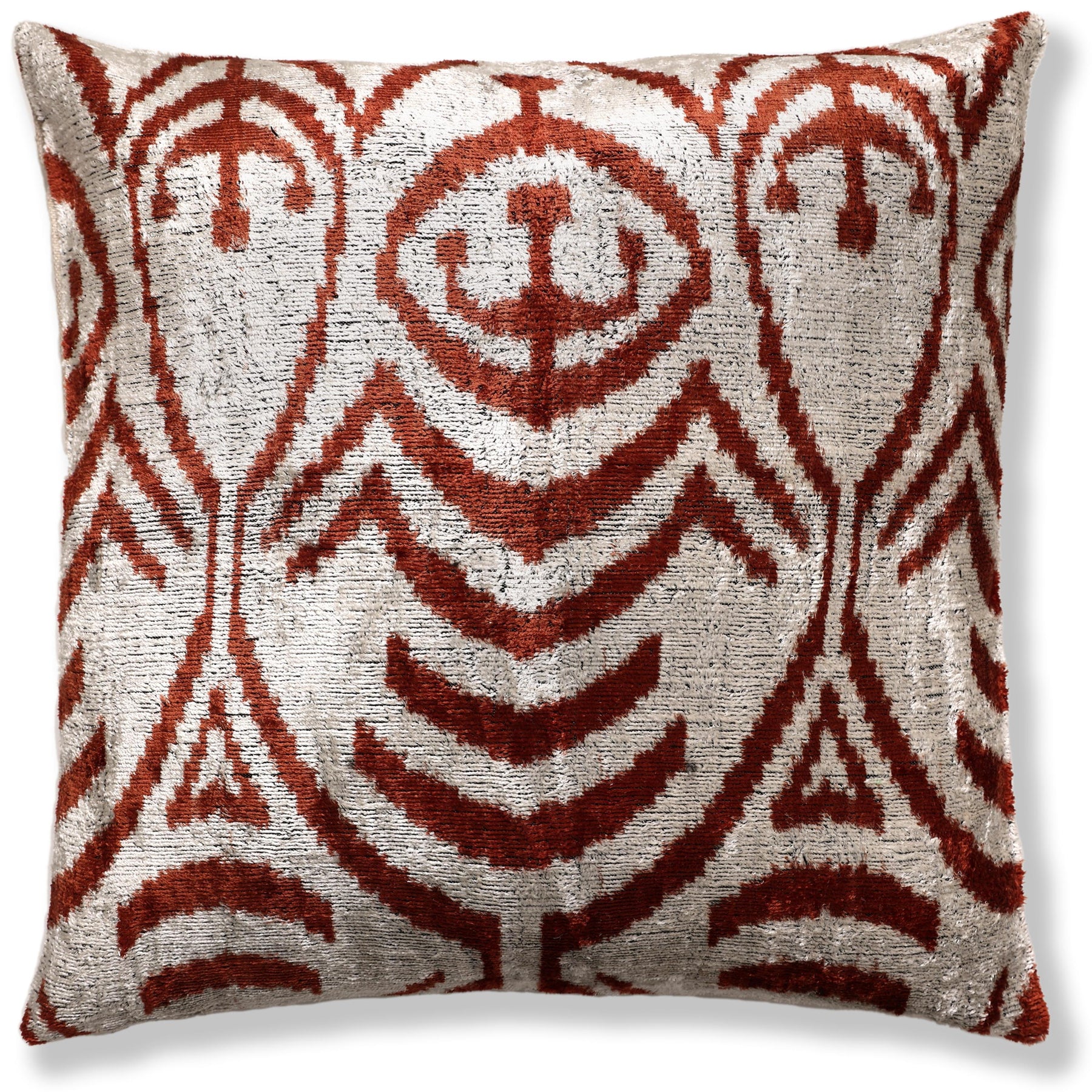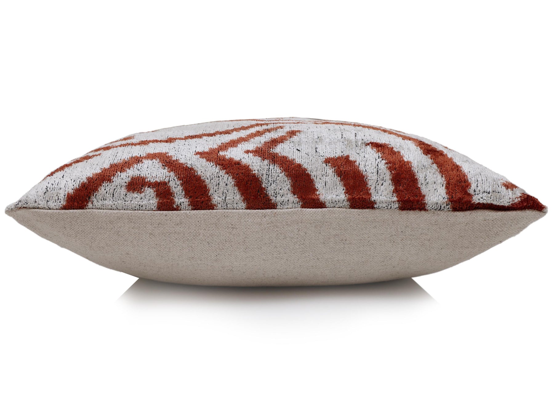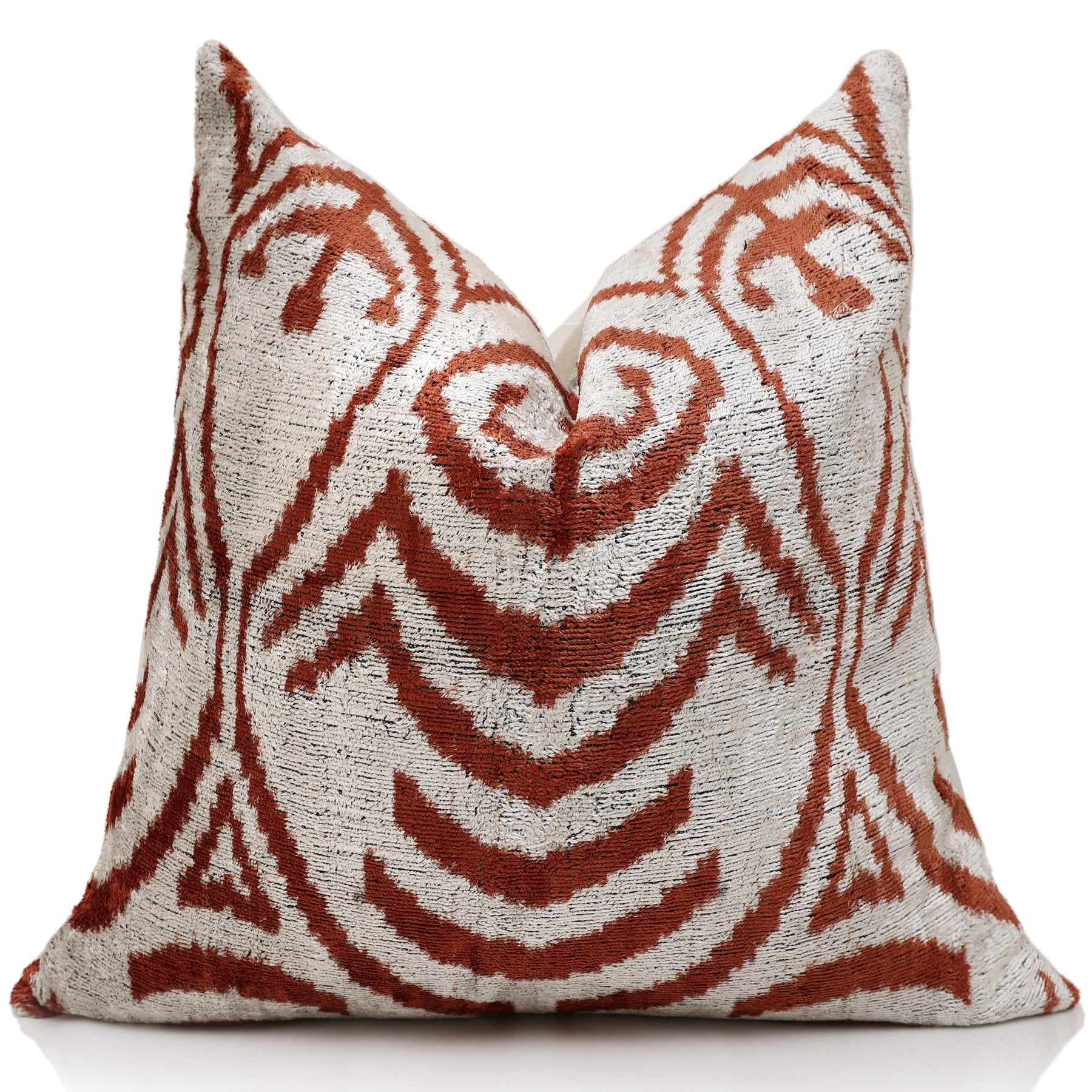 This luxury 20x20 inch handwoven silk velvet pillow is a refined statement piece designed for sophisticated interiors. Showcasing a bold yet balanced rust and ivory ikat-inspired motif, this pillow brings warmth, movement, and artisanal character to curated residential and luxury staging projects. Each pillow is handwoven, hand knotted, and dyed using organic vegetable dyes, creating subtle variations that make every piece truly one of a kind.