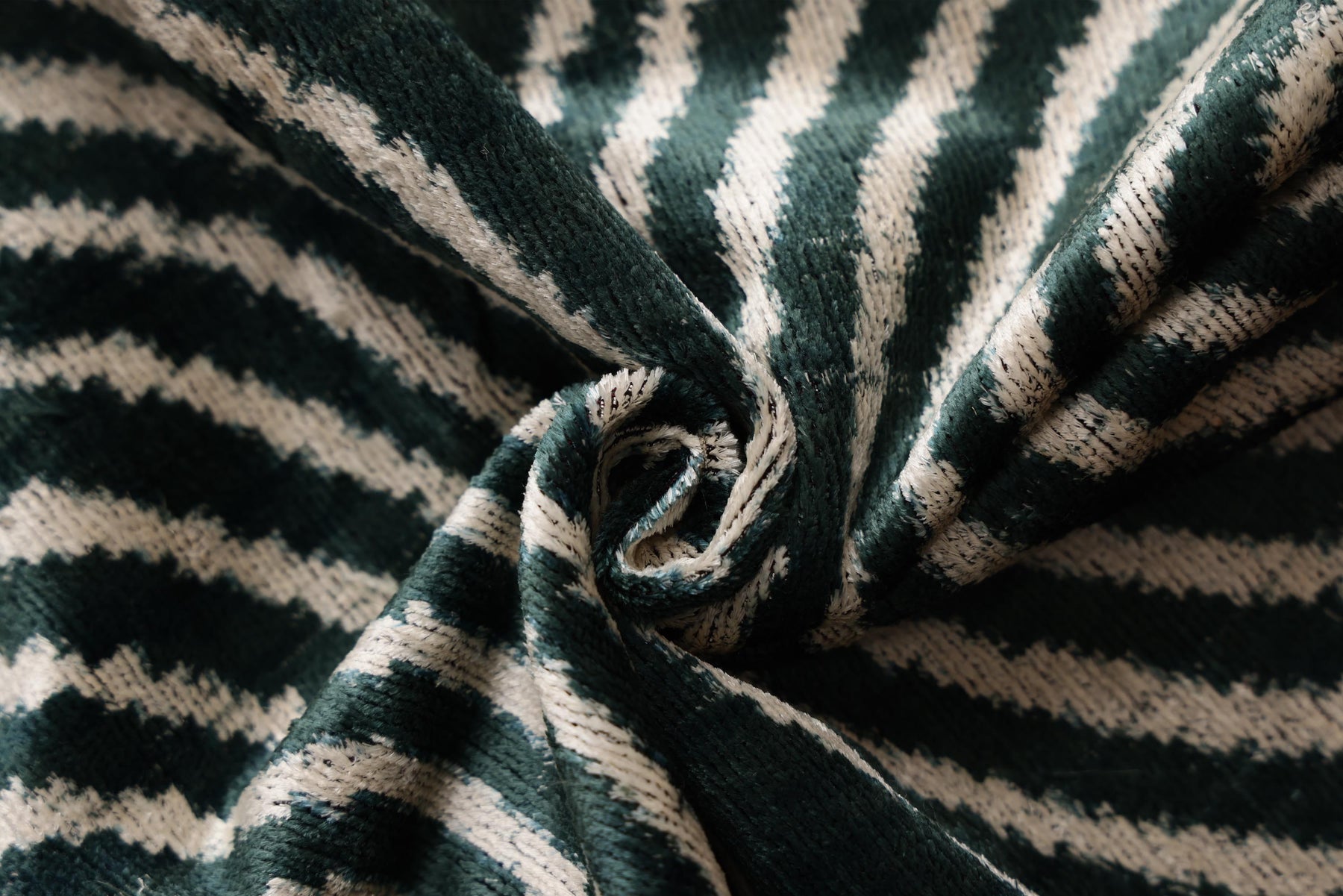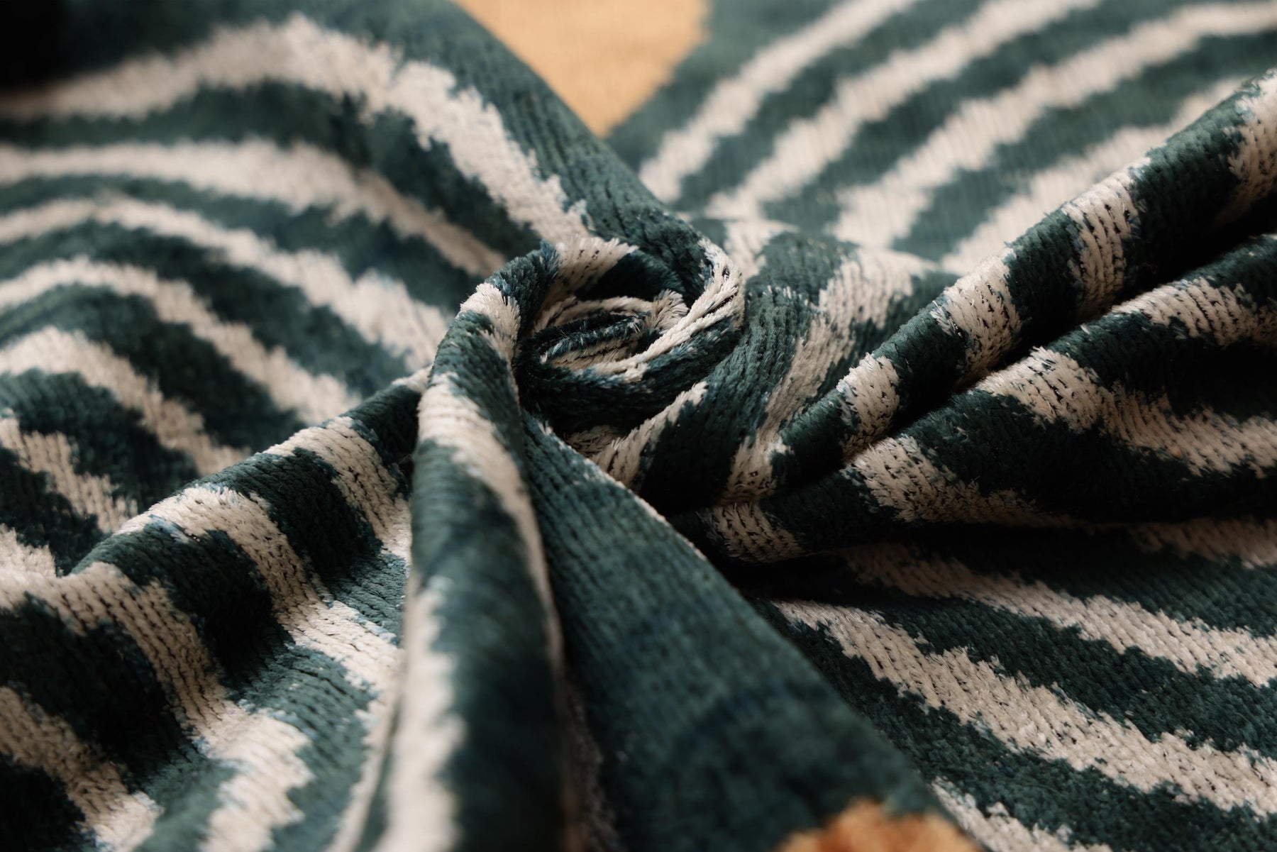Texture: Soft, plush velvet pile contrasting with the woven structure of the pattern.