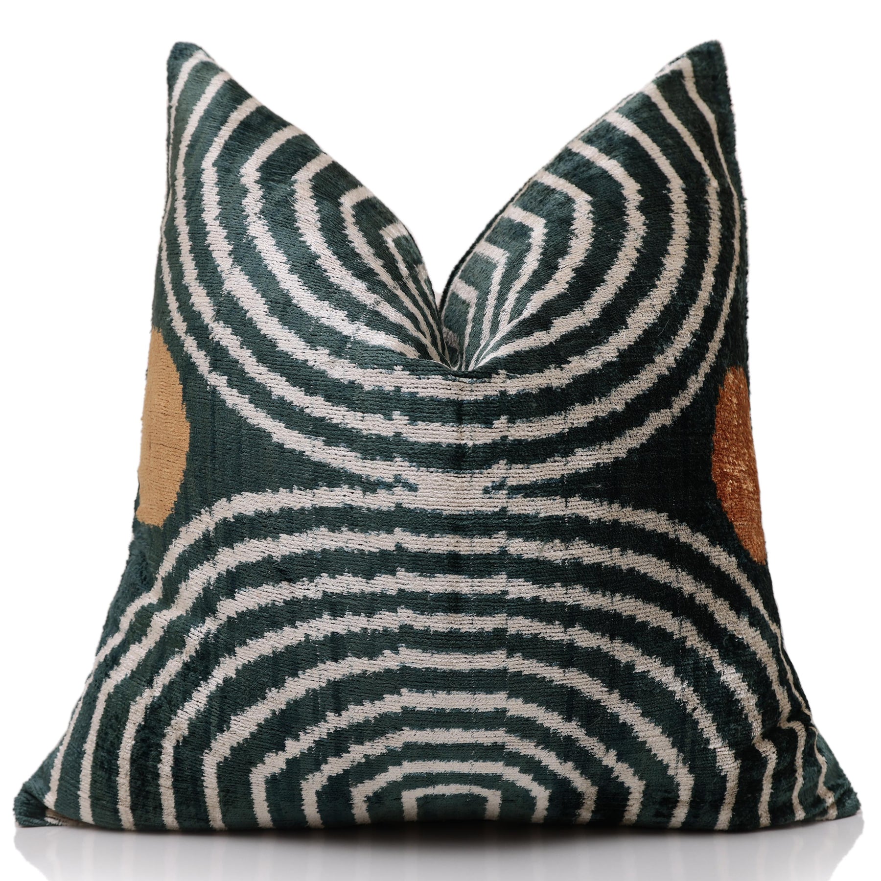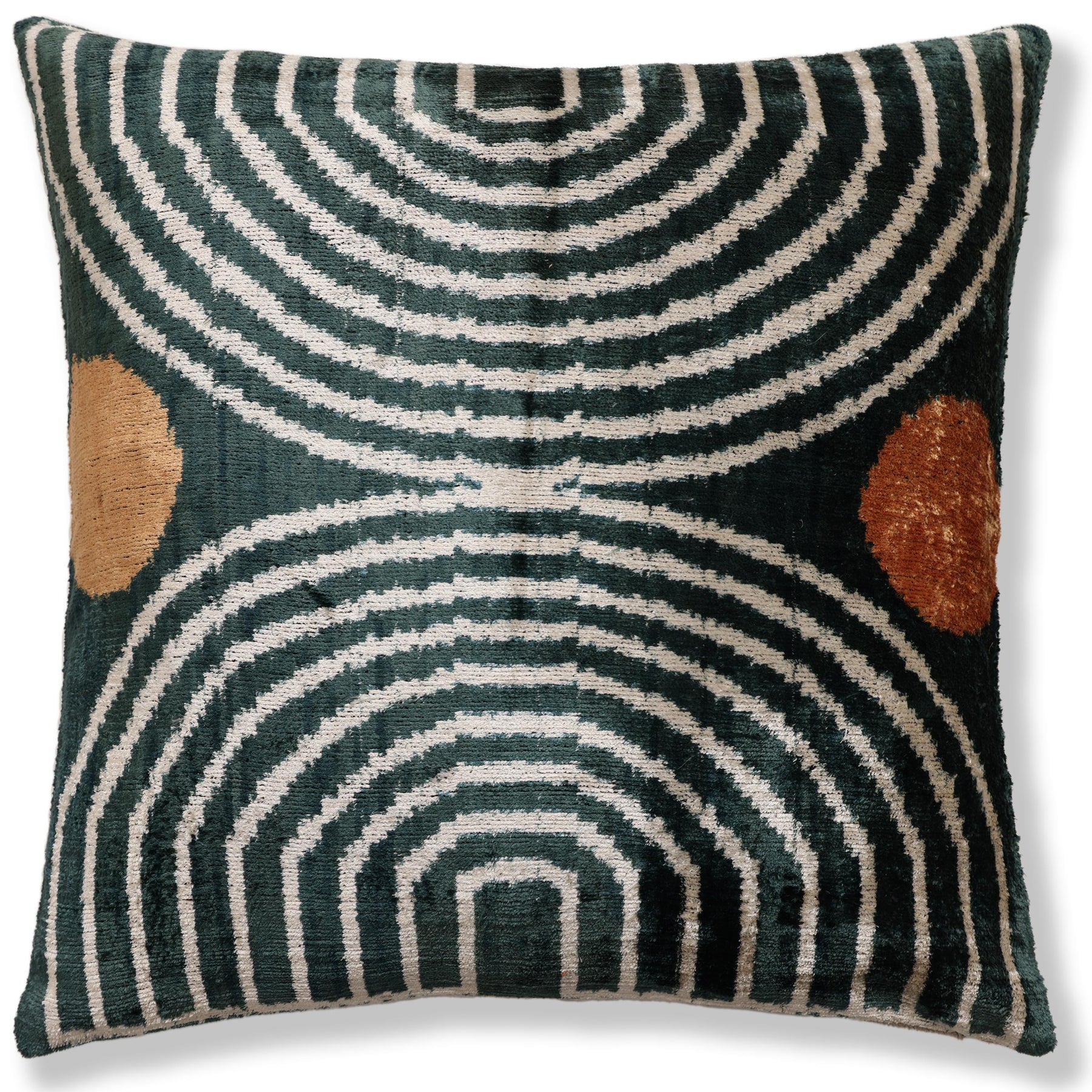 levate your interior with the sophisticated drama of this 20x20 inch silk velvet pillow. The design features a mesmerizing geometric pattern of concentric arches and curves, reminiscent of Art Deco motifs or modernist ripples, set against a luxurious deep emerald green background.