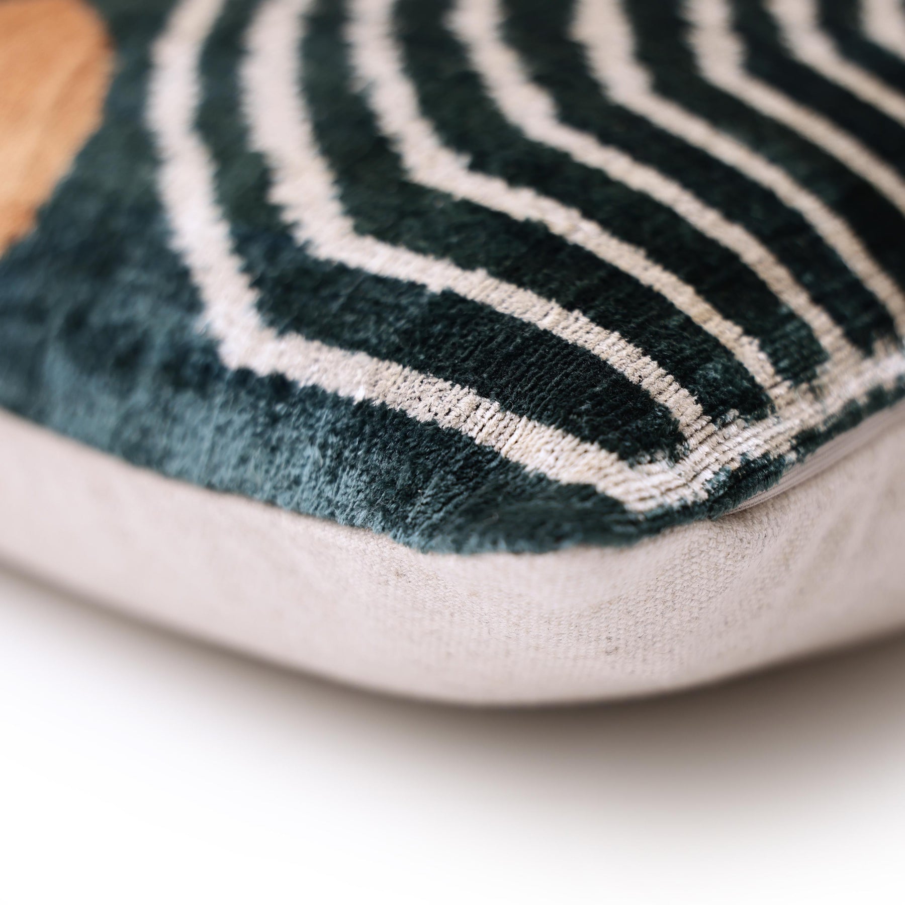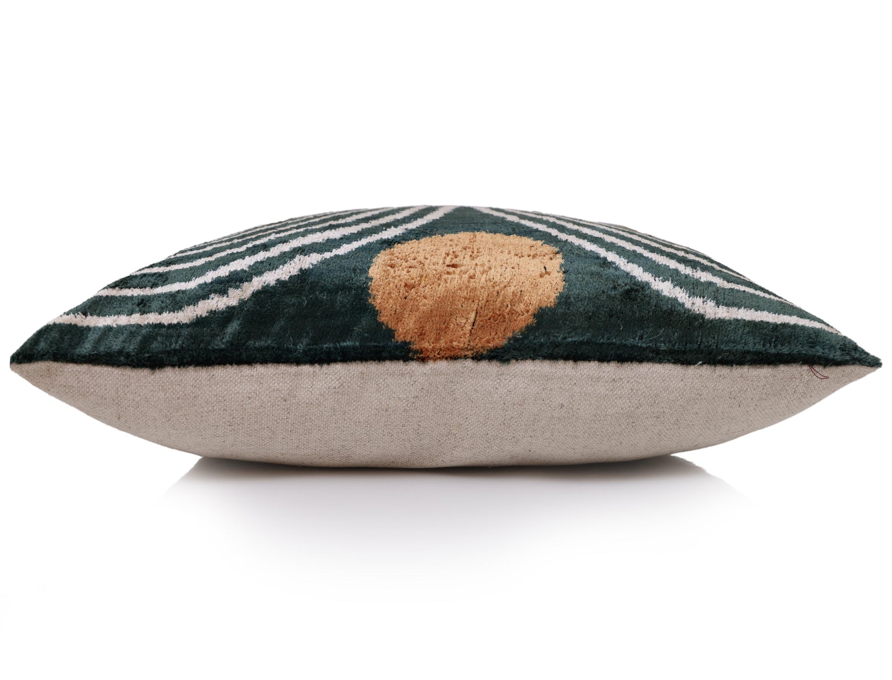 Hand-woven from a premium silk blend, the velvet pile is thick and lustrous, offering a soft hand and a dynamic sheen that catches the light beautifully. The pillow is finished with a crisp knife-edge, backed with a durable natural linen blend, and secured with a hidden zipper for a polished, gallery-ready look.