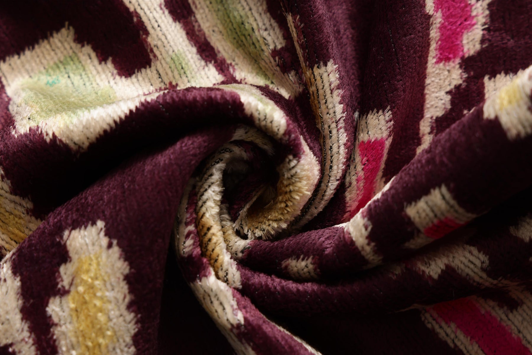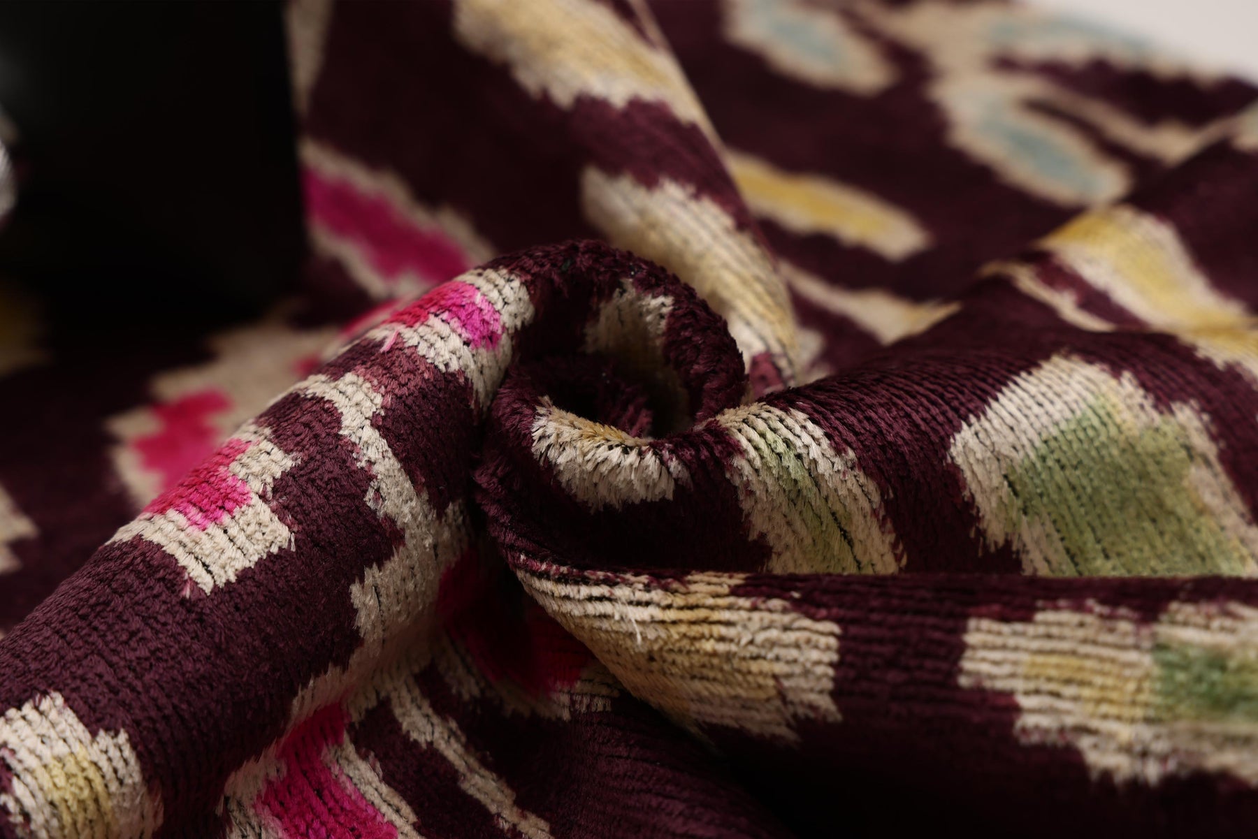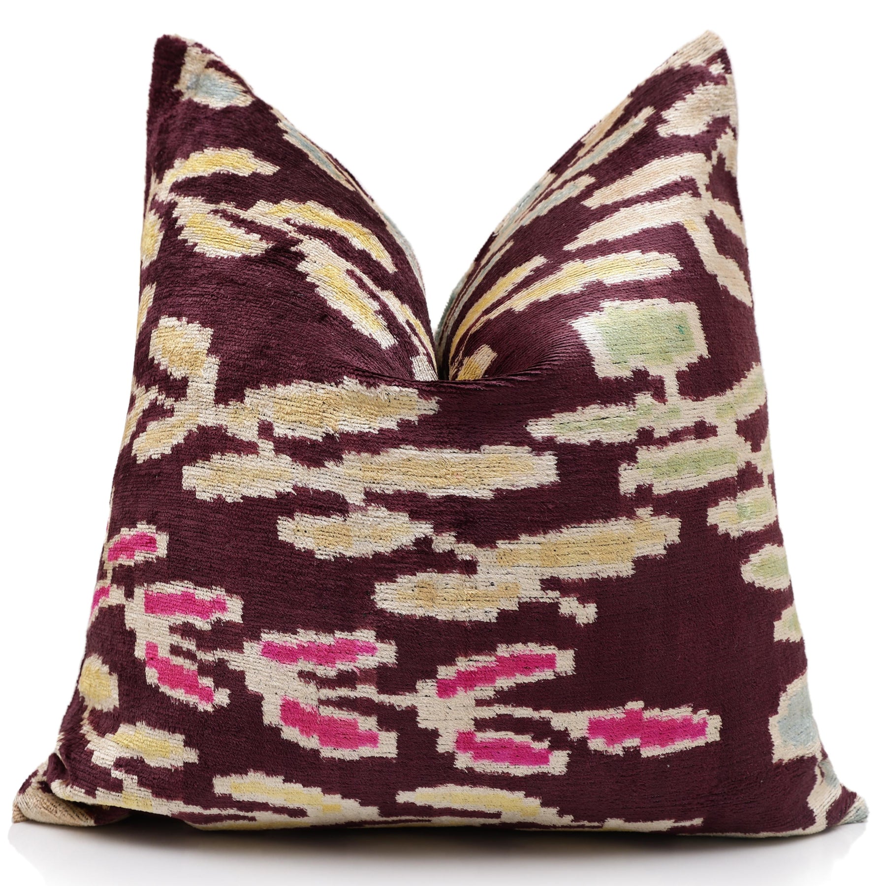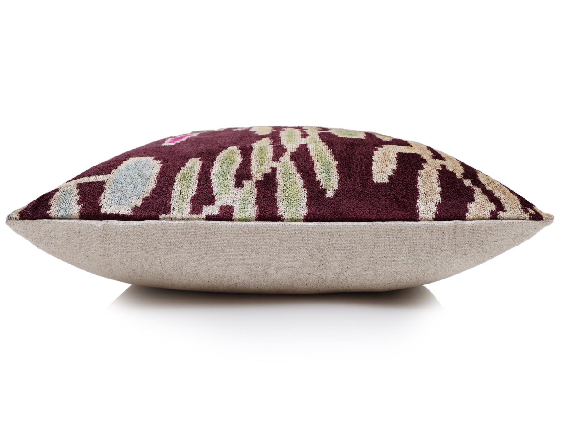 Crafted for refined interiors, this 20x20 inch luxury silk velvet pillow showcases an artisanal ikat pattern in rich burgundy, softened by cream, blush pink, muted gold, sage green, and pale blue accents. The design feels both painterly and architectural, offering depth, warmth, and movement without overwhelming a space.