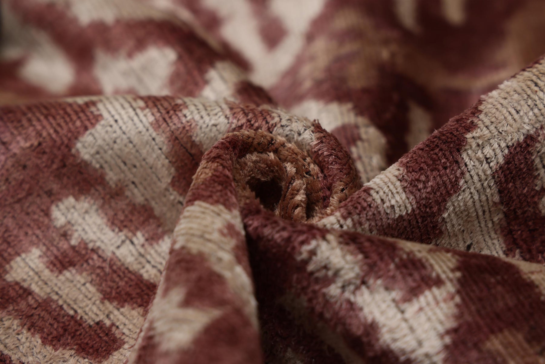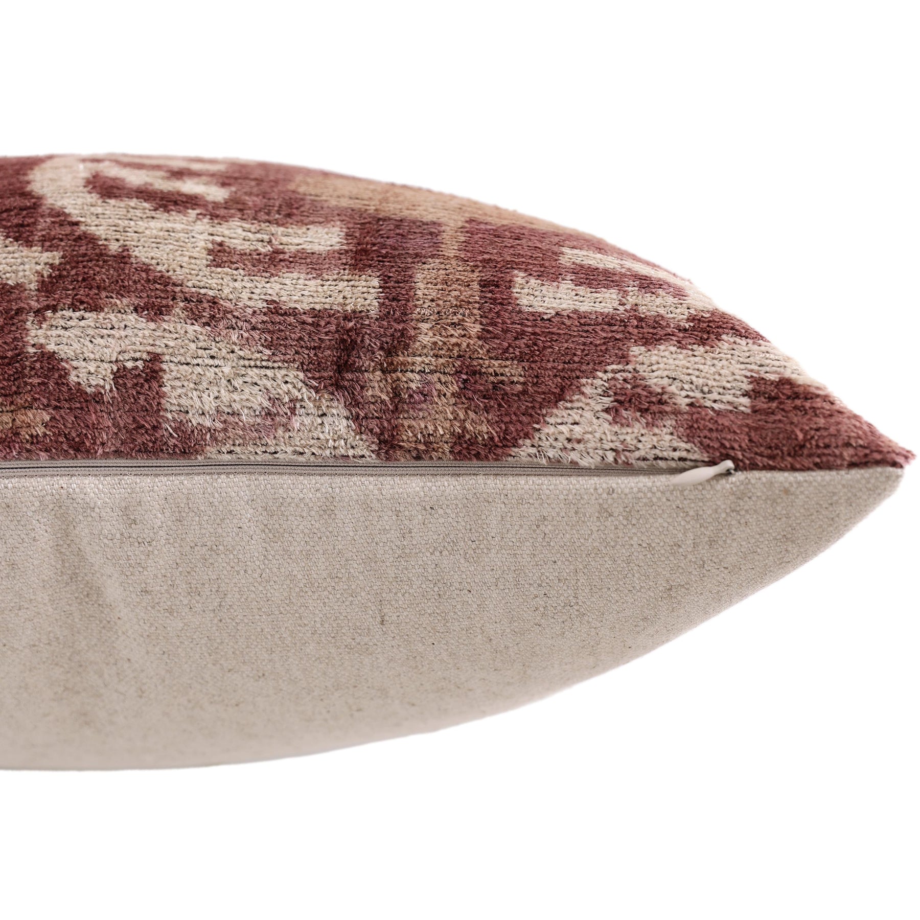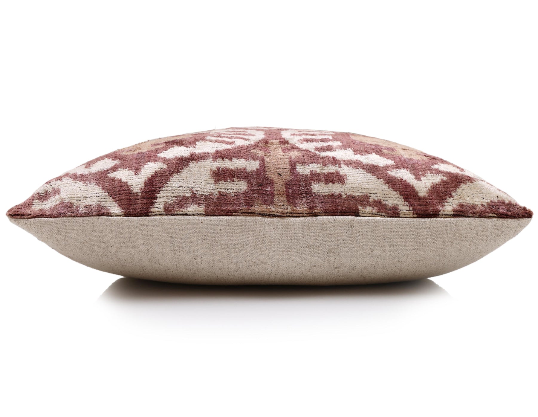 This luxury 20x20 inch throw pillow is handwoven from authentic silk velvet and finished with a timeless ikat-inspired pattern in rich burgundy, warm beige, and soft natural tones. The velvety surface reveals depth and movement as light shifts across the pile, highlighting the artisanal character of the weave.
