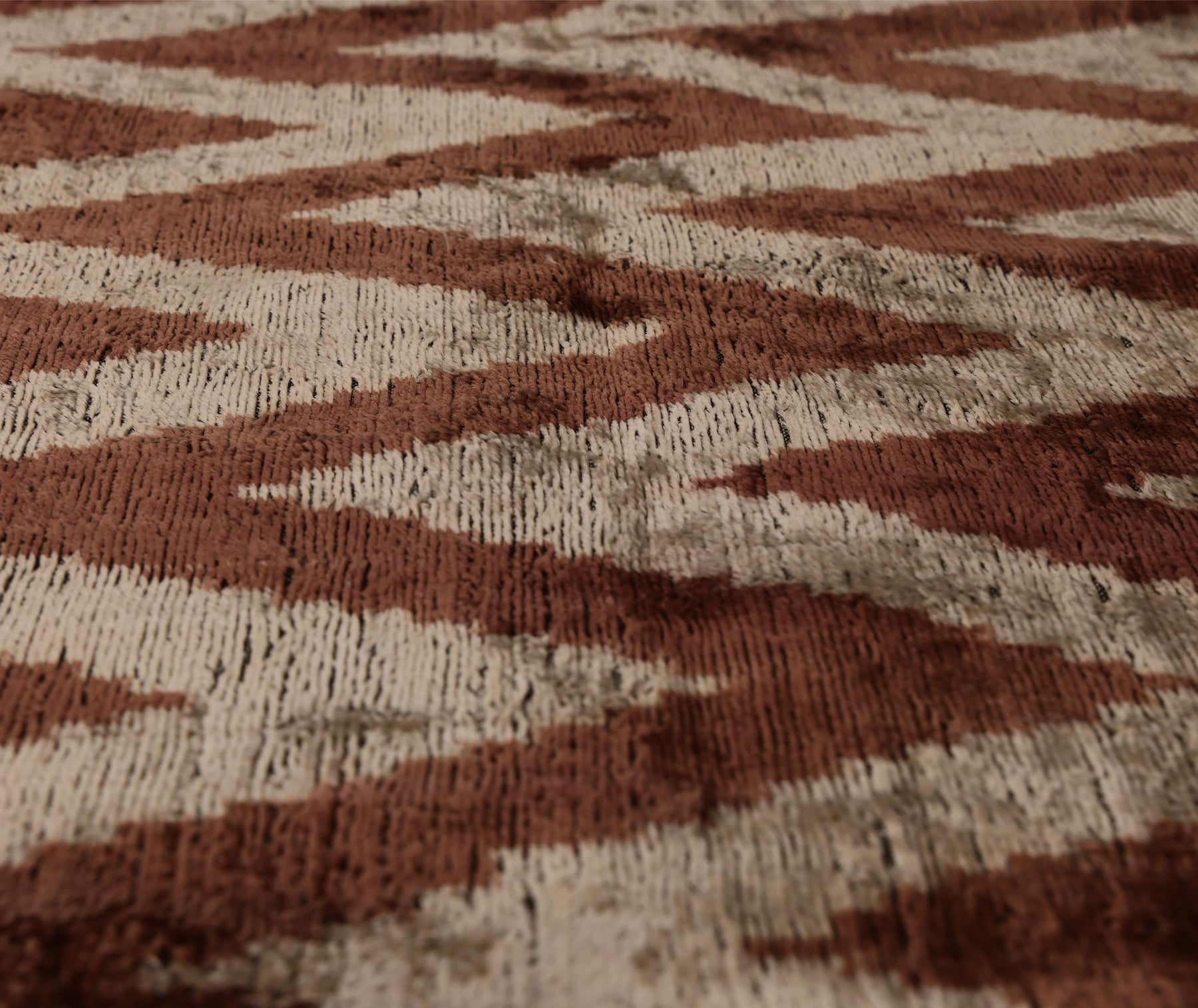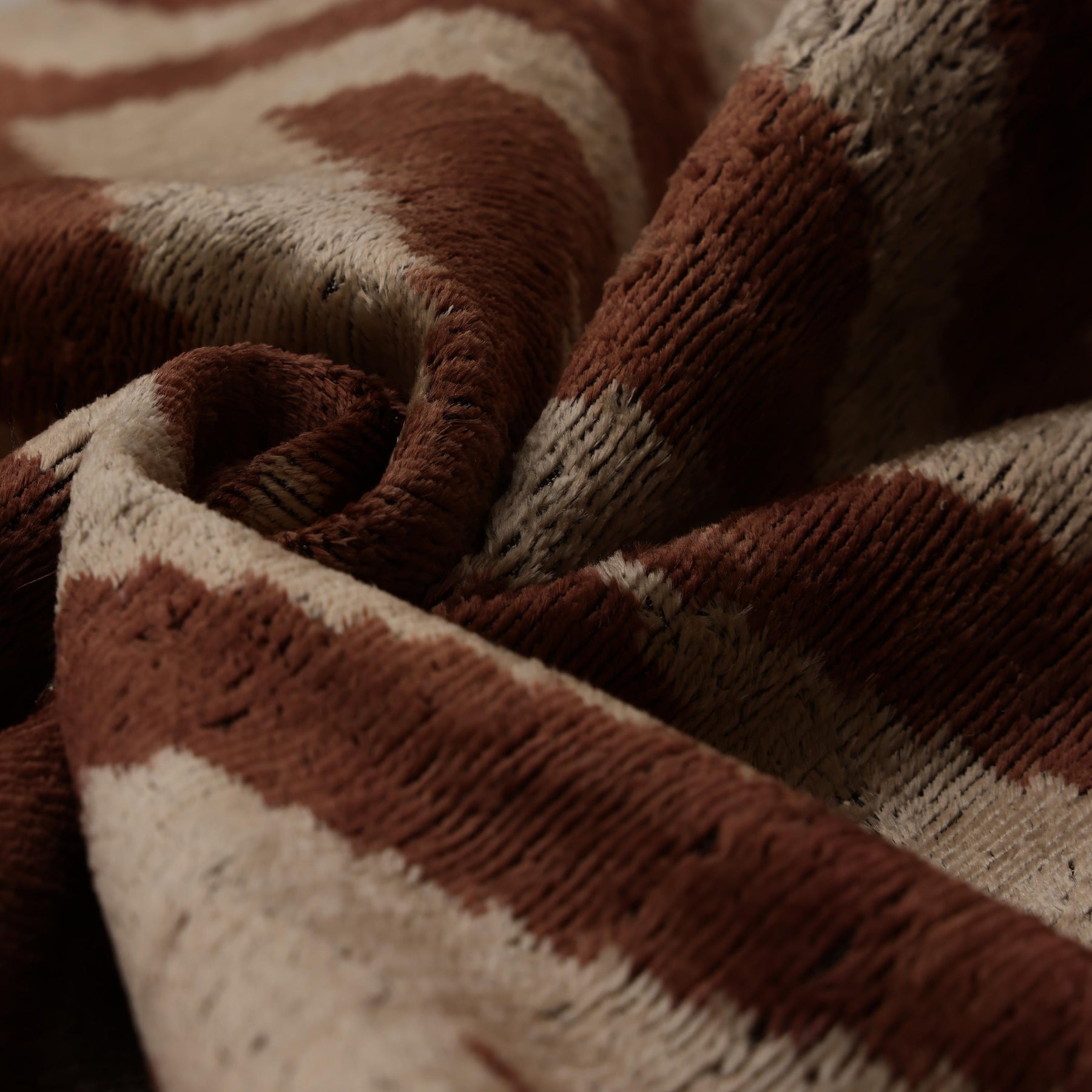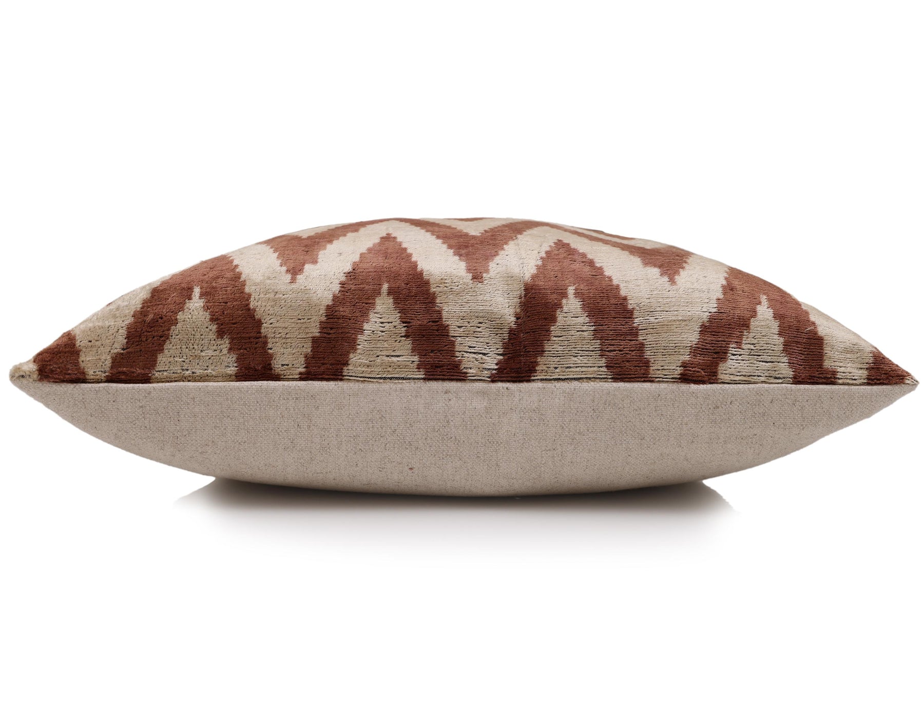 Infuse your home with the warmth of natural earth tones using this luxurious 20x20 inch silk velvet pillow. The design features a classic chevron or zig-zag pattern, softened by the traditional blurred edges of ikat weaving, rendered in a rich rust, terracotta, or burnt sienna hue against a creamy beige background.