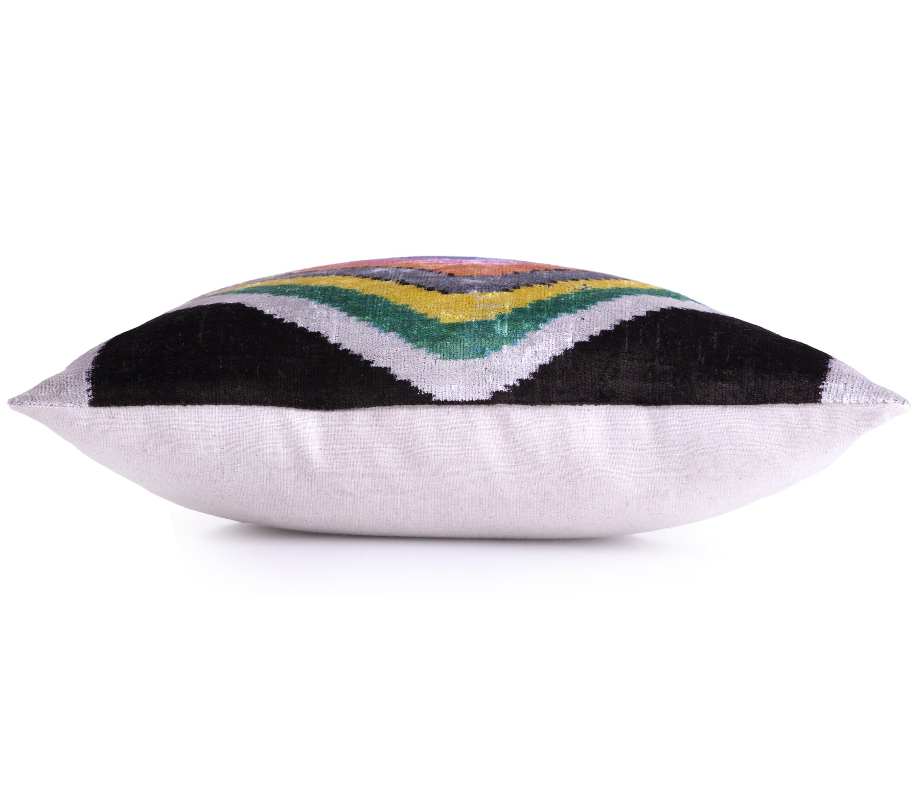 Make a statement with color and craftsmanship. Our 16x16 multicolor silk velvet throw pillow is a celebration of geometry and artistic vibrance, featuring chevron-inspired layers in shades of mint, blush, lavender, yellow, red, and blue—each enhanced by the natural glow of handwoven silk velvet.