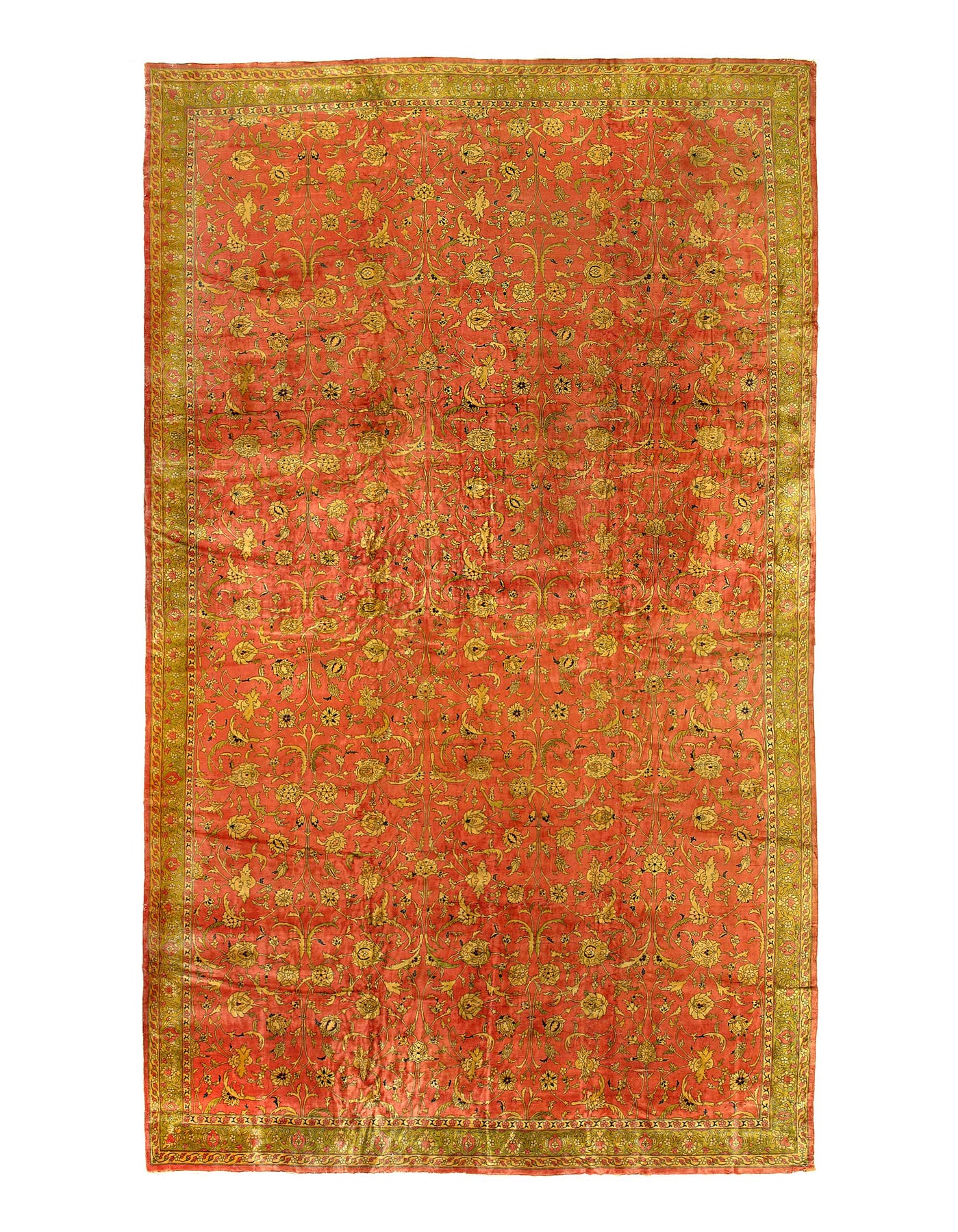 In the grand, classic Mughal tradition, a lush design of swaying vines, leaves, and palmettes undulates gracefully across the rich rose field of this superb antique Agra. A distinctive repeating pattern of palmettes flanked by sickle leaves comprises the main border, set against a light green and ground in pleasing contrast to the field. Seldom do late nineteenth-century Agra’s capture so well the effect and presence of the classical Mughal carpets that inspired them.