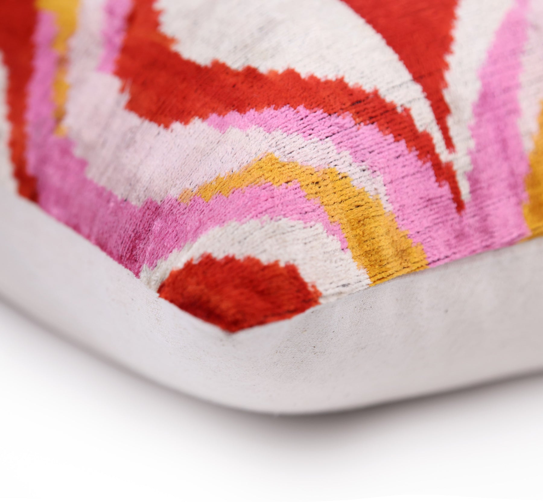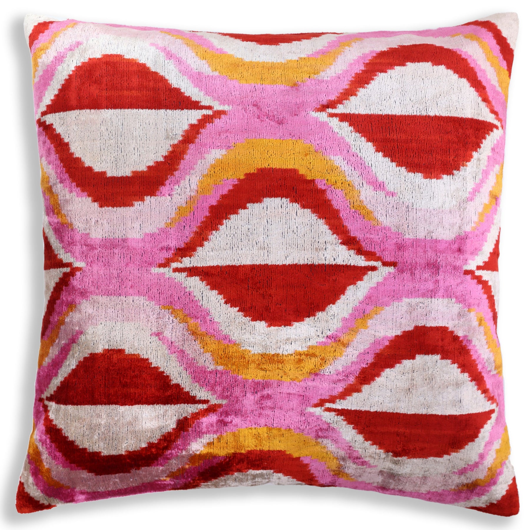 Vivid and playful, this pink and red silk velvet pillow adds an irresistible burst of color and texture to any interior. The rhythmic wave design captures the essence of movement and modern luxury, making it perfect for eclectic, mid-century, or maximalist spaces. Pair with solid velvet cushions or metallic accents for a sophisticated yet artistic composition