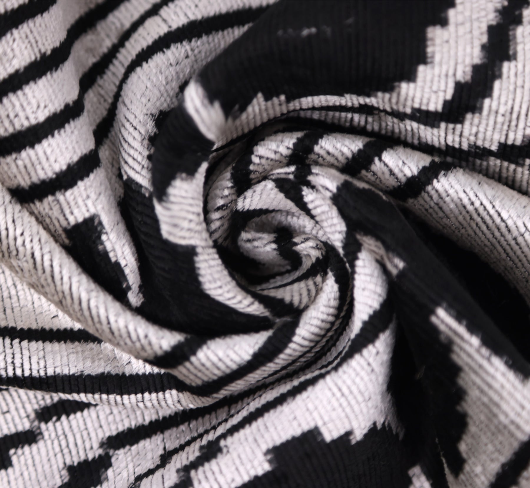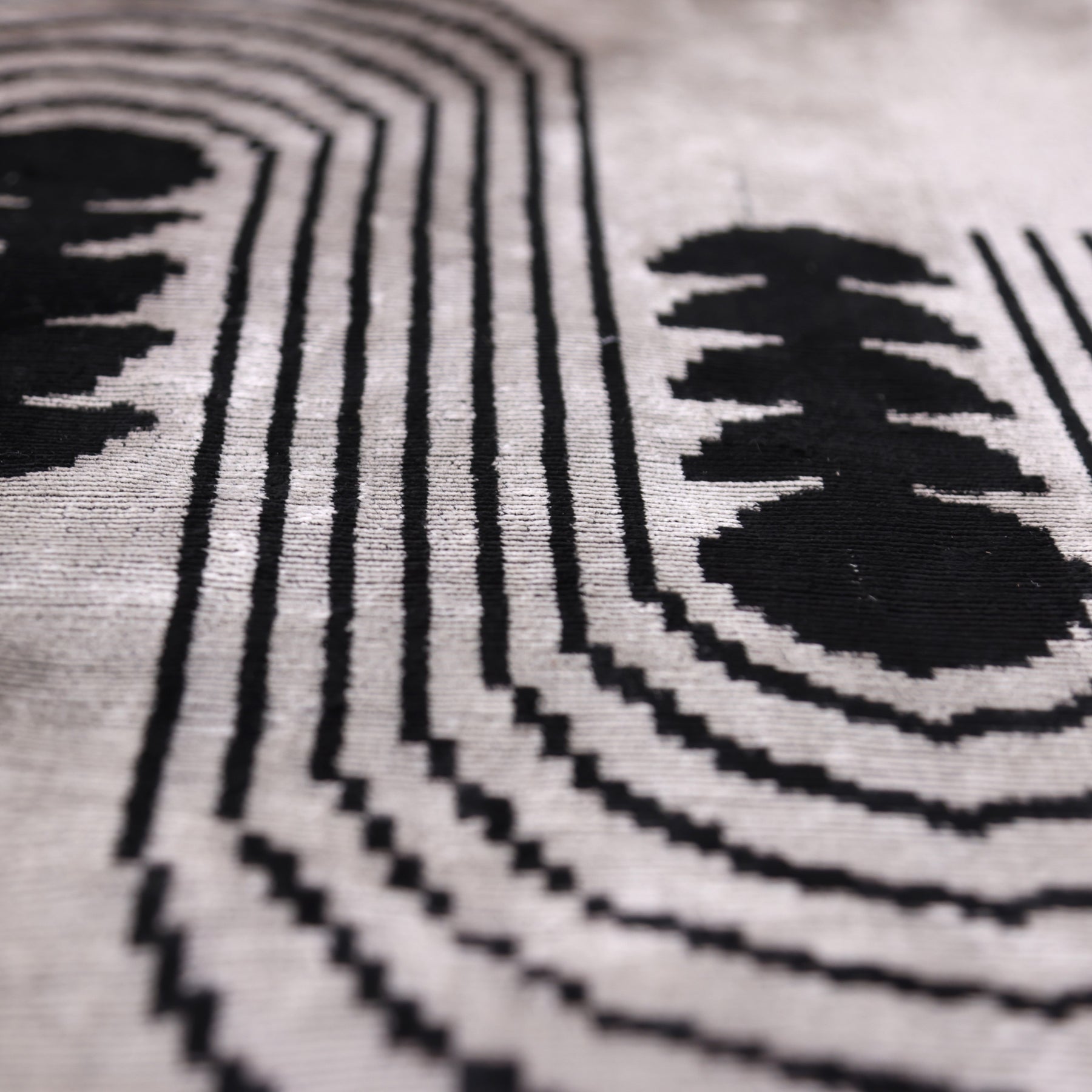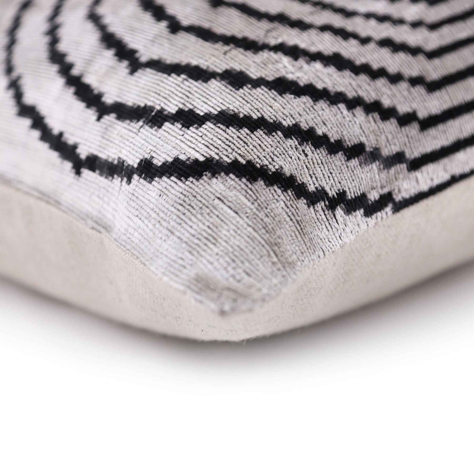 This 16x24 handmade silver and black velvet lumbar pillow strikes the perfect balance between sophistication and bold design. Crafted from handwoven silk velvet, it features a shimmering silver backdrop with striking black geometric patterns, making it a powerful statement piece in any interior. The premium feather insert ensures both comfort and luxury, while the artisanal craftsmanship guarantees uniqueness and quality.