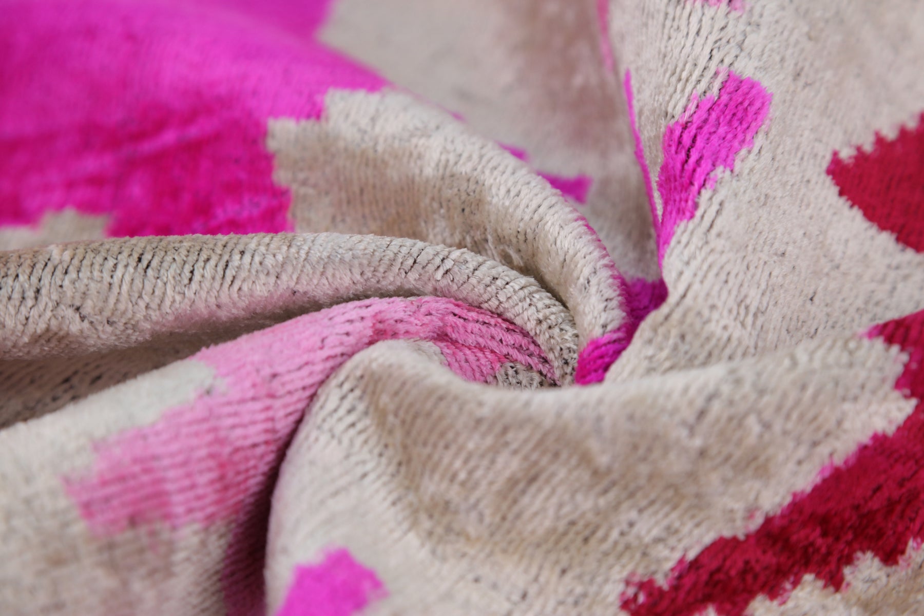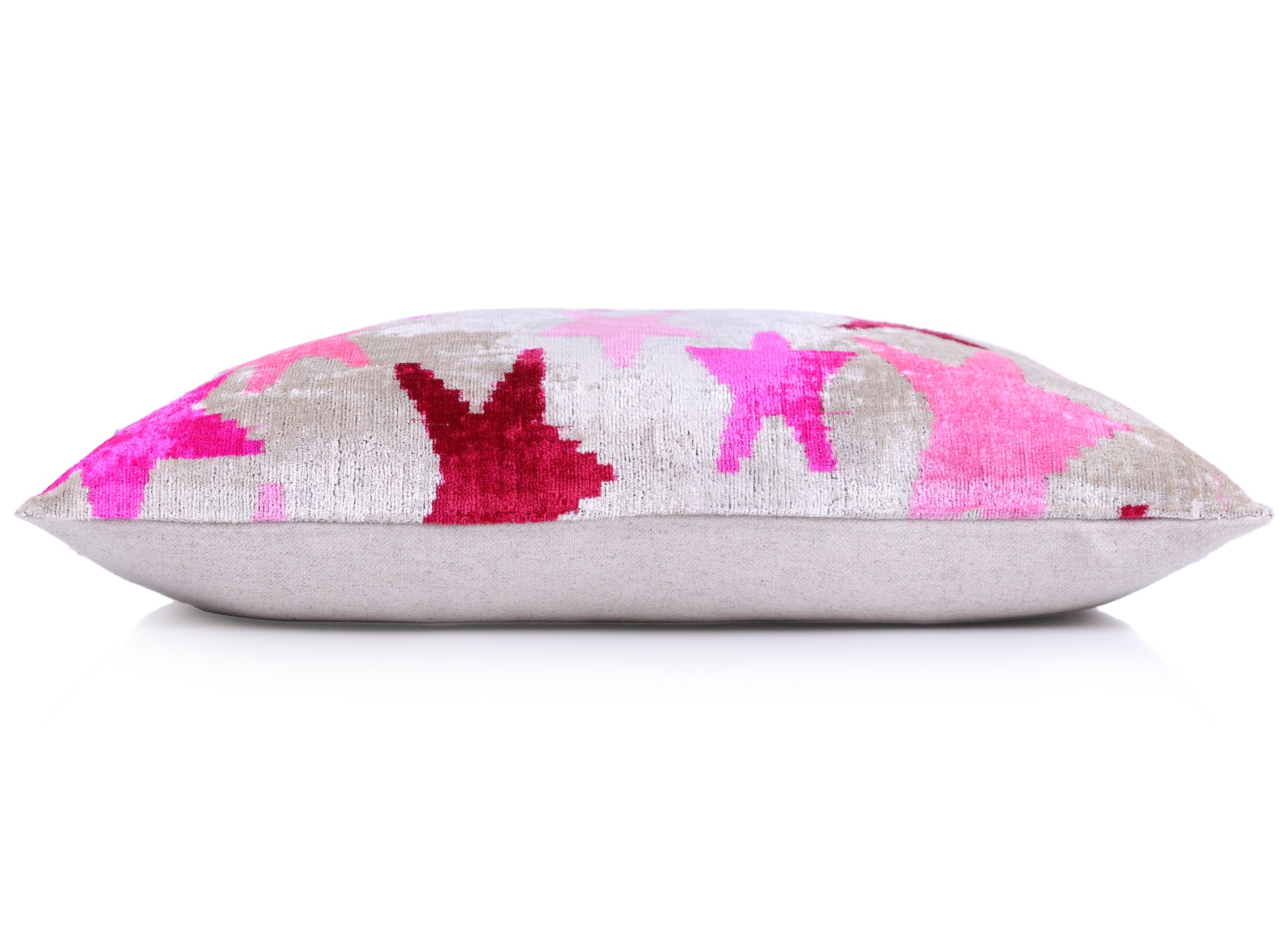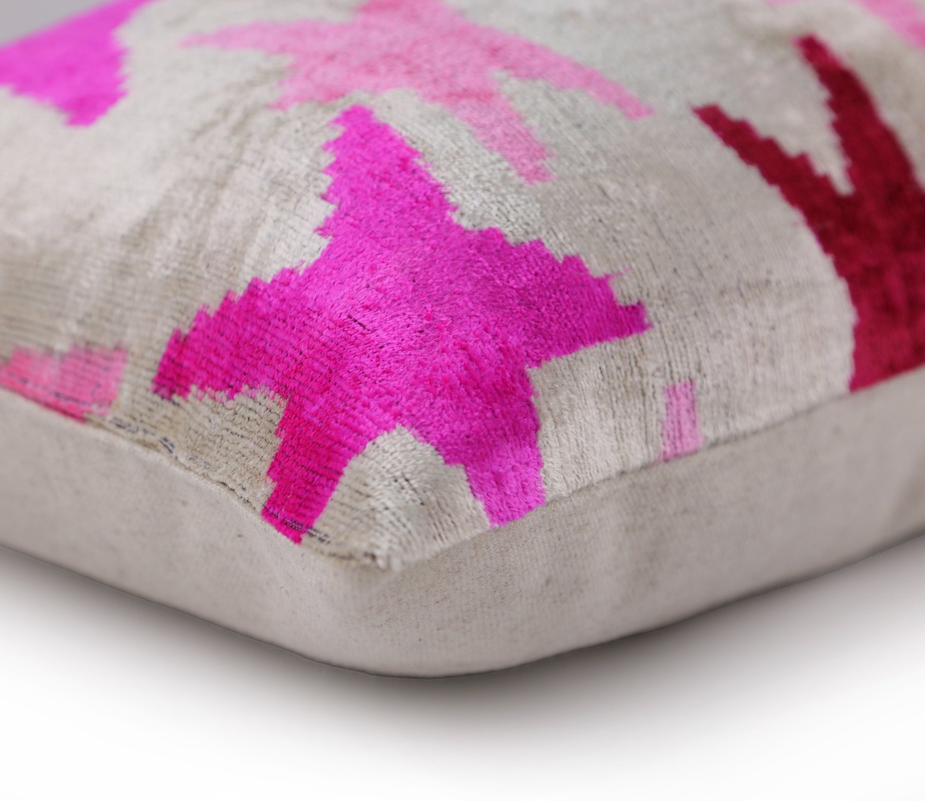 Bring a burst of vibrant elegance into your space with this luxurious handmade throw pillow. Designed in California and crafted from authentic silk velvet sourced from Turkey and Uzbekistan, each piece is a celebration of craftsmanship and color. The unique starburst ikat design—rendered in bold fuchsia, raspberry, and soft pink—pops against a champagne beige background, making it a standout accent in both modern and bohemian interiors.