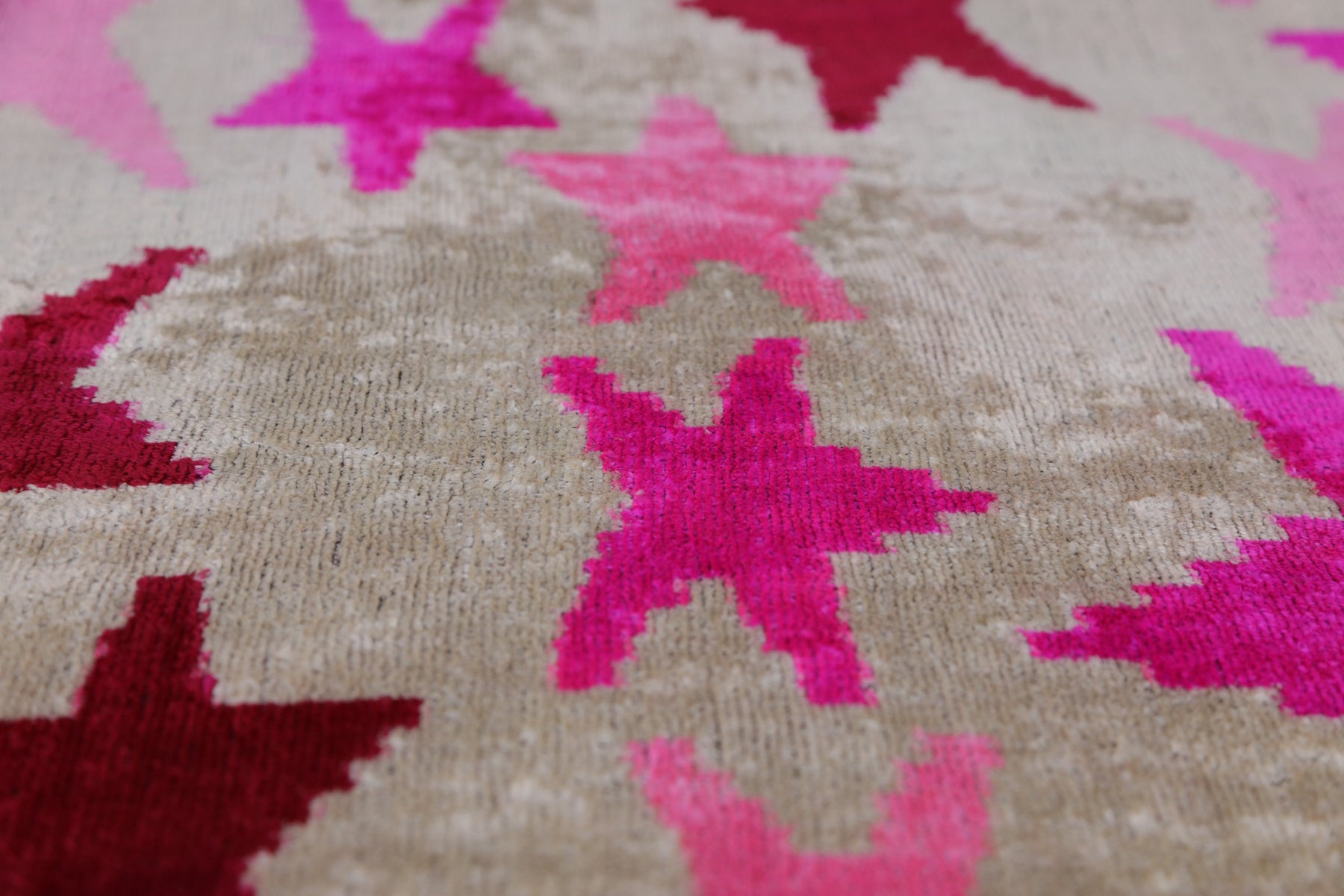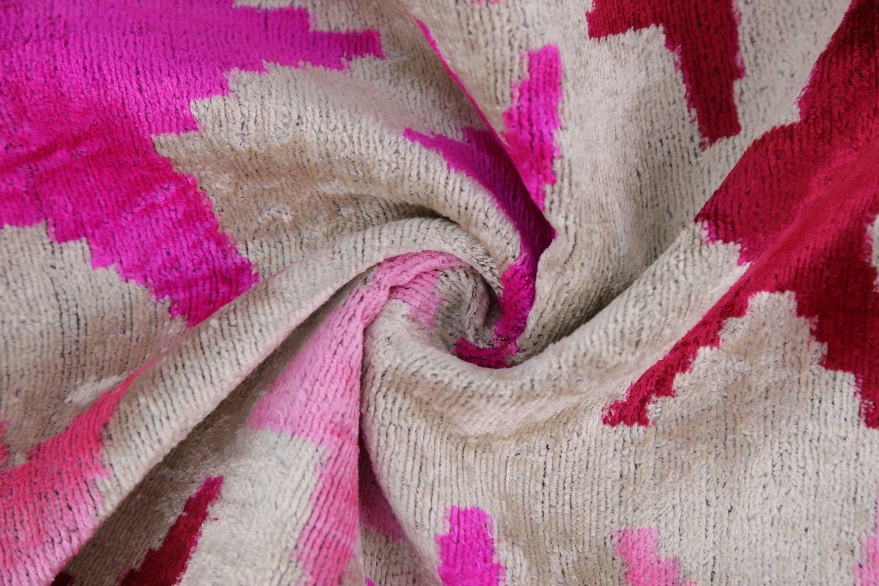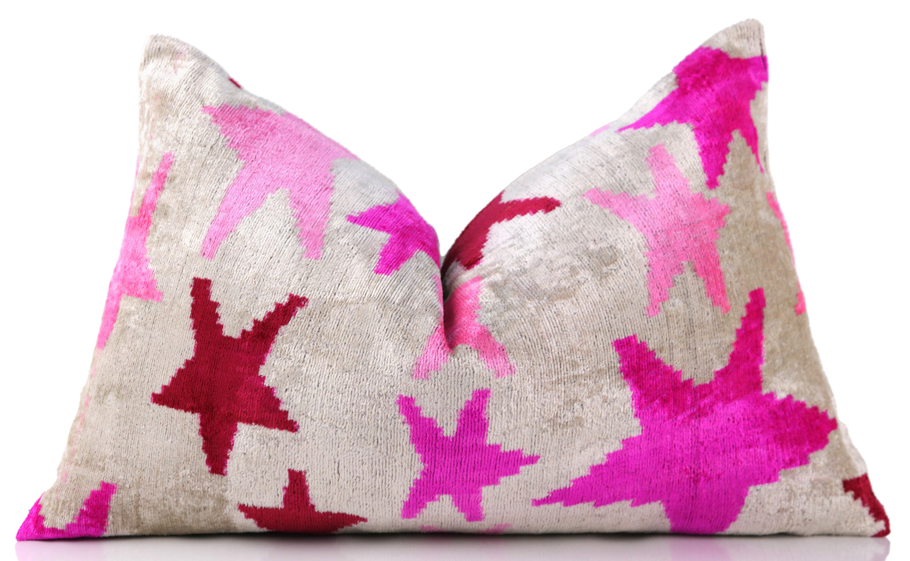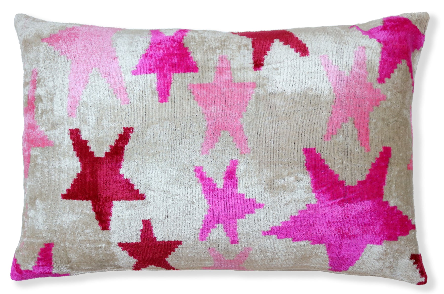 Bring a burst of vibrant elegance into your space with this luxurious handmade throw pillow. Designed in California and crafted from authentic silk velvet sourced from Turkey and Uzbekistan, each piece is a celebration of craftsmanship and color. The unique starburst ikat design—rendered in bold fuchsia, raspberry, and soft pink—pops against a champagne beige background, making it a standout accent in both modern and bohemian interiors.