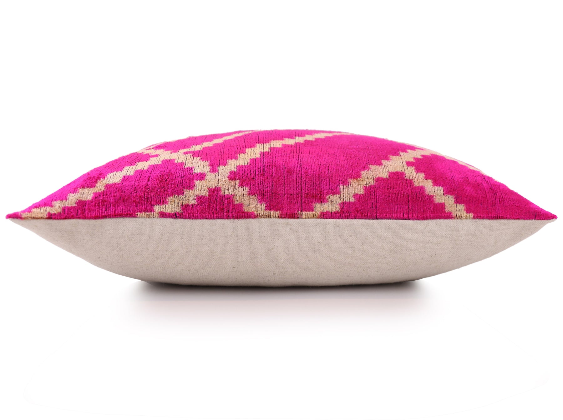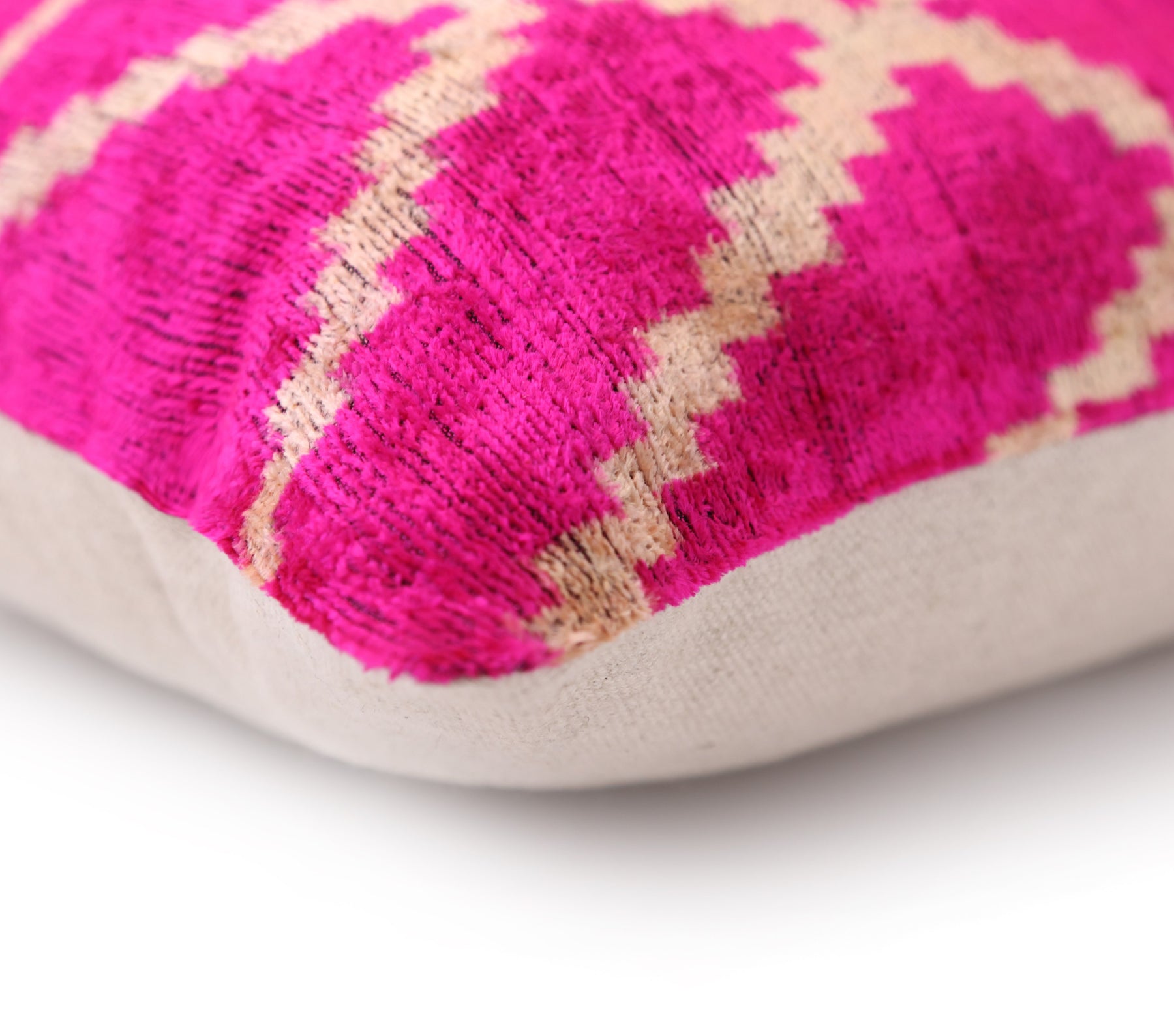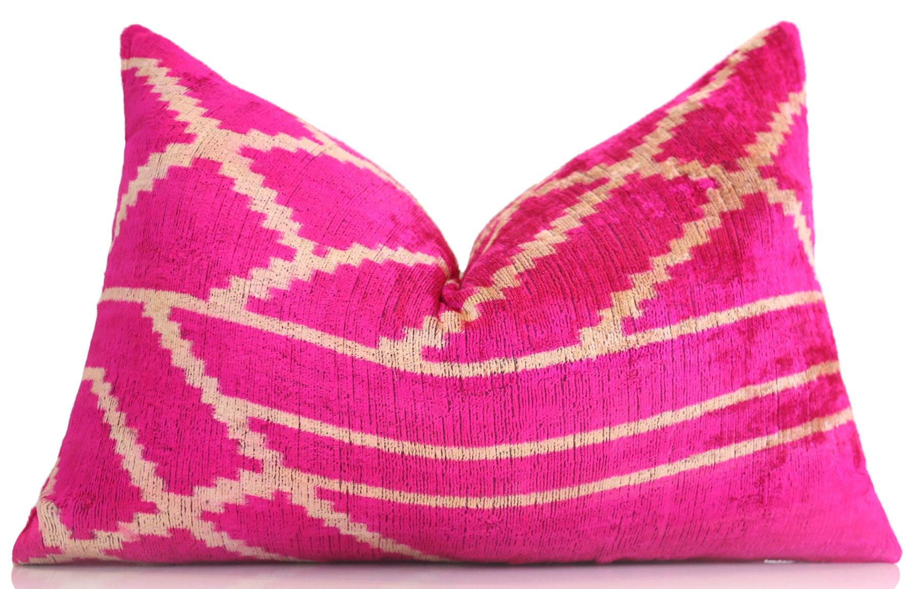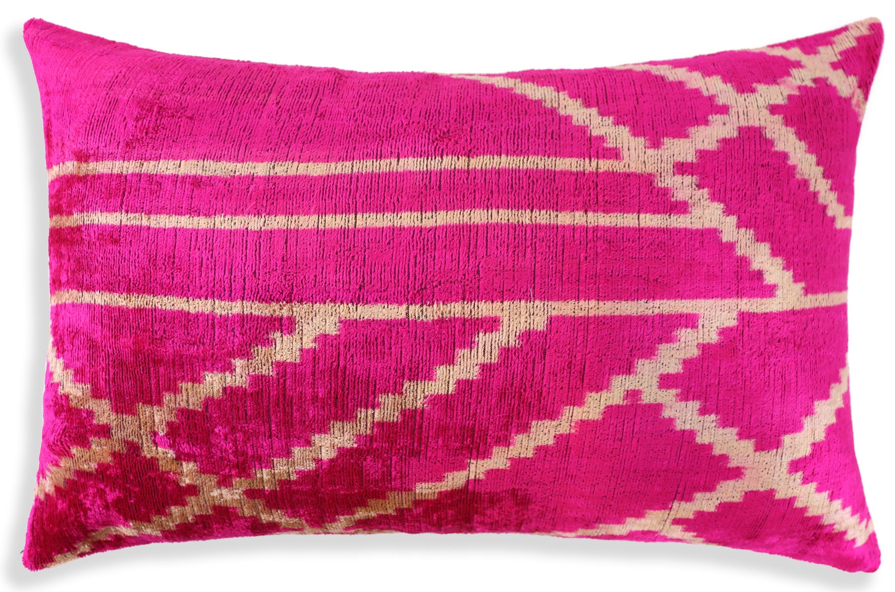 Turn up the vibrancy in your space with this luxury silk velvet throw pillow in an electrifying fuchsia tone, accented with champagne-gold geometric lines. Handmade from vegetable-dyed silk velvet and finished with a plush feather insert, this 16x24 lumbar pillow delivers both luxurious comfort and designer impact. A striking addition to sofas, beds, or accent chairs, it’s the perfect way to add a touch of modern glamour to your décor.