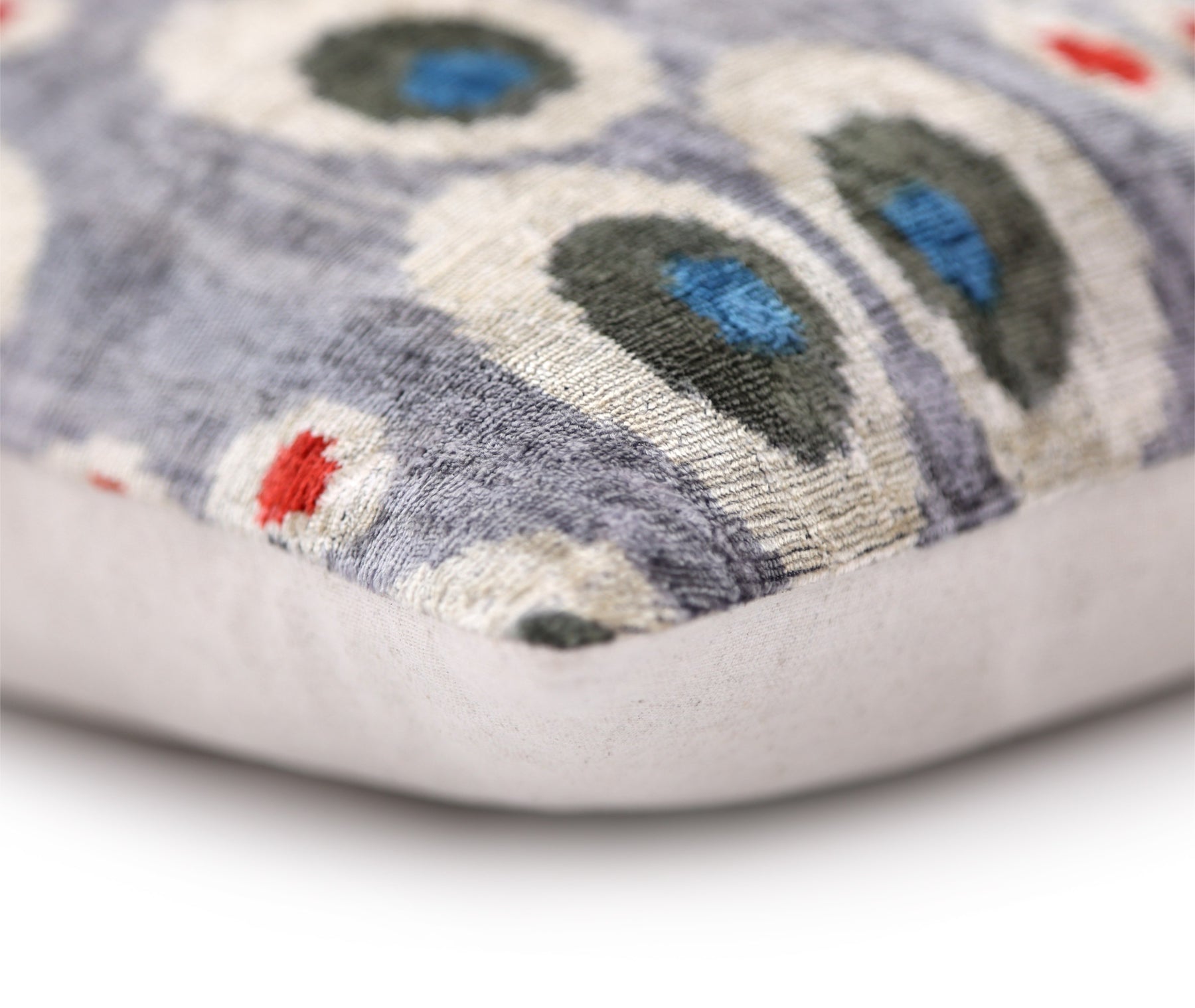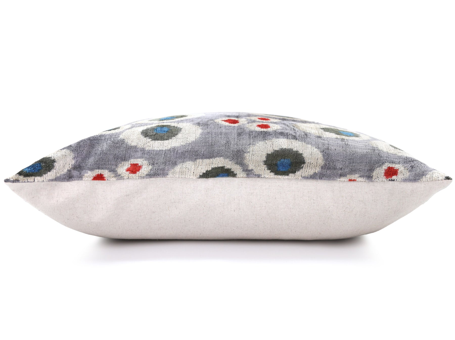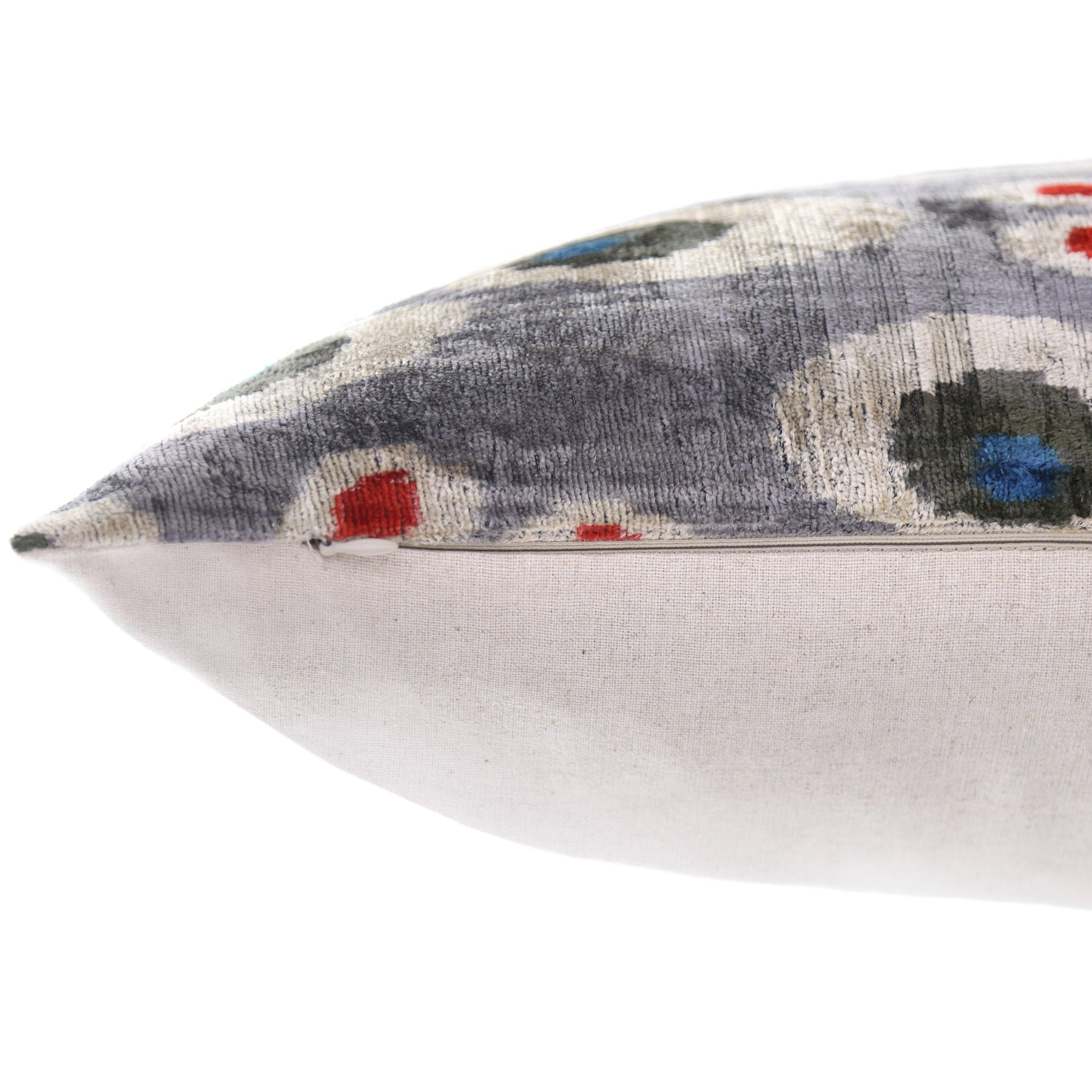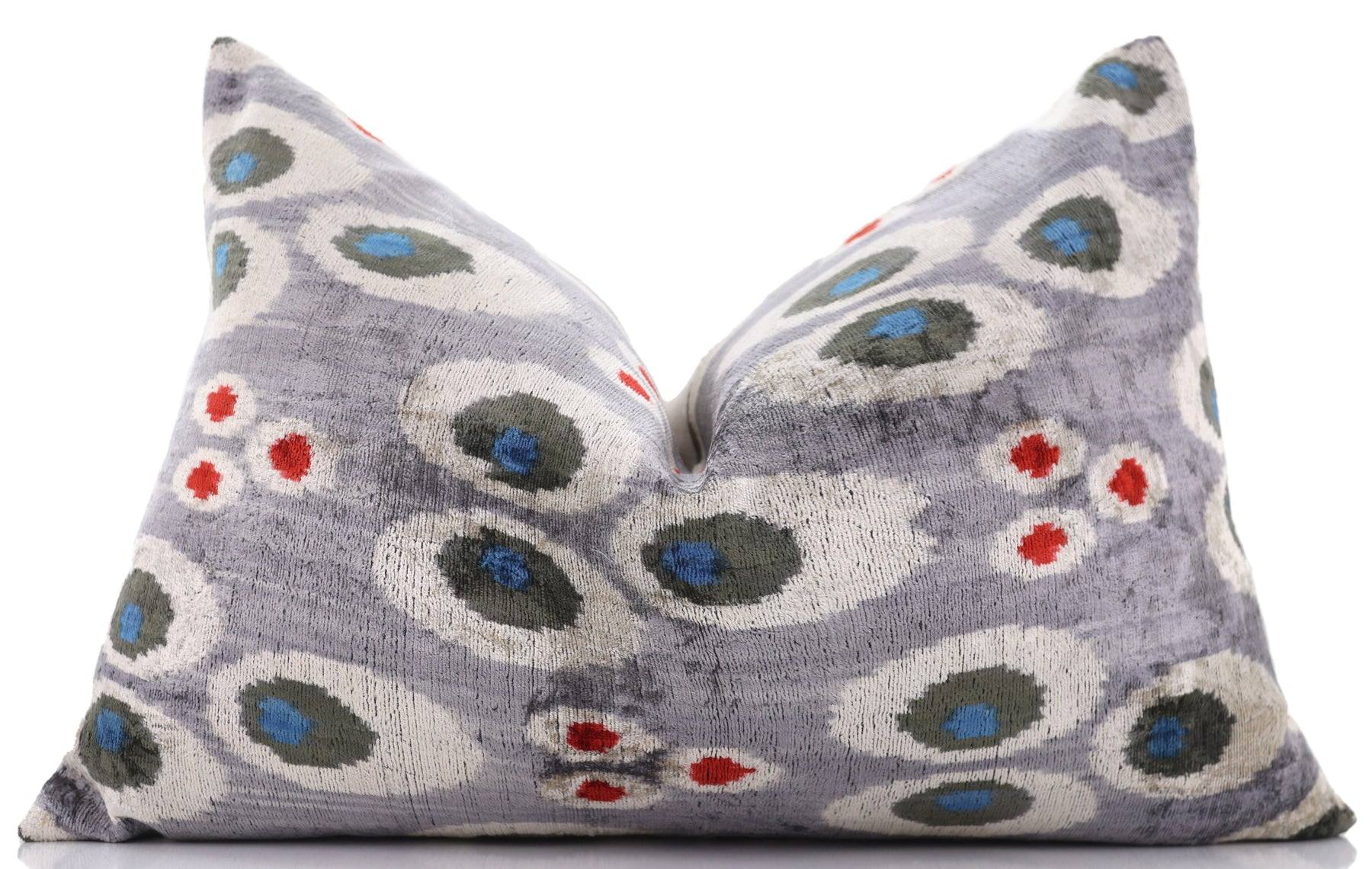 Introduce bold artistry to your interiors with this 16x24 luxury gray silk velvet pillow, featuring handwoven abstract circle motifs in white, slate gray, cobalt blue, and vibrant red. The contrast of colors creates a dynamic visual rhythm, balancing playful modernity with timeless craftsmanship.