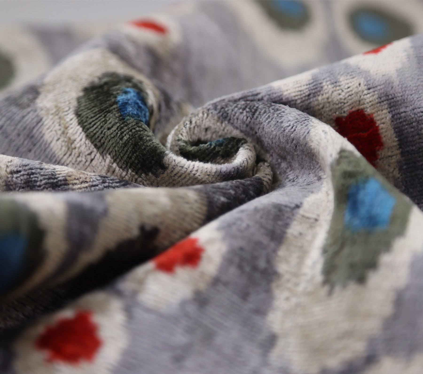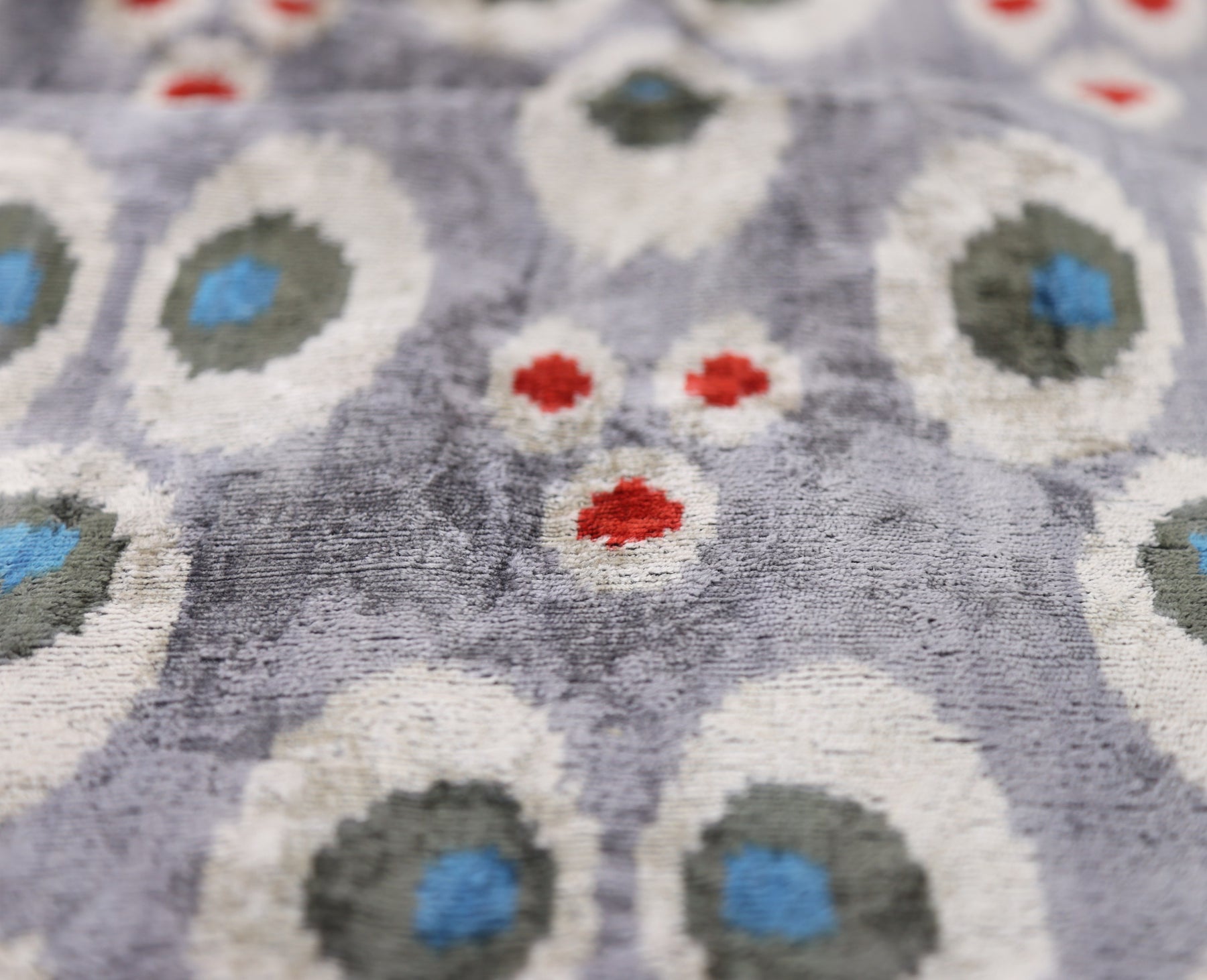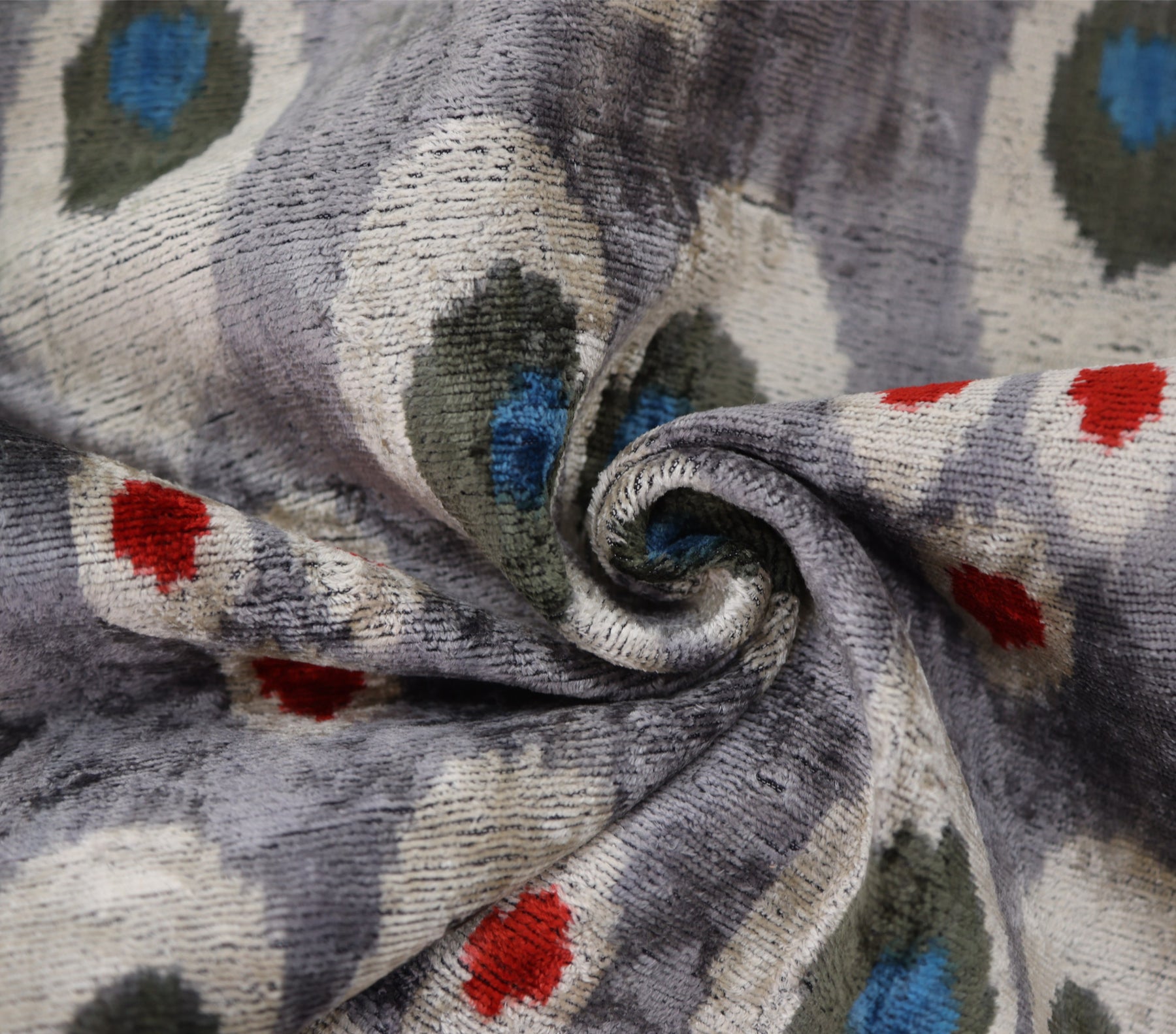 Handwoven silk velvet with abstract circle patterns in gray, white, blue, and red