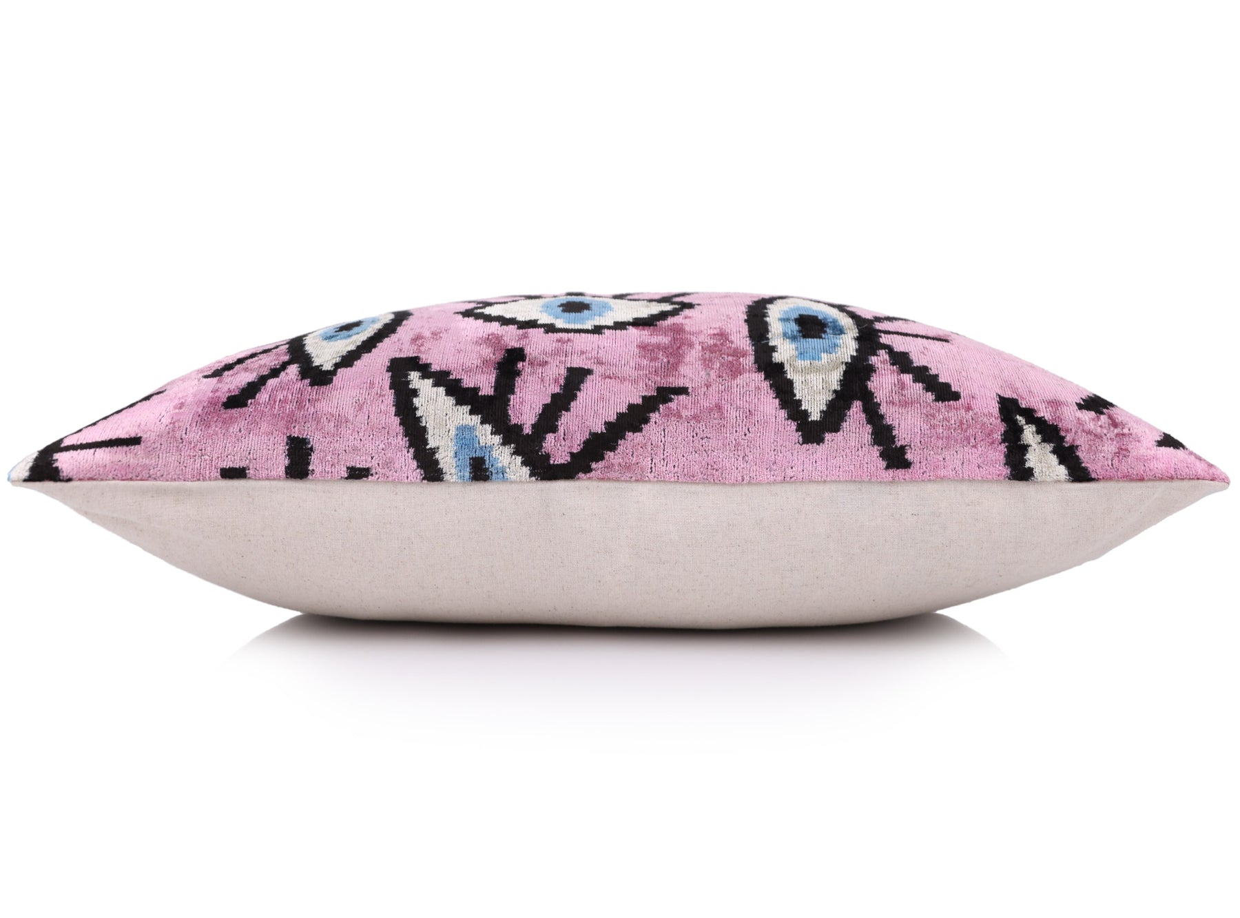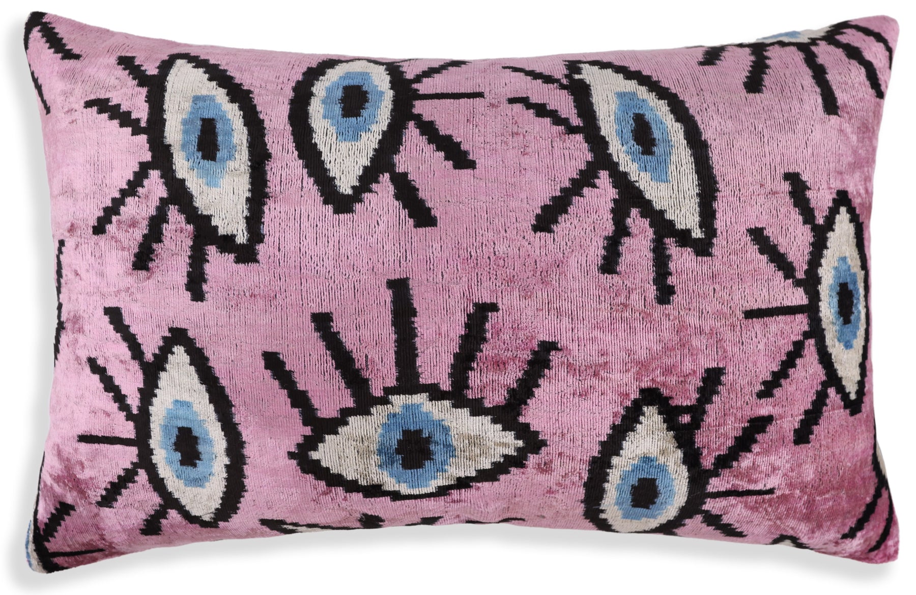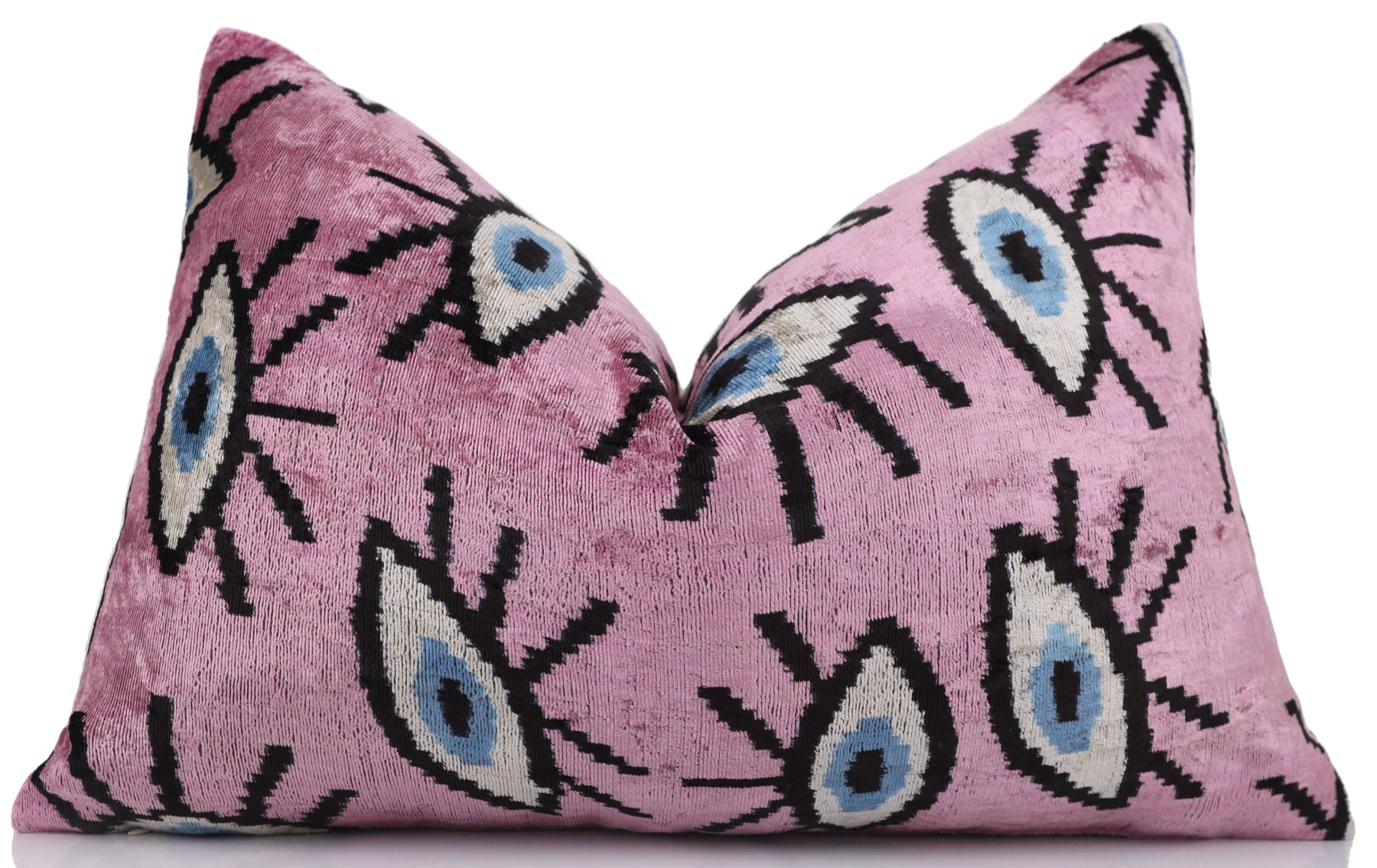 Infuse your home with bold symbolism and vibrant style with this 16x24 handmade pink velvet pillow featuring a striking evil eye motif. Traditionally a symbol of protection, the eye design is reinterpreted here in modern luxury form, with handwoven silk velvet dyed in shades of soft pink, icy blue, ivory, and black.