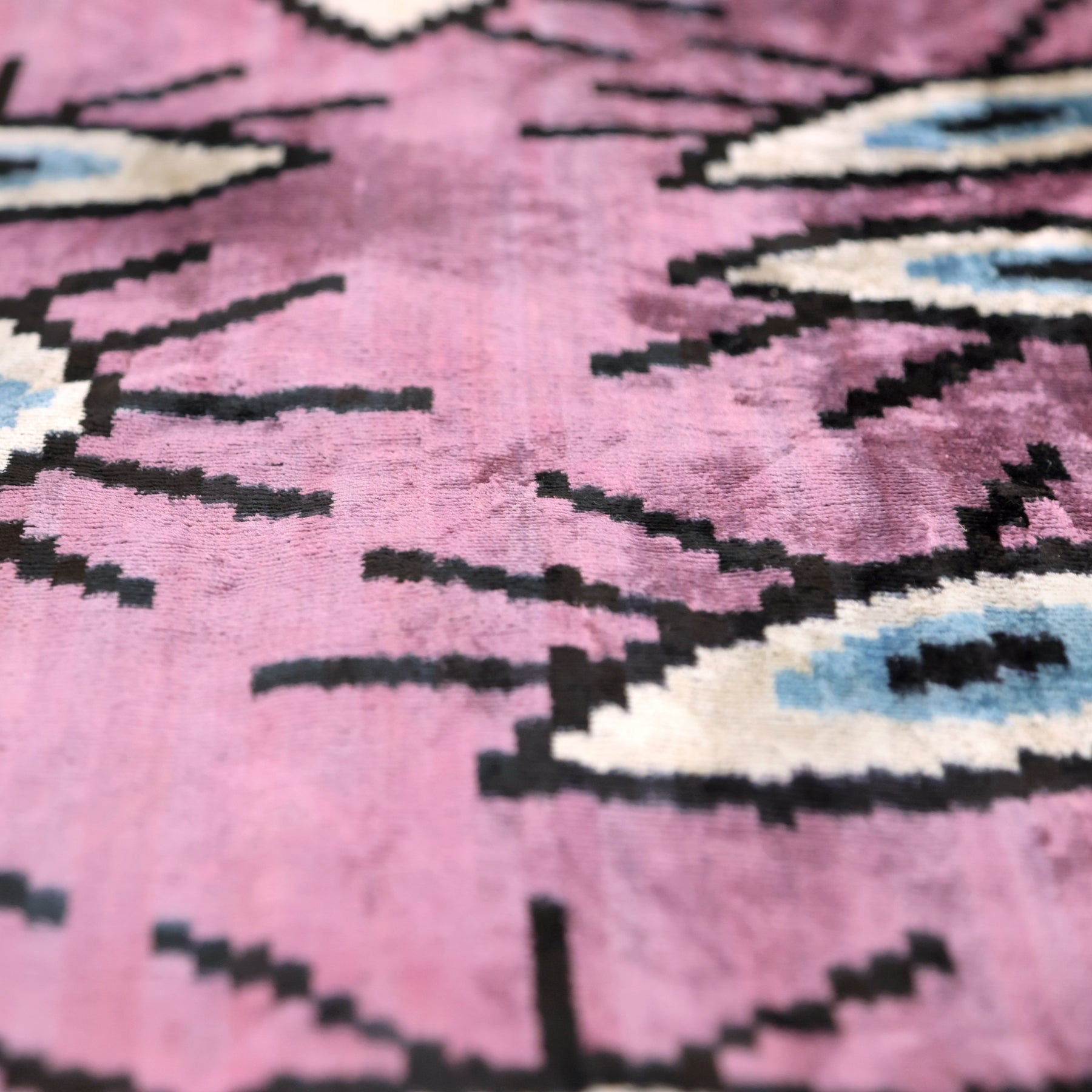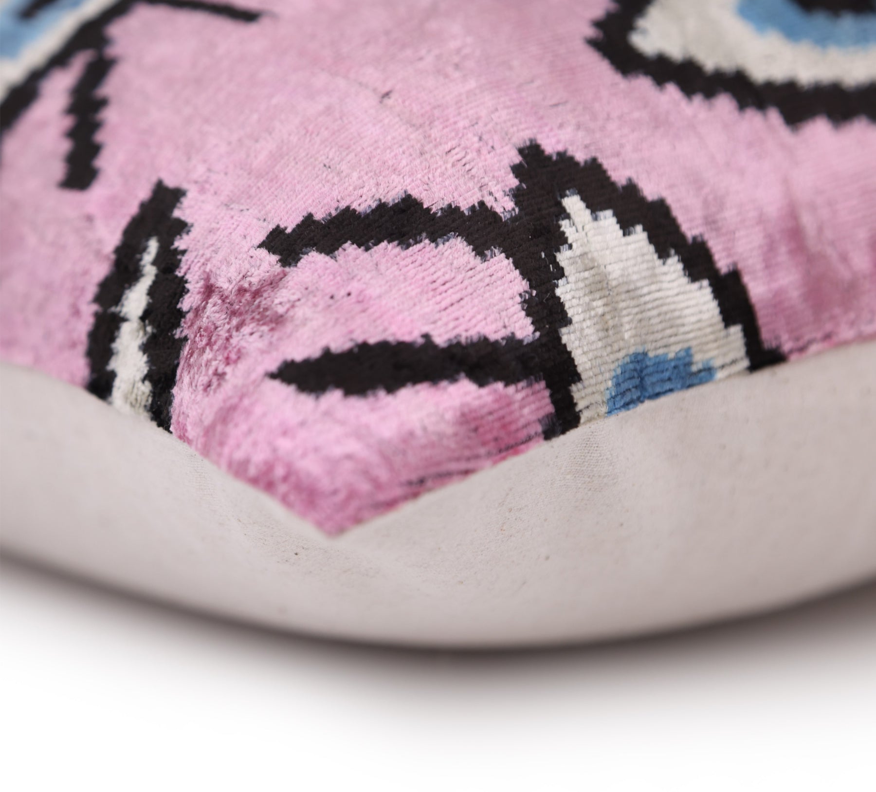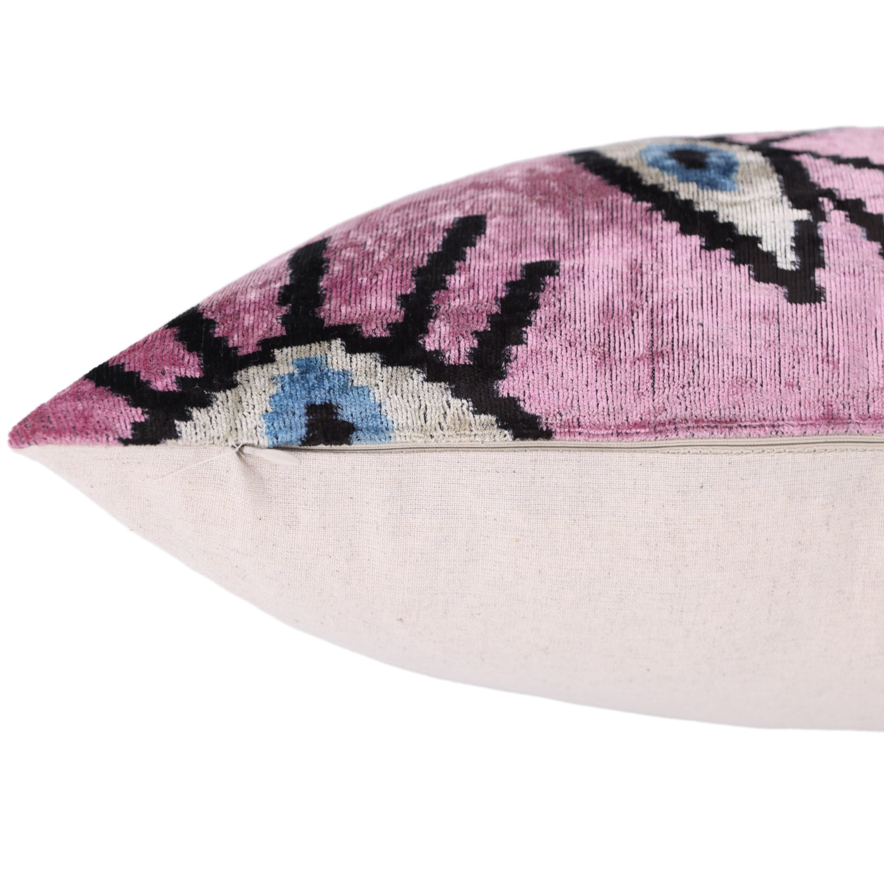 Infuse your home with bold symbolism and vibrant style with this 16x24 handmade pink velvet pillow featuring a striking evil eye motif. Traditionally a symbol of protection, the eye design is reinterpreted here in modern luxury form, with handwoven silk velvet dyed in shades of soft pink, icy blue, ivory, and black.