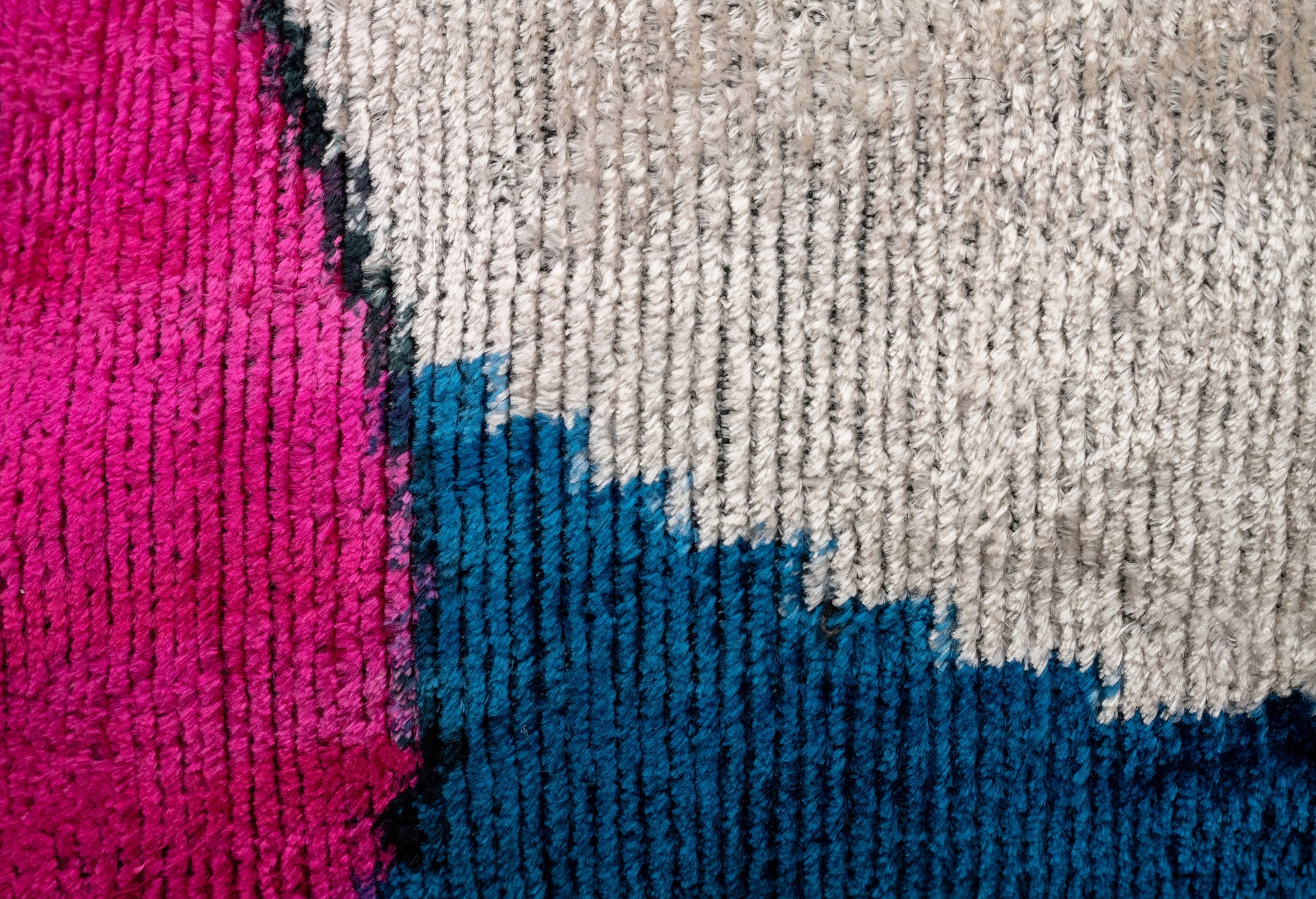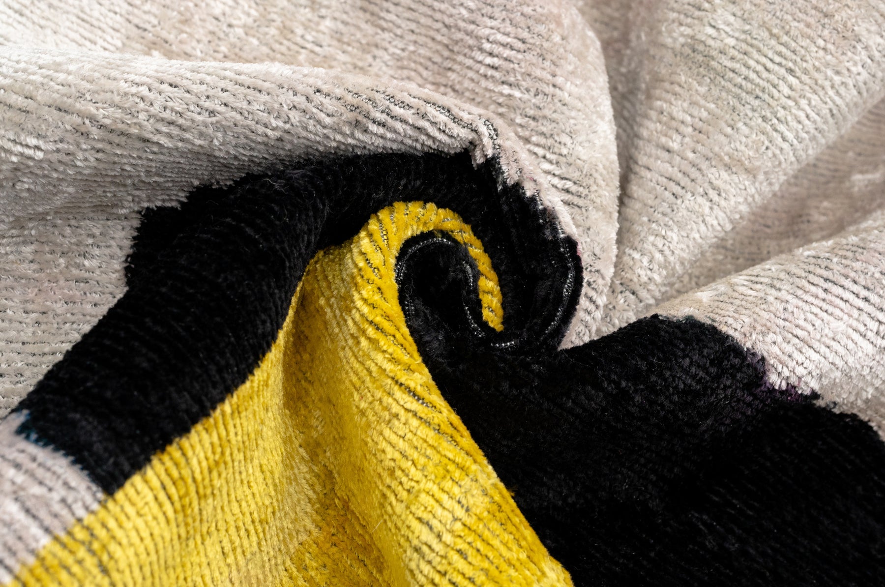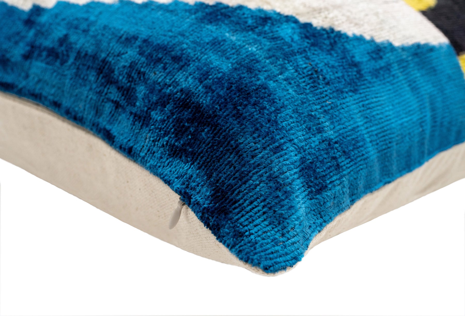 A bold expression of artistry and texture, this abstract silk velvet pillow transforms any room into a gallery-worthy space. Vibrant tones of yellow, fuchsia, ivory, and deep blue blend harmoniously for a truly modern aesthetic. Style it with solid jewel-toned pillows or neutral linens to create a dynamic yet balanced look.