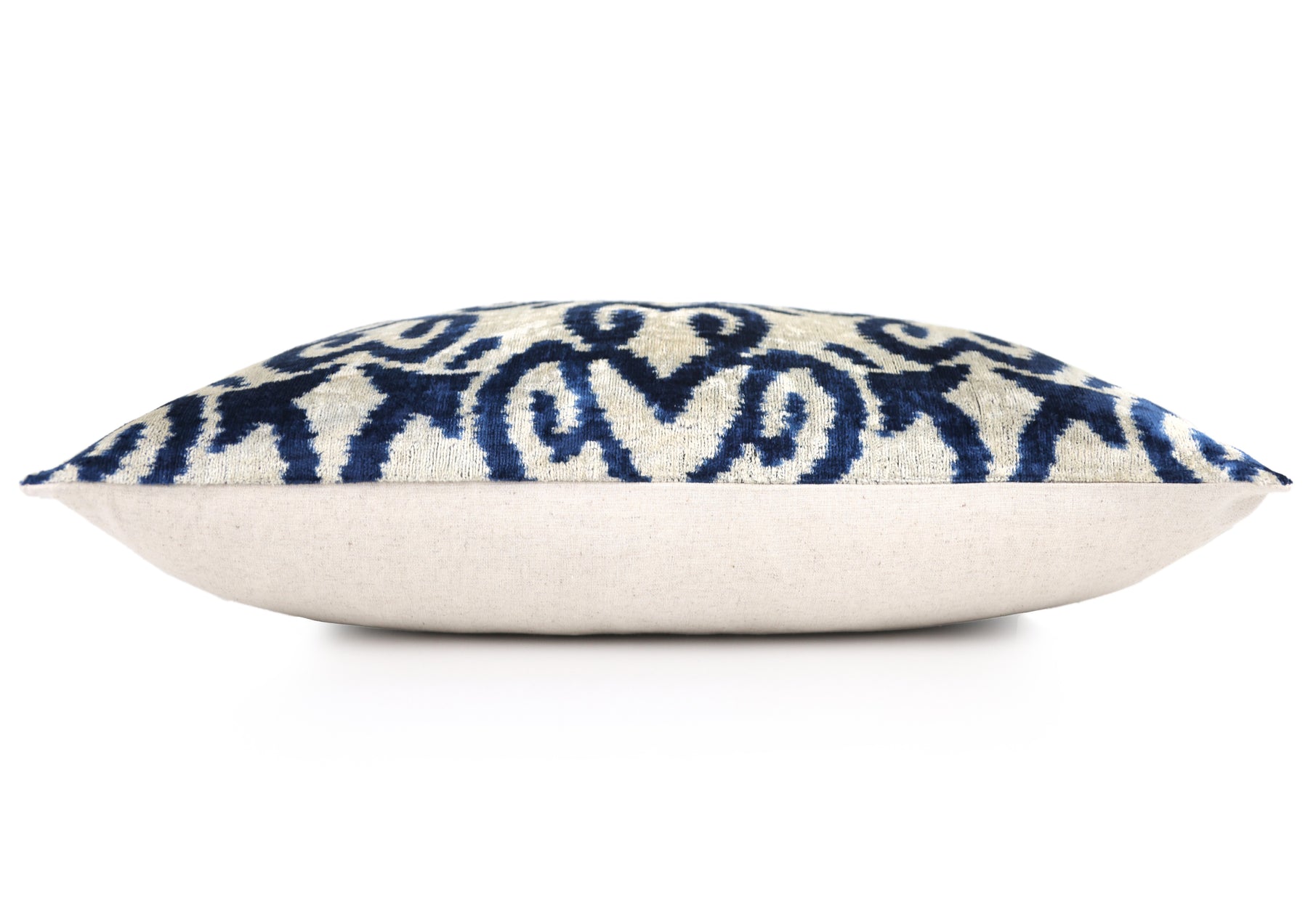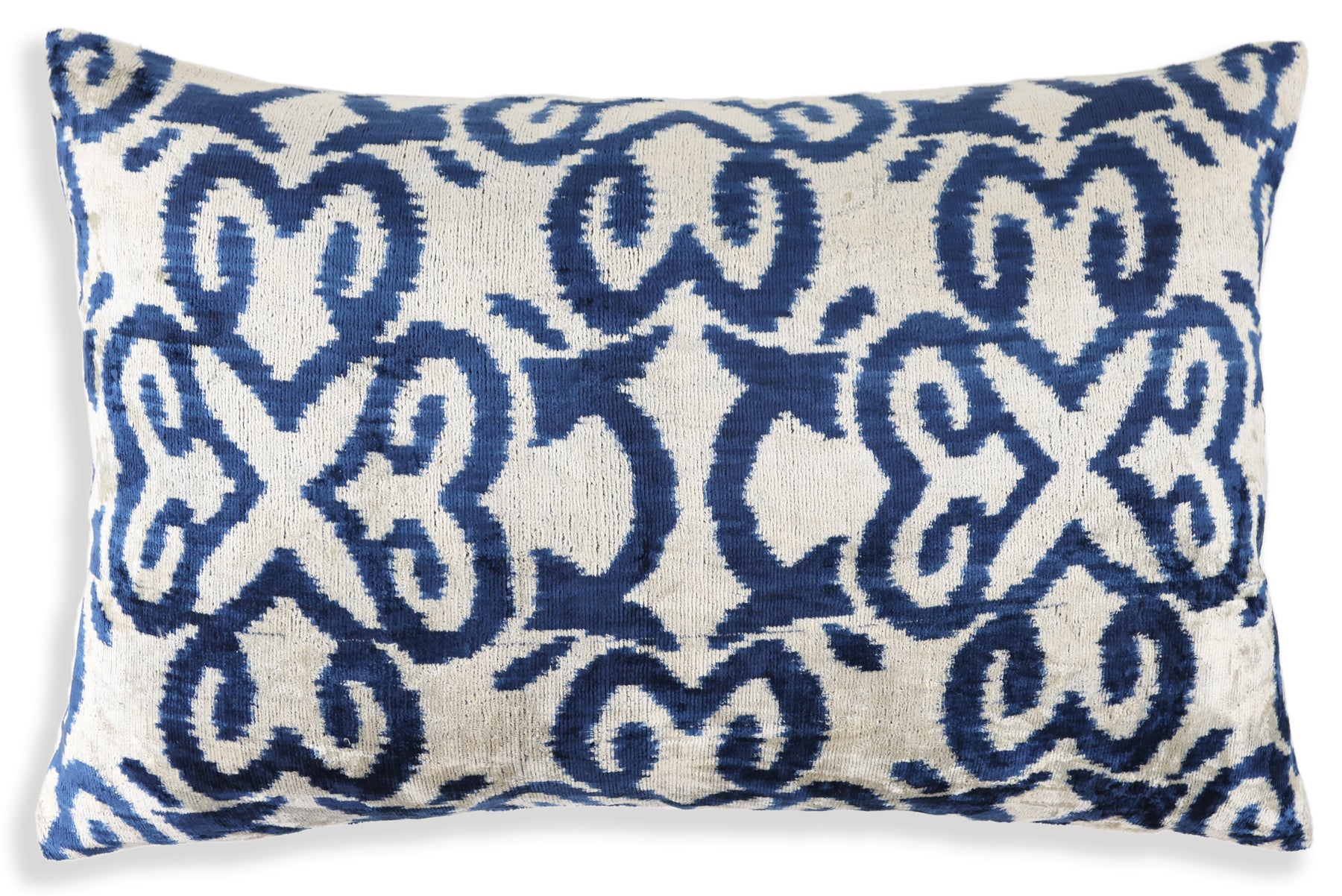 Elegant and timeless, the Handmade Navy Ikat Velvet Pillow brings global sophistication into any space. Measuring 16x24 inches (40x60 cm), this decorative pillow features a symmetrical navy blue Ikat motif on a creamy ivory background—woven from silk velvet by master artisans in Turkey and Uzbekistan.