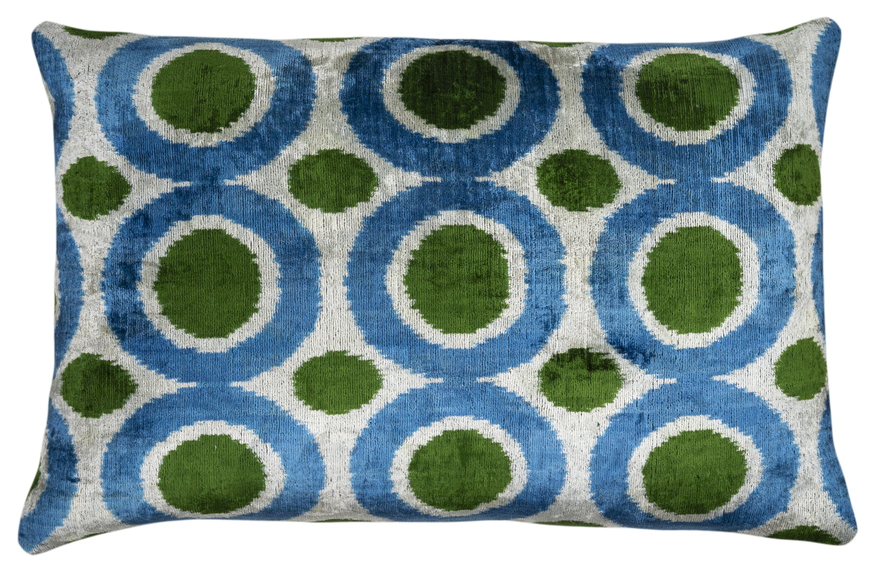 Bring bold energy and artisan craftsmanship into your home with this luxurious handmade velvet pillow, featuring a striking circular motif in fresh green, cobalt blue, and ivory. Designed for interiors that balance creativity and sophistication, this pillow makes an unforgettable visual statement while offering the softness and quality of authentic silk velvet.