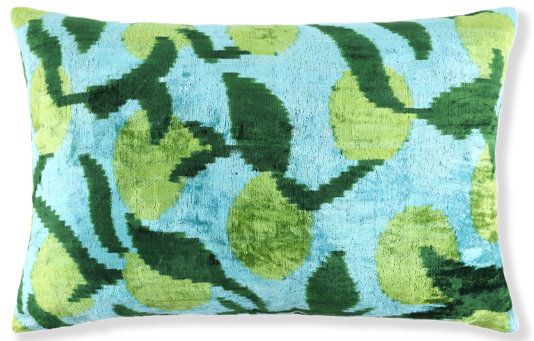 Celebrate the calming power of nature with this artisan-made velvet throw pillow, inspired by the beauty of modern botanicals. A serene blend of aqua blue, forest green, and light chartreuse, the design features abstract leaf shapes that feel organic yet contemporary — creating a sense of freshness, renewal, and high-style comfort.