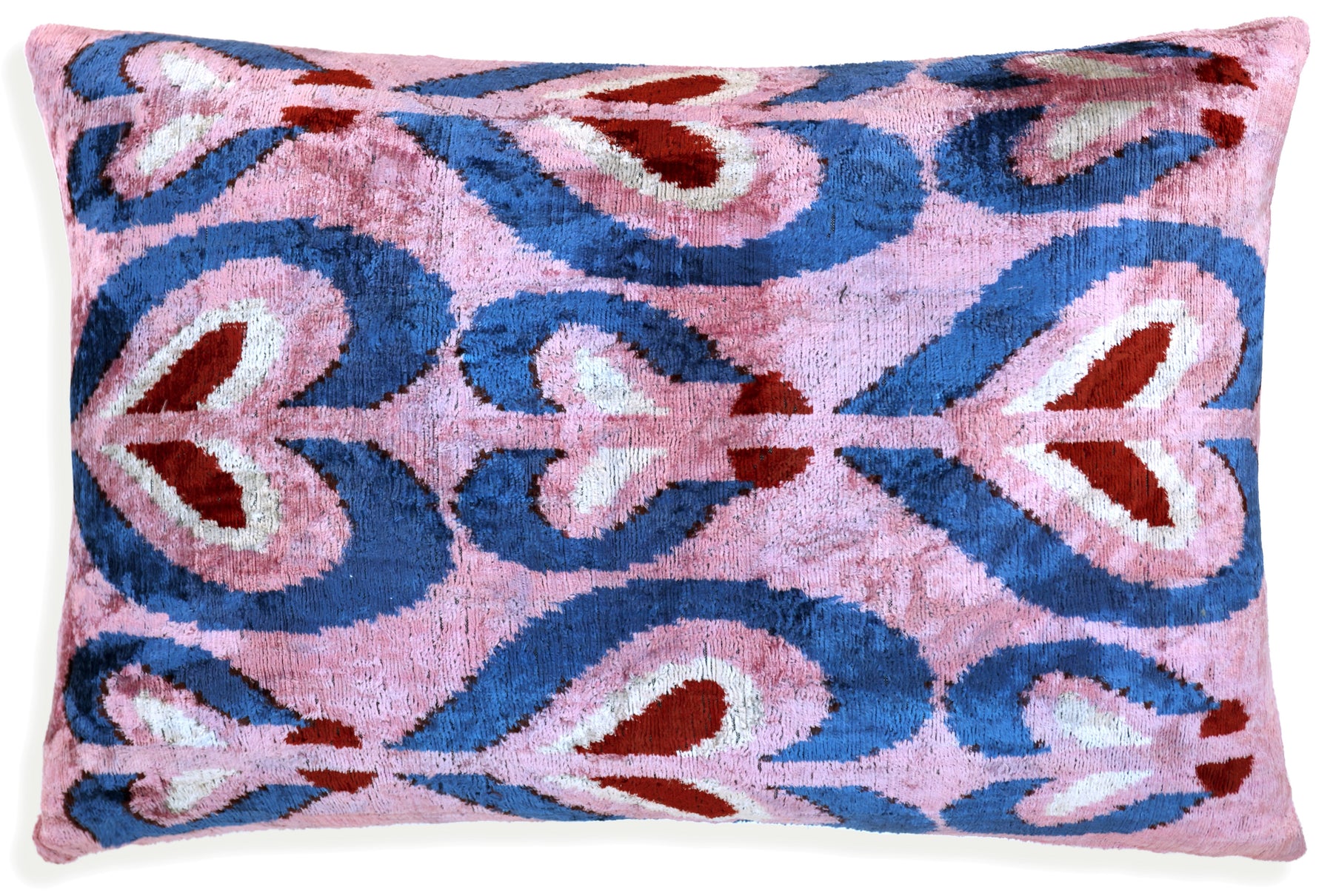 Celebrate bold romance and artistic craftsmanship with this luxury handmade velvet pillow, designed for statement-making interiors. The abstract heart motif in rich hues of pink, cobalt blue, crimson, and ivory is handwoven on silk velvet, then vegetable-dyed for rich, lasting color that feels both vibrant and organic.