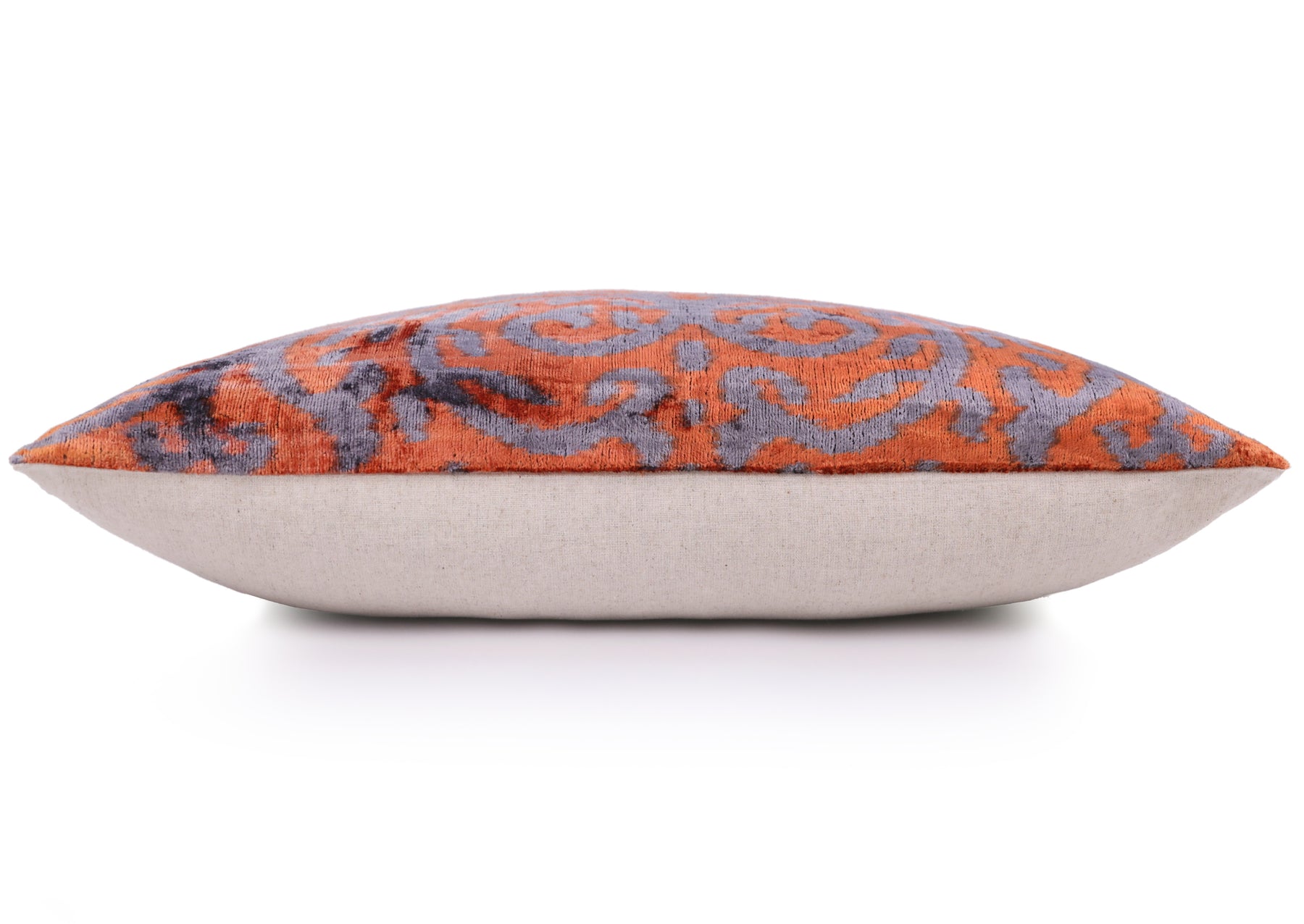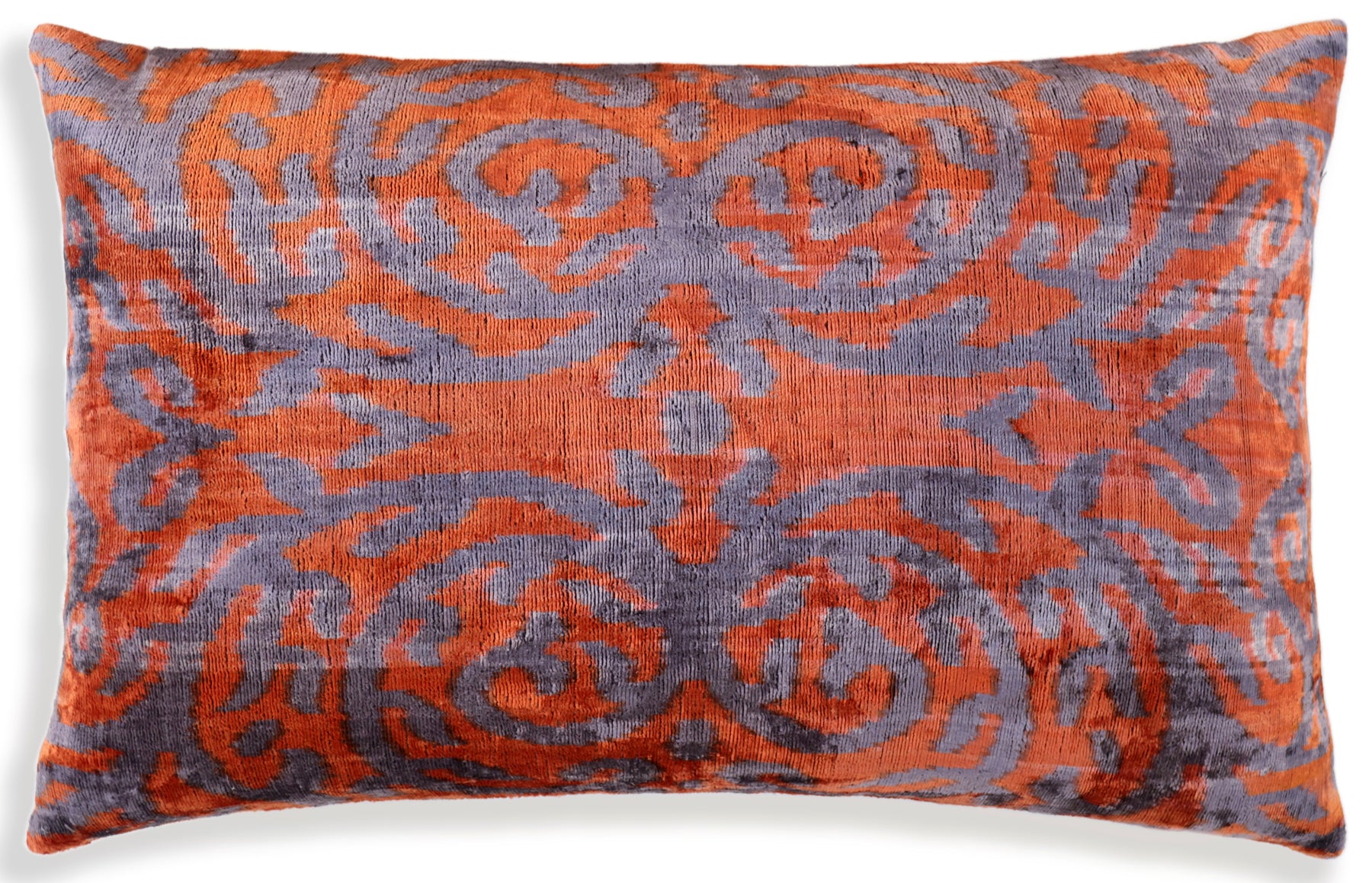 Bring warmth, elegance, and a touch of global refinement into your home with this handmade silk velvet lumbar pillow featuring a striking damask pattern in deep burnt orange and soft lavender gray.