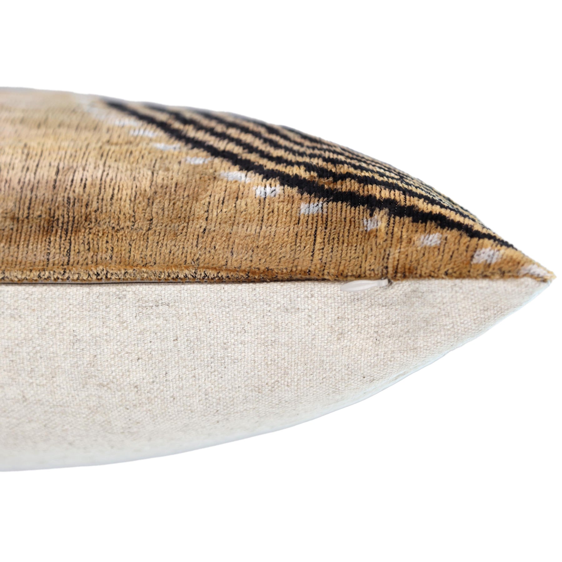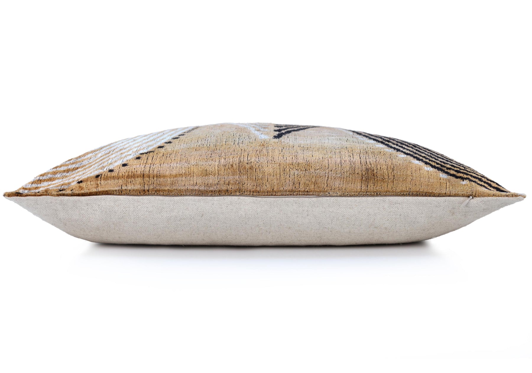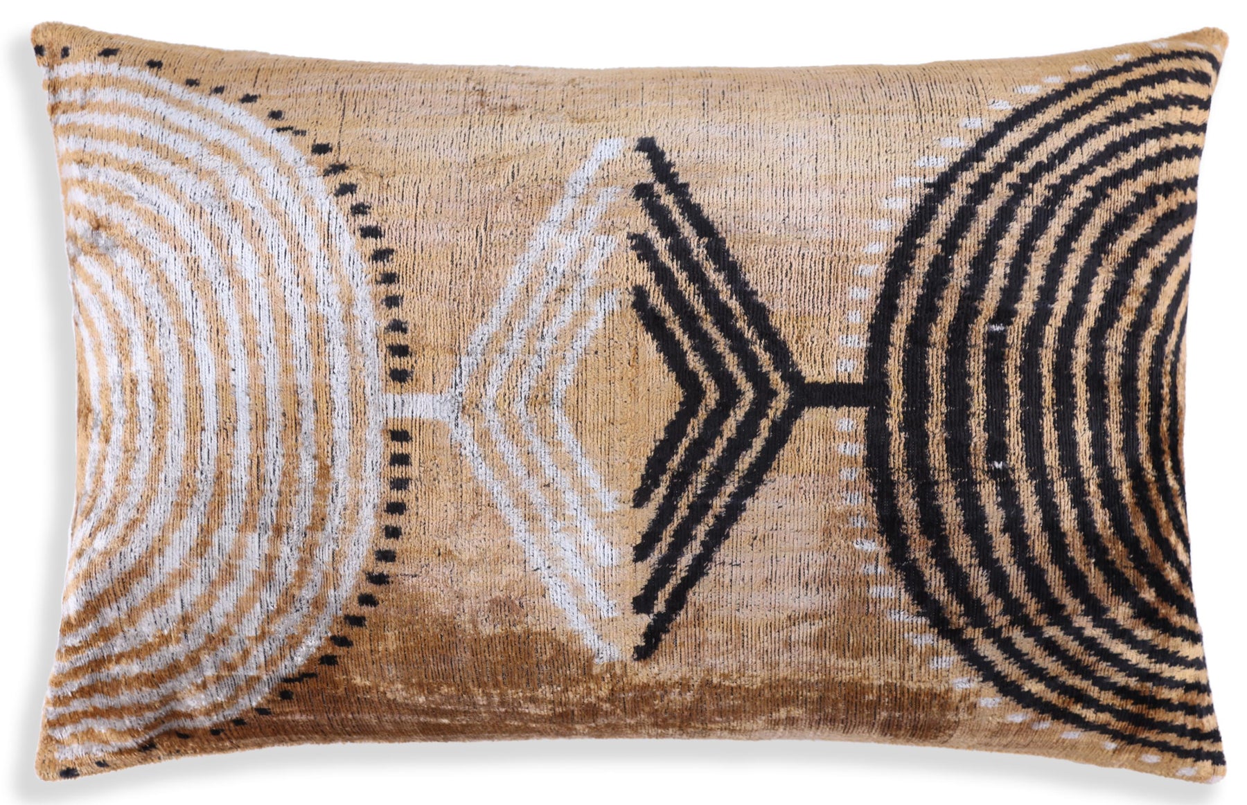 This handmade silk velvet throw pillow combines earthy elegance with bold design. Featuring tribal-inspired concentric and chevron patterns in warm tan, ivory, and black, it adds both texture and rhythm to interiors. The 16x24 inch lumbar size makes it versatile for sofas, beds, or accent chairs, while the included feather insert ensures luxury comfort. Crafted with vegetable dyes and artisan skill, it bridges natural tones with modern geometric style.