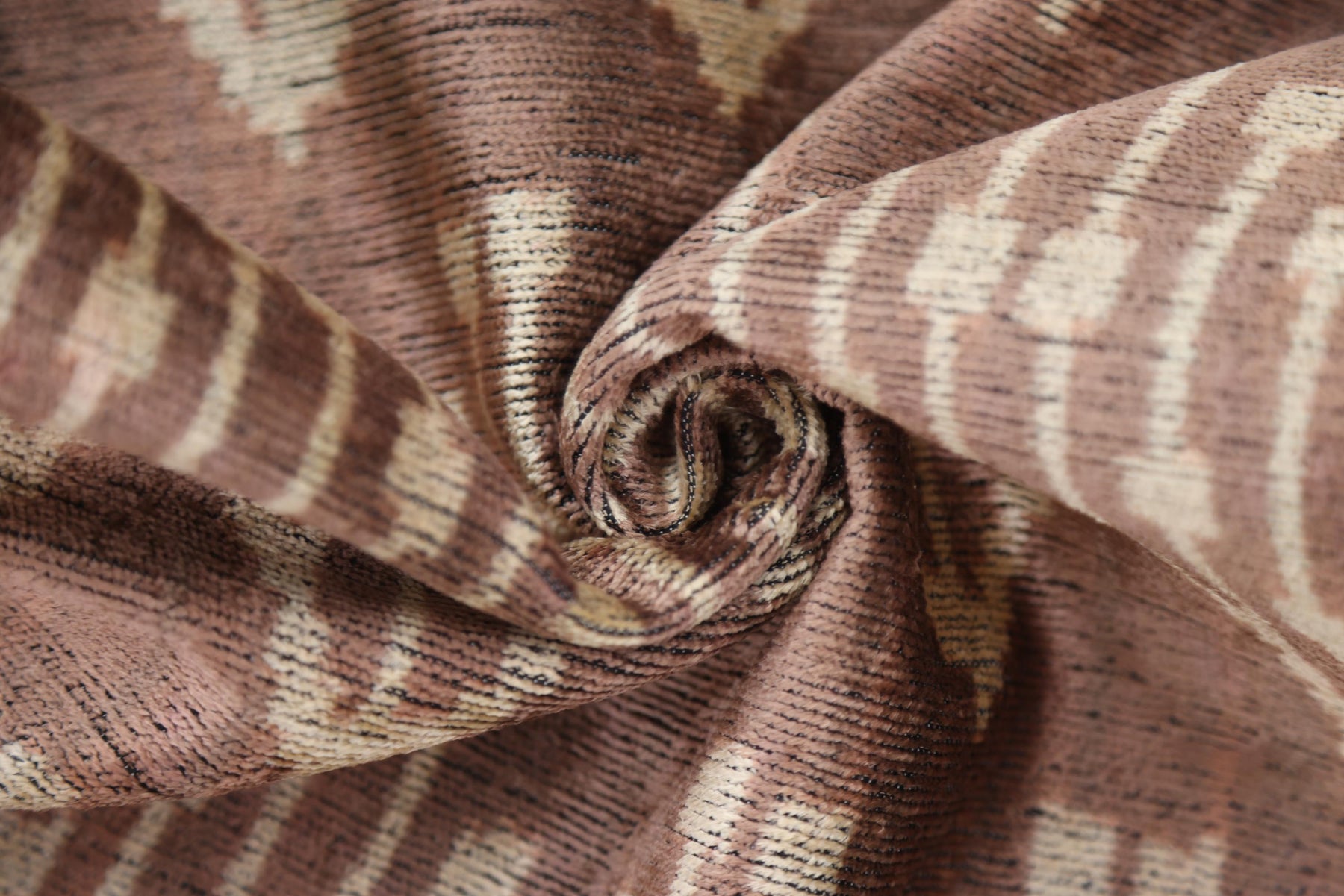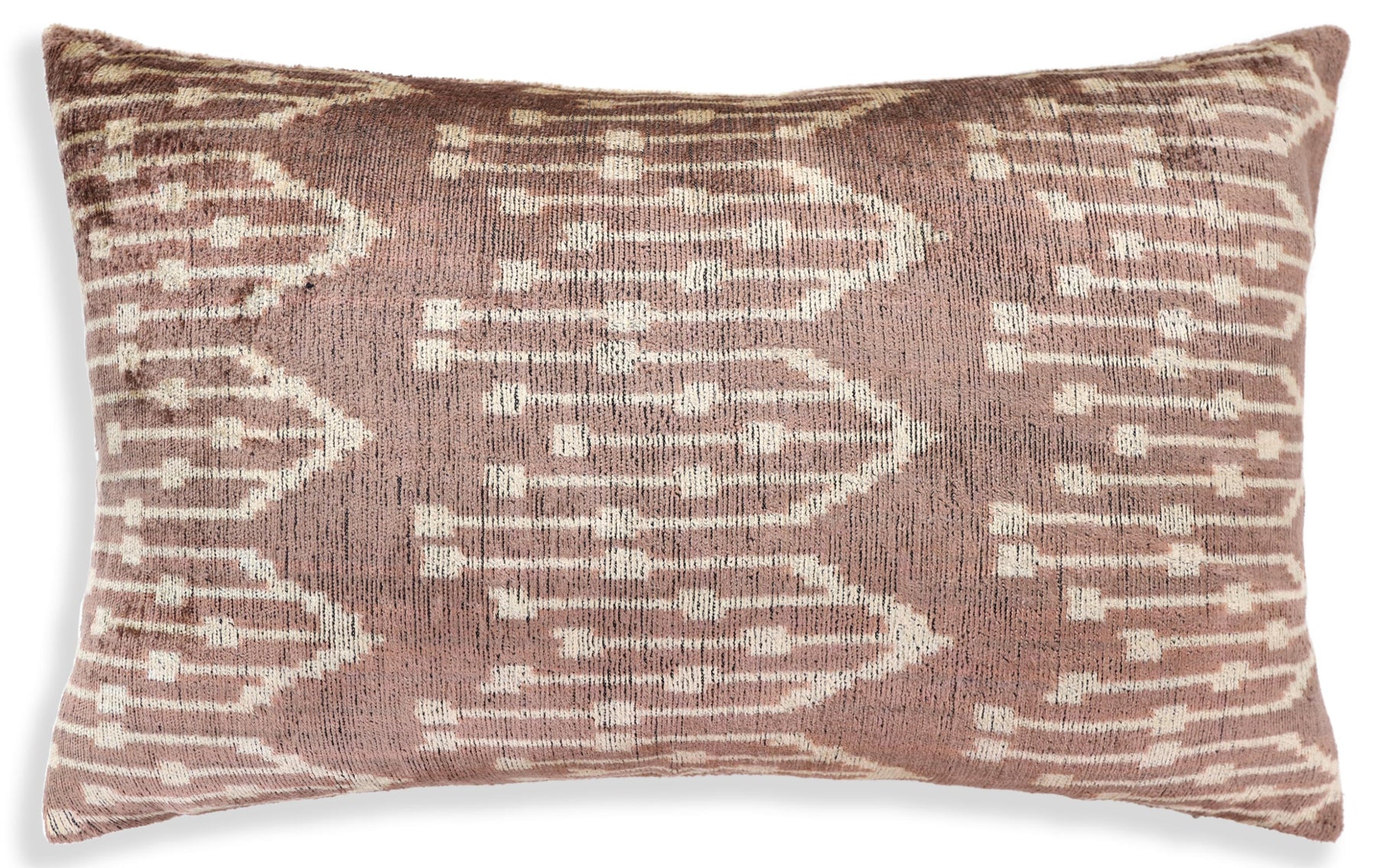 Experience the understated sophistication of this luxury silk velvet ikat pillow, crafted in a versatile taupe and blush palette. Measuring 16x24 inches, this handmade pillow is woven from silk velvet fabrics sourced in Turkey and Uzbekistan, then organically dyed with vegetable-based colors for a naturally rich finish. Sewn in our California atelier, each pillow is meticulously detailed and finished with a premium feather insert, offering both elevated comfort and refined style.