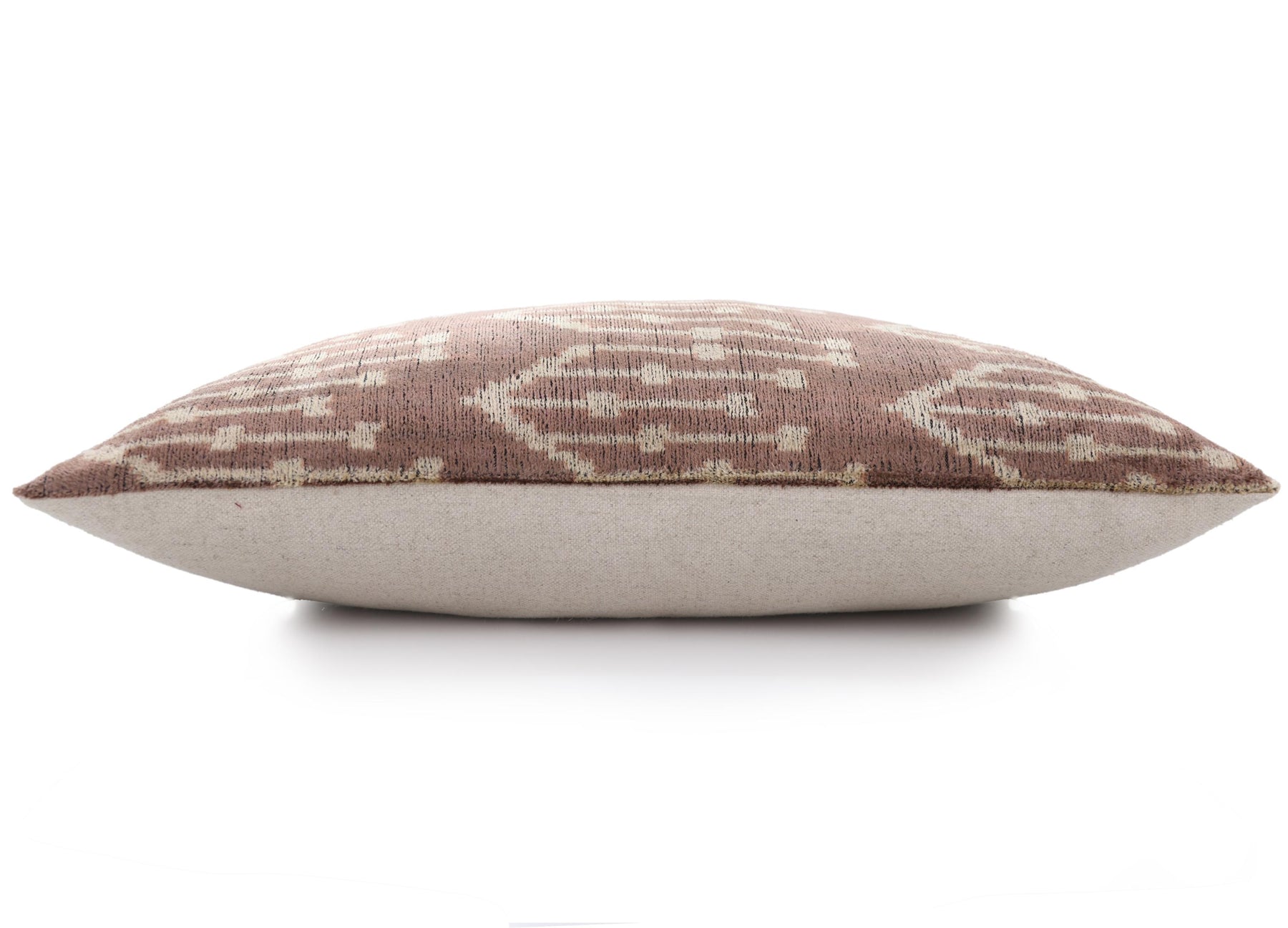 This ikat-inspired lumbar pillow is perfect for transitional, contemporary, or bohemian-chic interiors. The taupe base with blush accents creates a soft yet striking visual balance—making it an excellent pairing for cream or beige linen sofas, dark wood furniture, or even charcoal and sage-green interiors. Its geometric ikat motif lends a sense of heritage while maintaining modern appeal, making it a designer-favorite choice for living rooms, boutique lounges, or as an elegant bed accent.