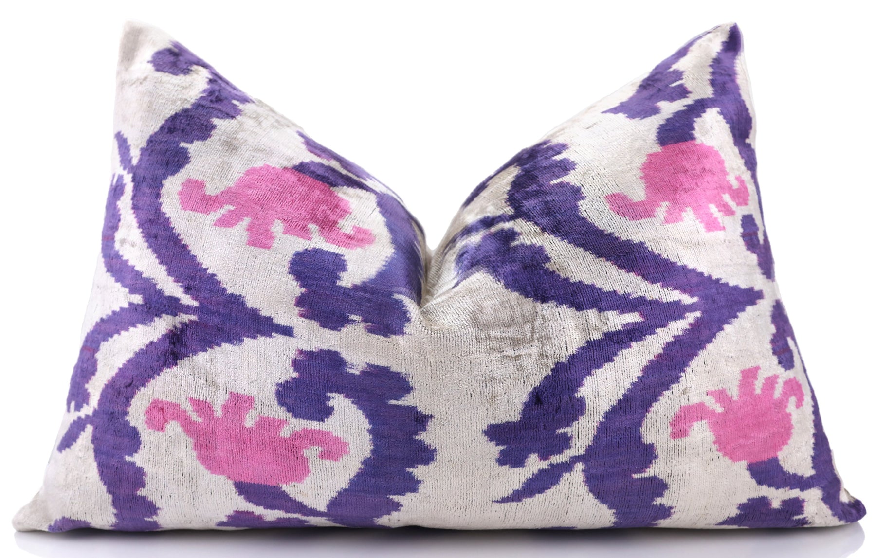 This pillow’s lavender and fuchsia palette adds a sense of light, joy, and refined femininity to any room. The hand-dyed silk velvet shimmers softly under natural light, creating depth and movement. Ideal for modern classic living rooms, boutique bedrooms, or styling a designer’s reading nook. Pair it with neutral linen sofas, gold-toned accents, and glass or marble décor for a sophisticated yet playful aesthetic.