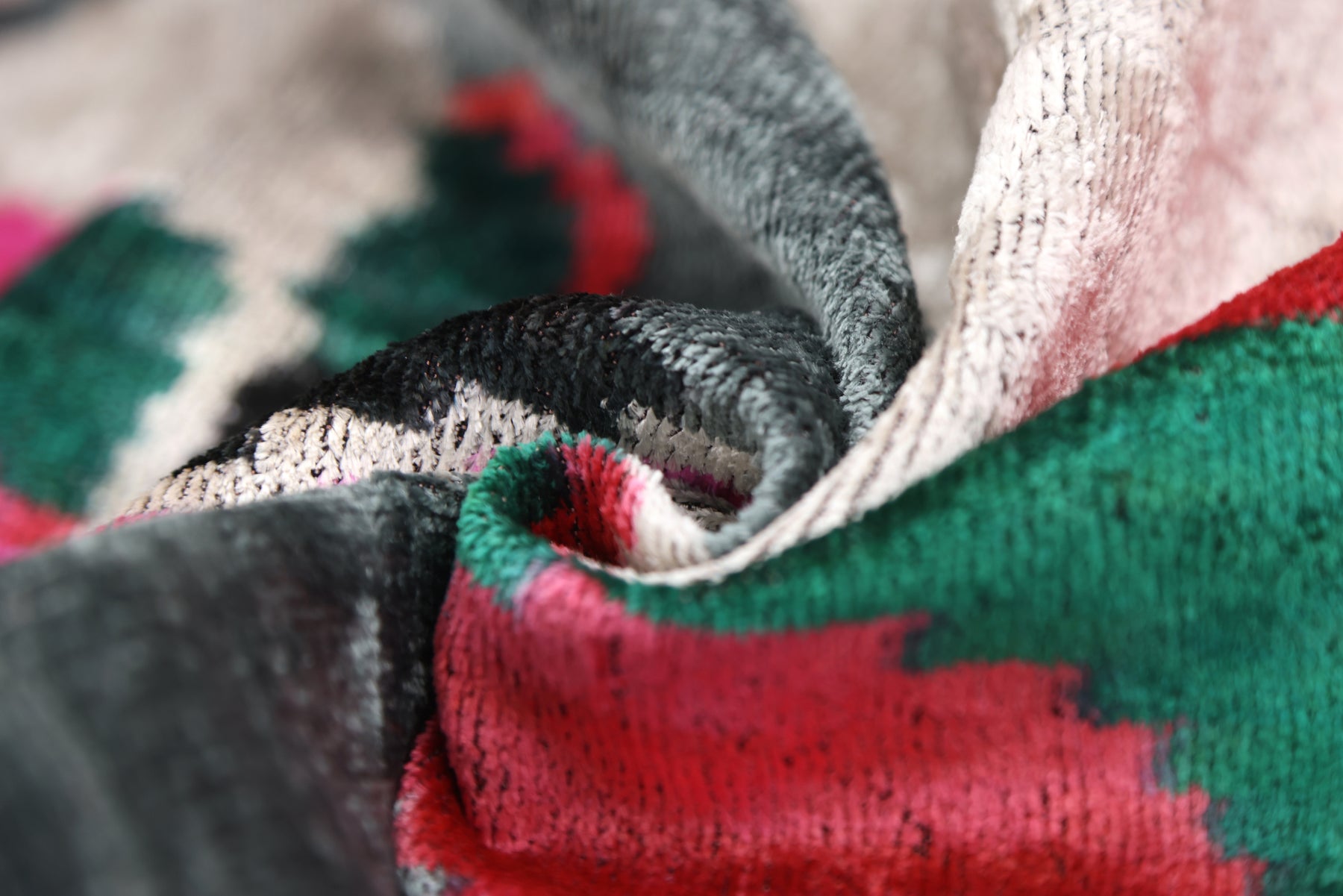 • Bold abstract ikat-inspired design in green, red, pink & gray